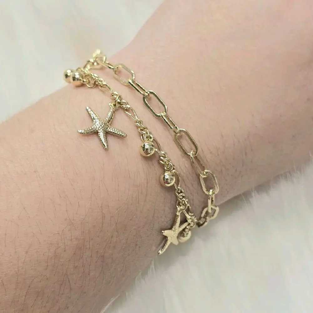 7.5-8.5 inches Pulsera doble con estrellas de mar colgando y balines. Laminado de alta calidad.