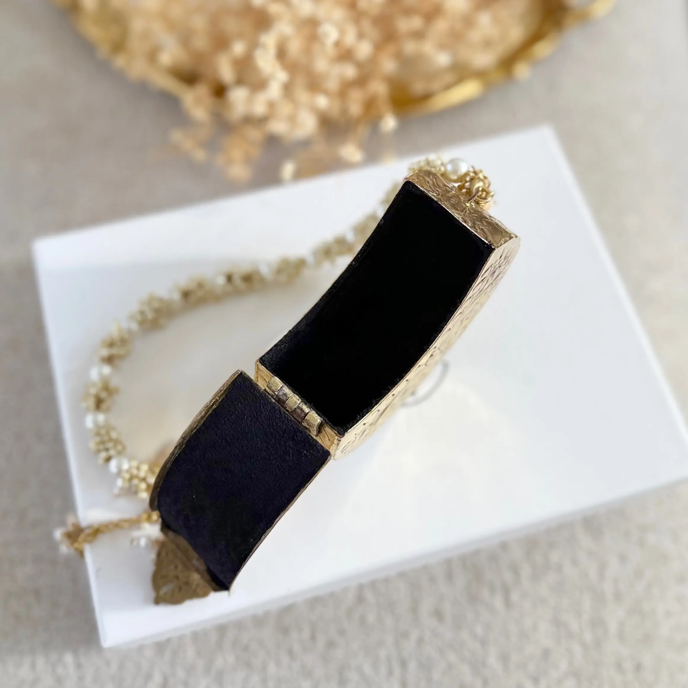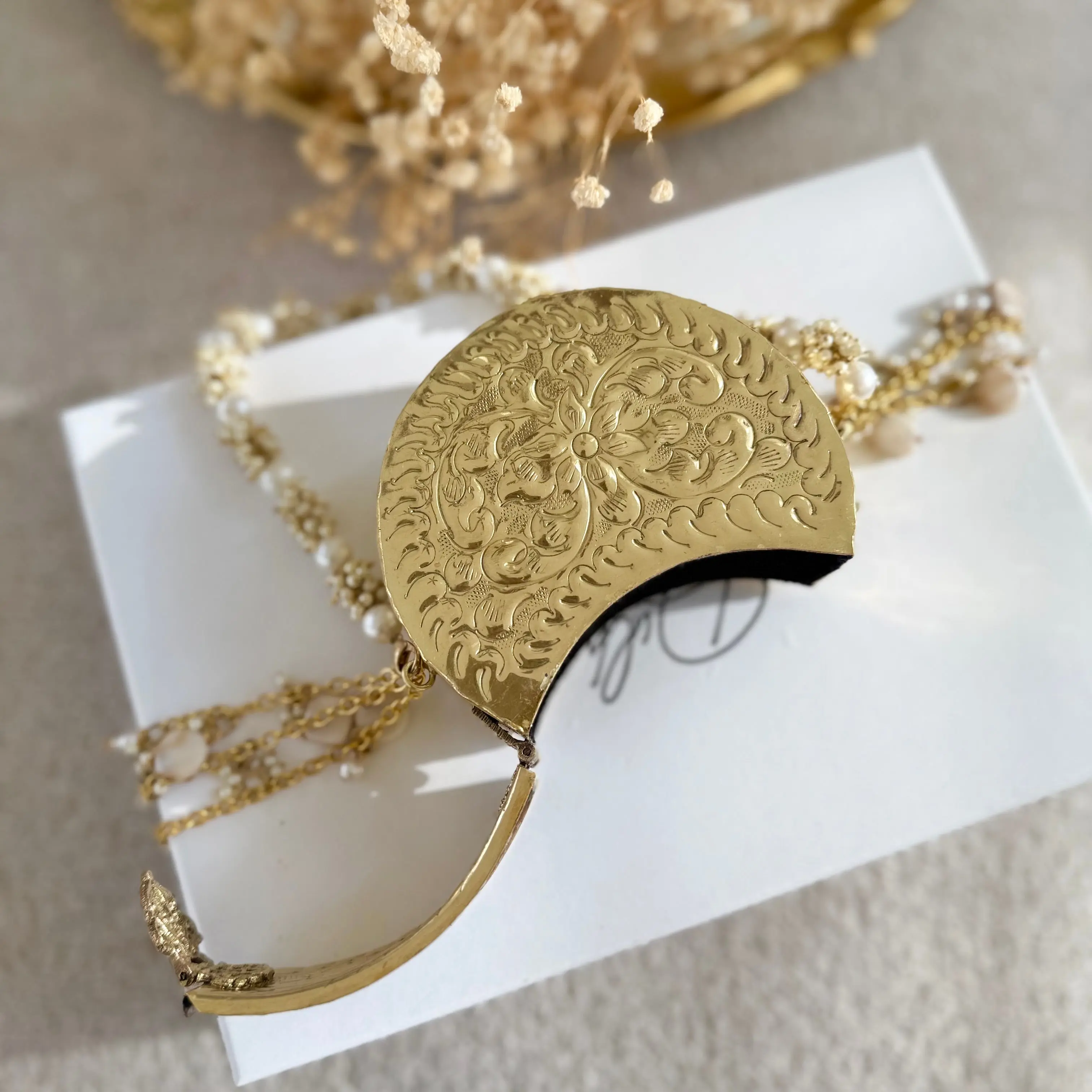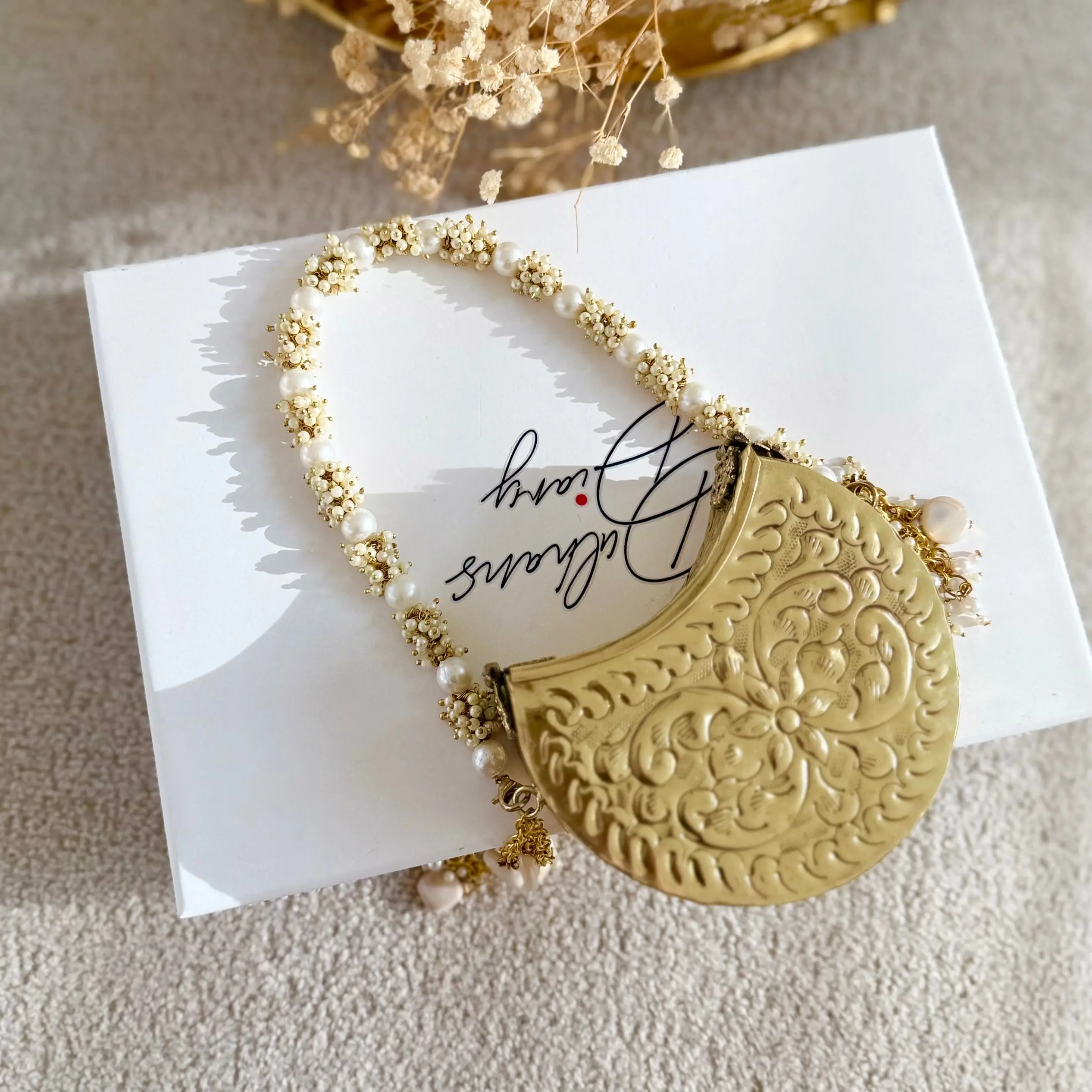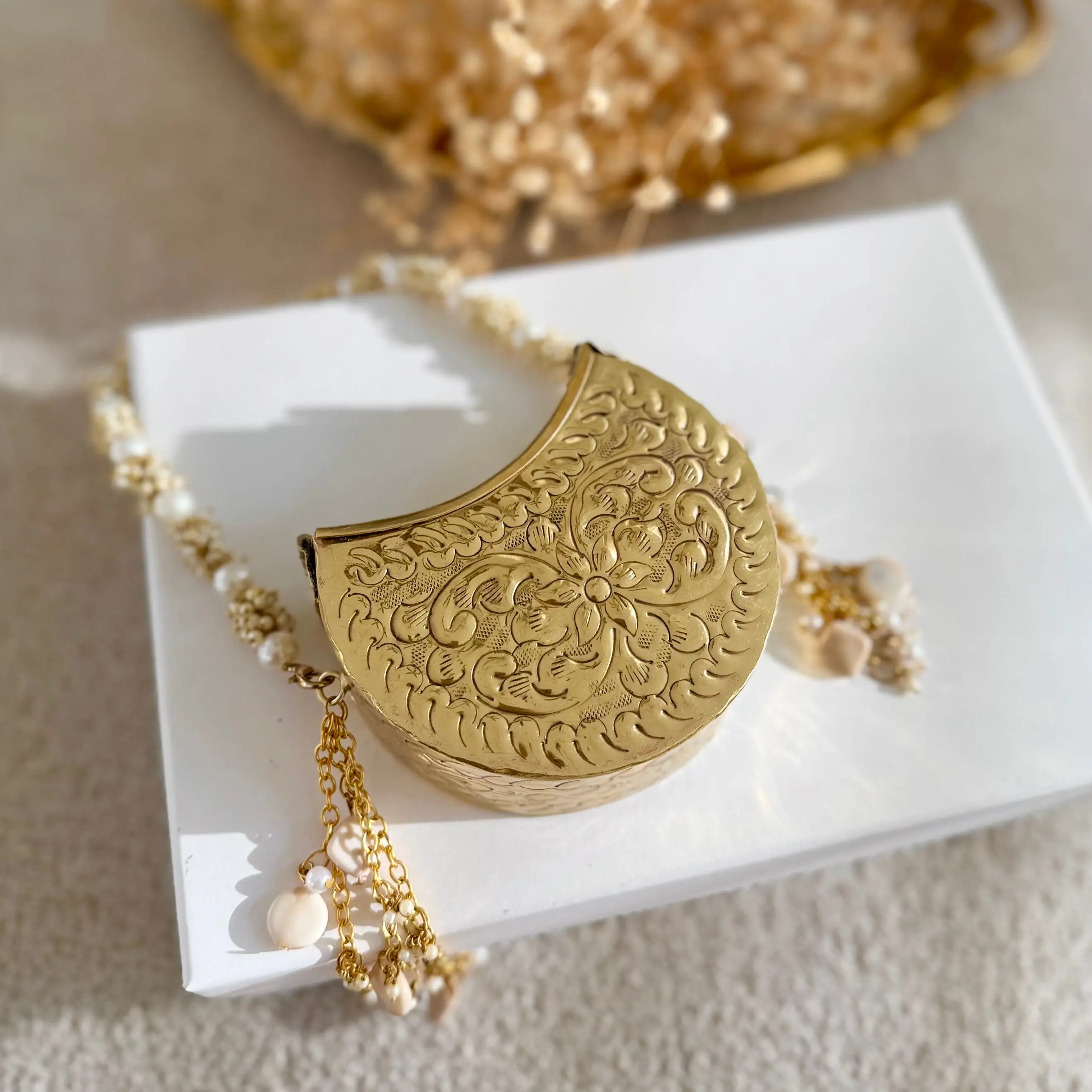 Elevate your look with this charming mini clutch, crafted from pure brass in a delicate moon shape. Features a beaded handle for a touch of elegance, with playful tassels on the sides made from beads and mother-of-pearl chips. Compact yet striking, it measures 4.5 × 3 inches, perfect for evening outings or special occasions. Each clutch comes thoughtfully packaged with a gift box and dust bag, making it a ready-to-gift treasure.