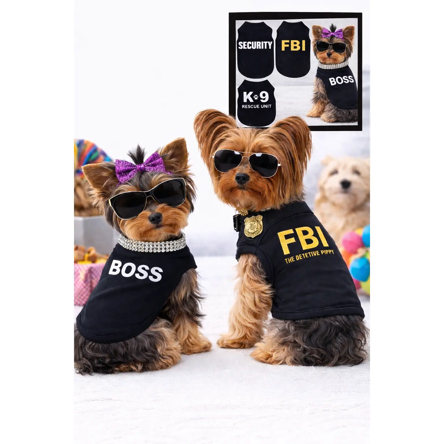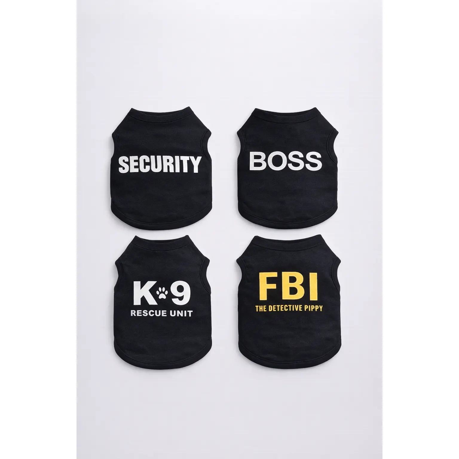 For the "personalities" in them - 4 Pieces dog shirts for small dogs dog shirts Dog Tshirt puppy clothes for small dogs yorkie clothes Chihuahua Clothes Black Security Shirt.dog shirt,dog shirts,dog shirts for small dogs,chihuahua clothes,puppy clothes,dog outfit,yorkie clothes,dog shirts for medium dogs boy,puppy clothes for small dogs girlSpecifications:Material:PolyesterColor : blackPattern : PrintingPackage includes:4x dog shirtSize information:X-Small- Chest Girth:11.81".Neck:7.48" Back Length:7.8".Suggest weight 1-3 lbs.Small- Chest Girth:14.17".Neck:9.45". Back Length:9.8".Suggest weight 3-5 lbsMedium - Chest Girth:16.54".Neck:11.02" Back Length:11.8". Suggest weight 5-8 lbs.please measure your pet and refer to the size chart before purchase.Designs:the dog shirts Classic design funny pattern printed in back [black boss fbiK9unit Security] Phrase letter design adds charm to your doggy round neck sleeveless. Cool dog Clothes.