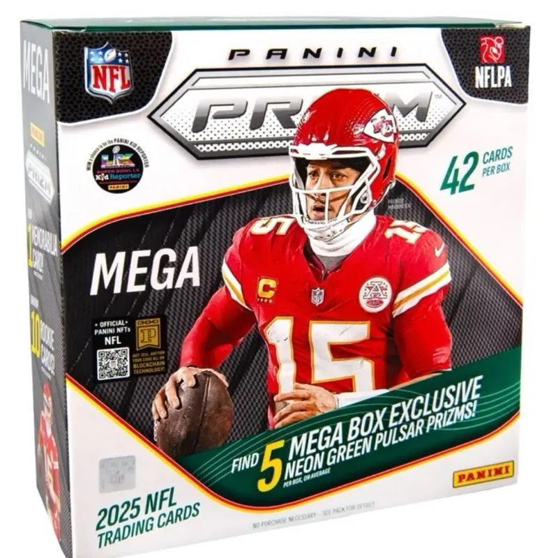 2 Panini Prizm Mega Box 2025 NFL Trading Cards with 5 Mega Box Exclusive Neon Green Pulsar Prizm Cards