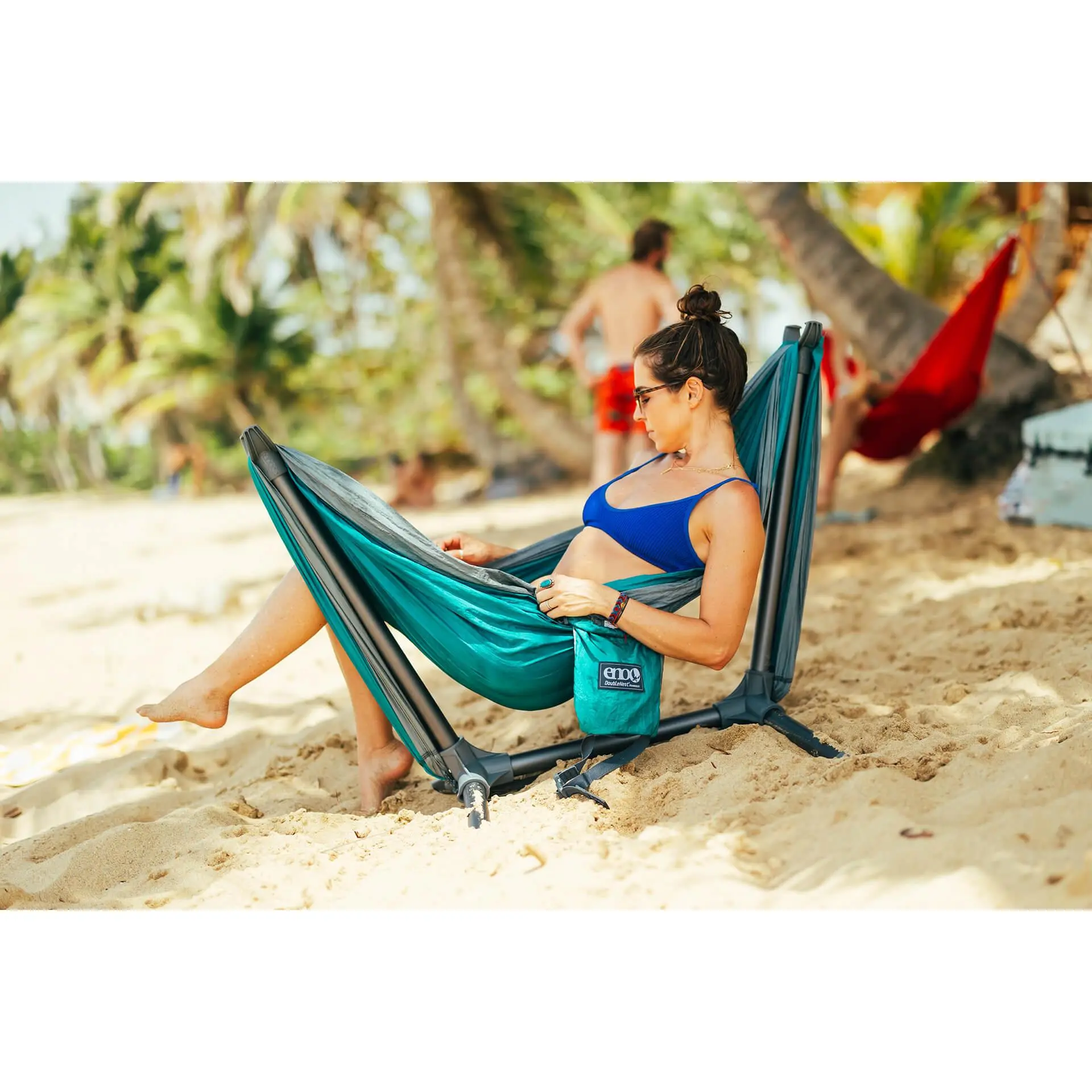 Portable,Universally compatible with gathered-end hammocks up to 10',Pinch-free,no-tools-needed assembly,Anodized aluminum frame,Includes custom carrying bag,Designed for use indoors or outside