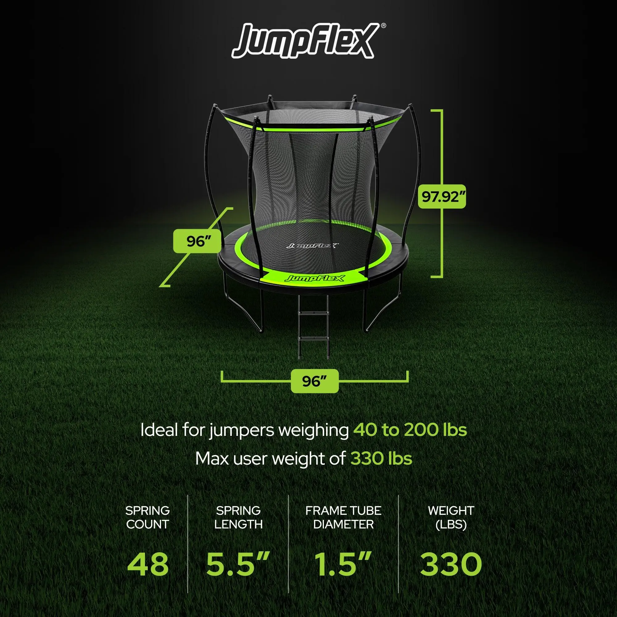 Get outdoors with your kids and have some soaring fun on this one-of-a-kind Jumpflex FLEX 8-Foot Trampoline.Thanks to the durable structure and ground-breaking spring mechanism, beginner bouncers can experience the excitement of soaring through the air with unmatched excitement. The high-tensile extension springs give bouncers smooth, deep bouncing and maximum airtime. Experience the unbeatable strength of the 360-degree durable polyester enclosure net, securely fastened to the jumping mat, enveloping the entire trampoline. Equipped with a revolutionary SafeSeal system, children can jump with boundless enthusiasm, free from falling out. For added convenience and safety, a ladder is included for easy exit and entry.This kids trampoline features metal frame parts that undergo a rigorous 6-layer rust-proofing and durability process, ensuring their resilience in any weather. Assembly has never been easier with its ingenious design, free from bolts and welds. The trampoline for adults and kids is ideal for people weighing between 40 to 200 pounds but can handle a maximum user weight of 330 pounds.Great for growing families, you can start jumping into great fun and exercise with your loved ones with the FLEX 8-Foot Trampoline from Jumpflex.