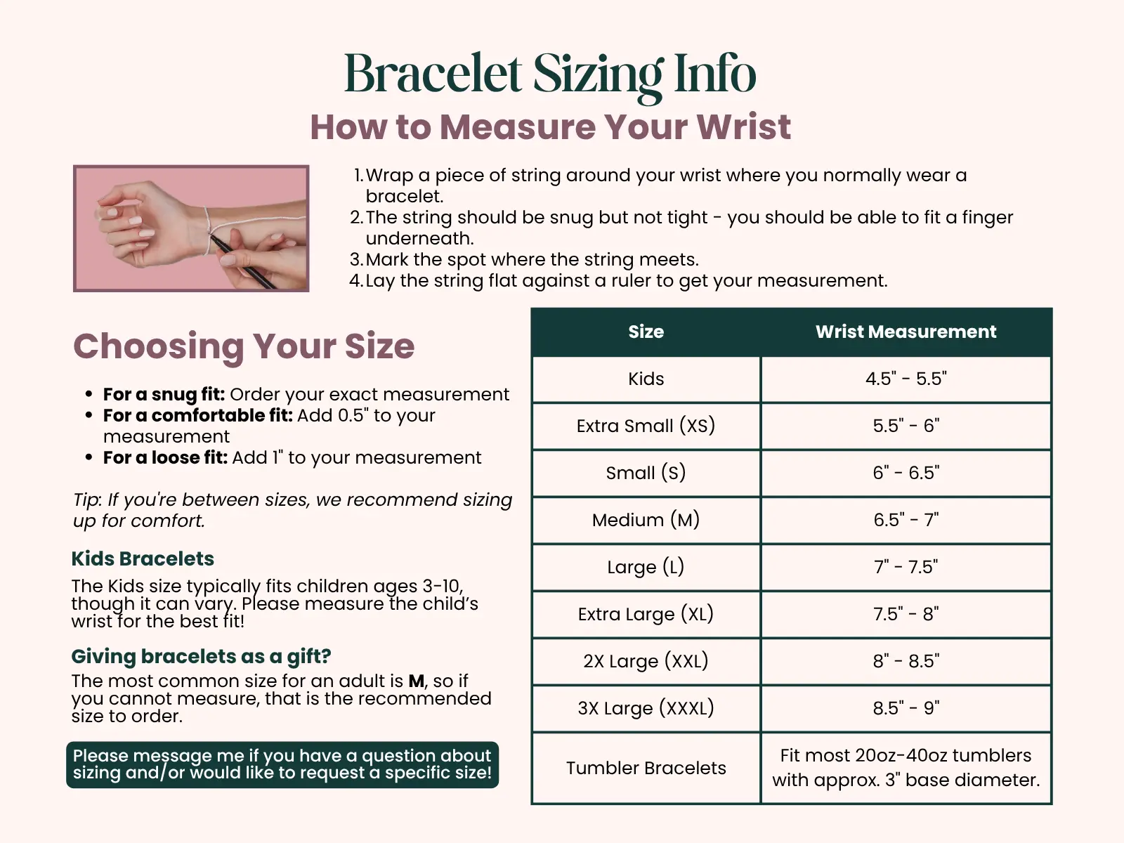 • The Kids size typically fits children ages 3–10, though wrist sizes vary — please measure for the best fit!