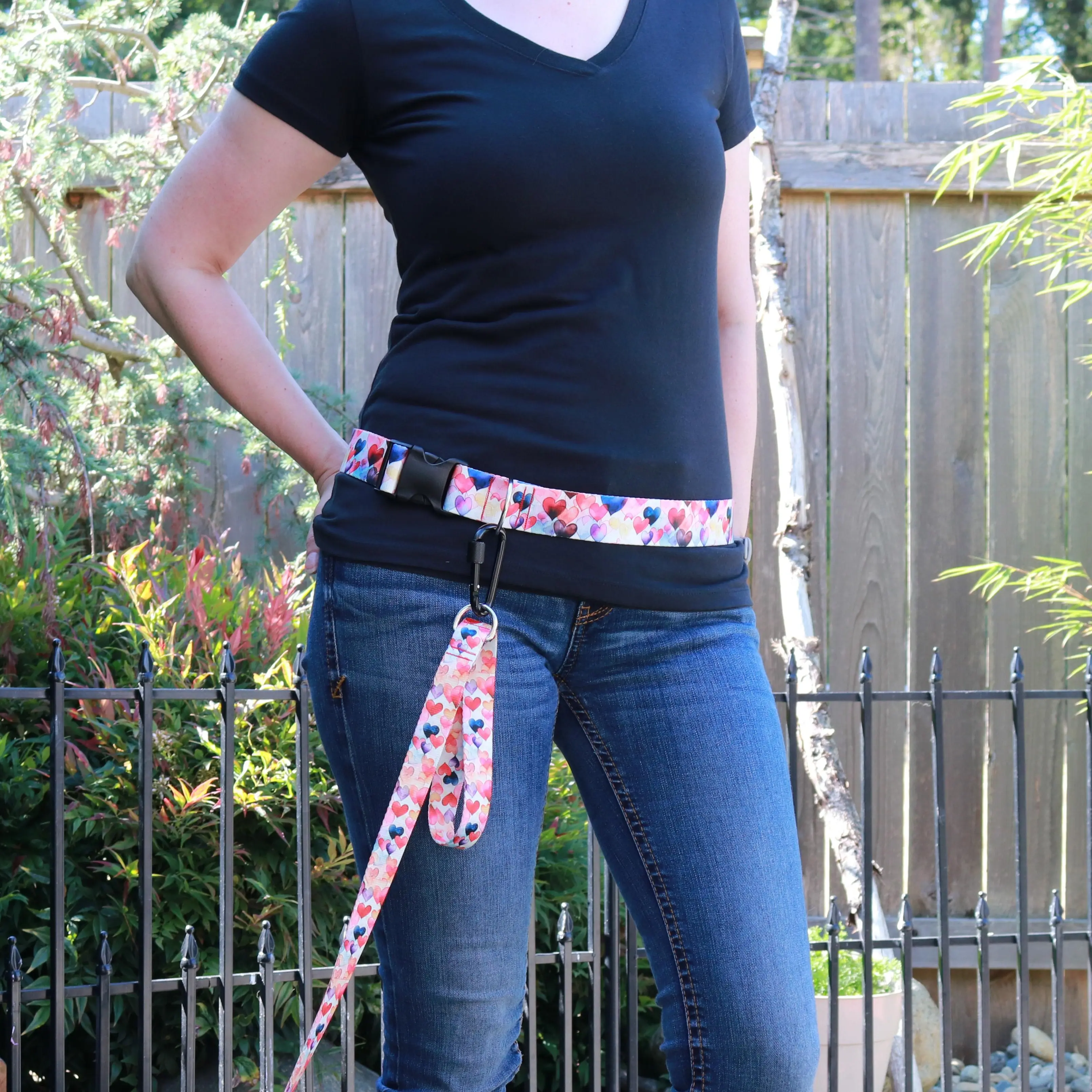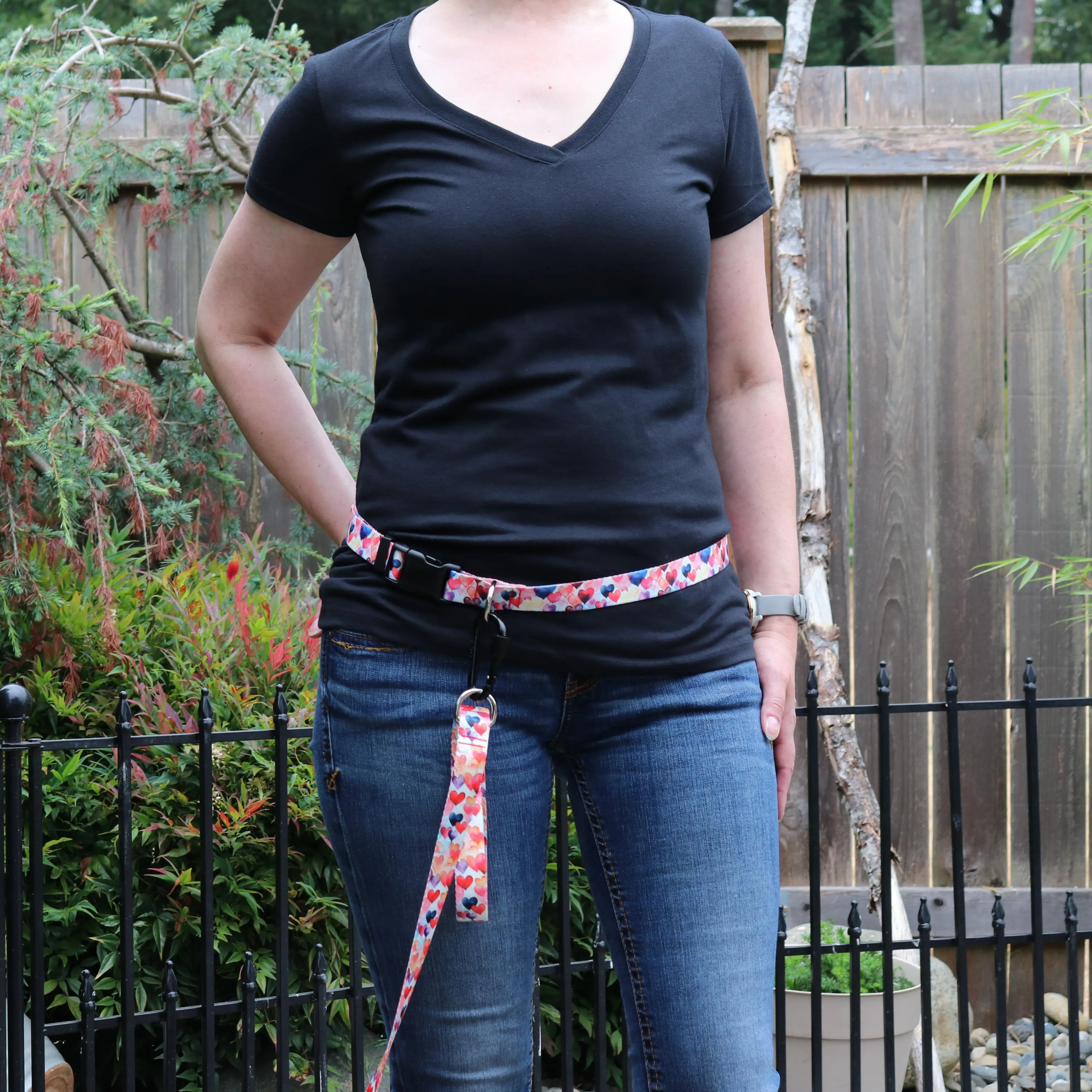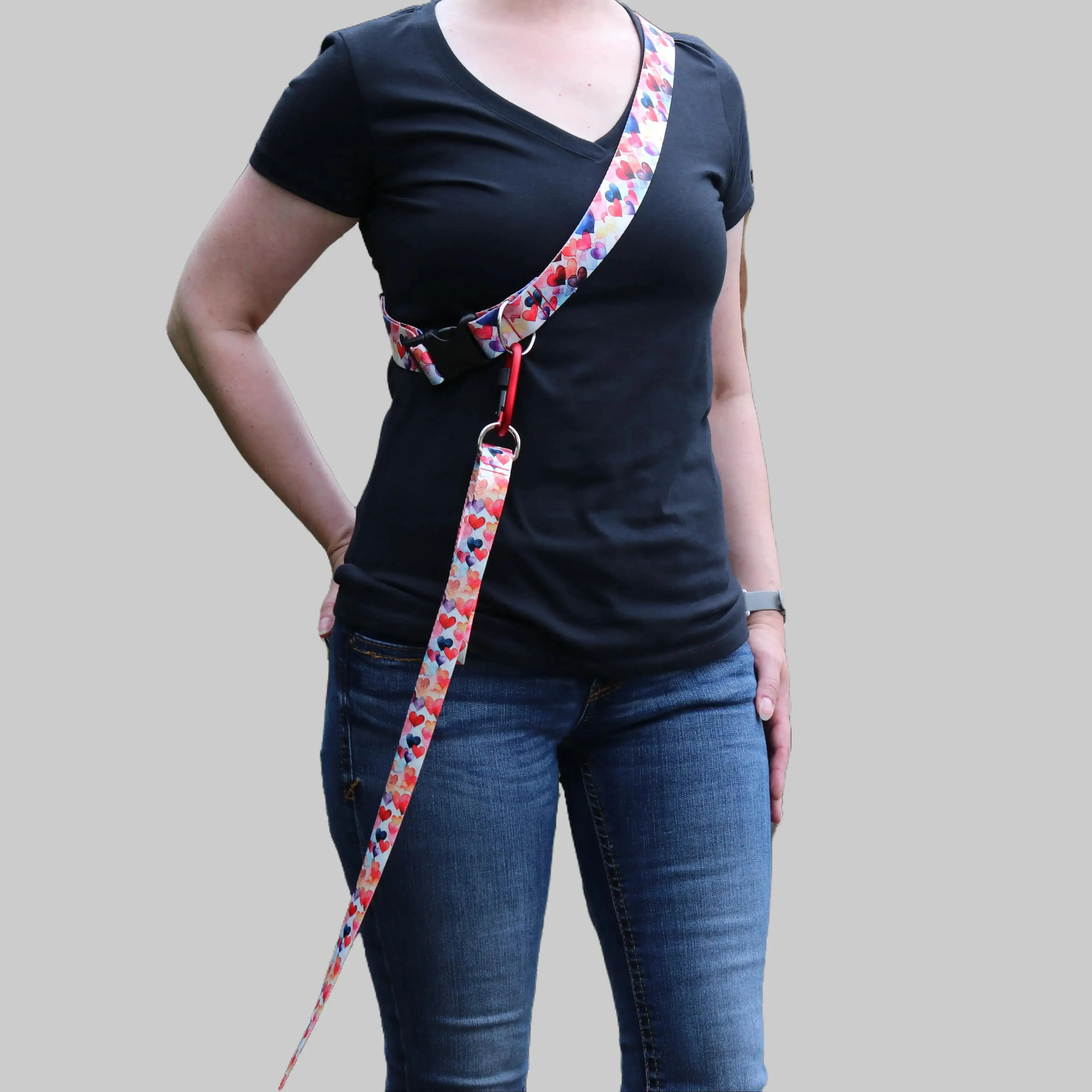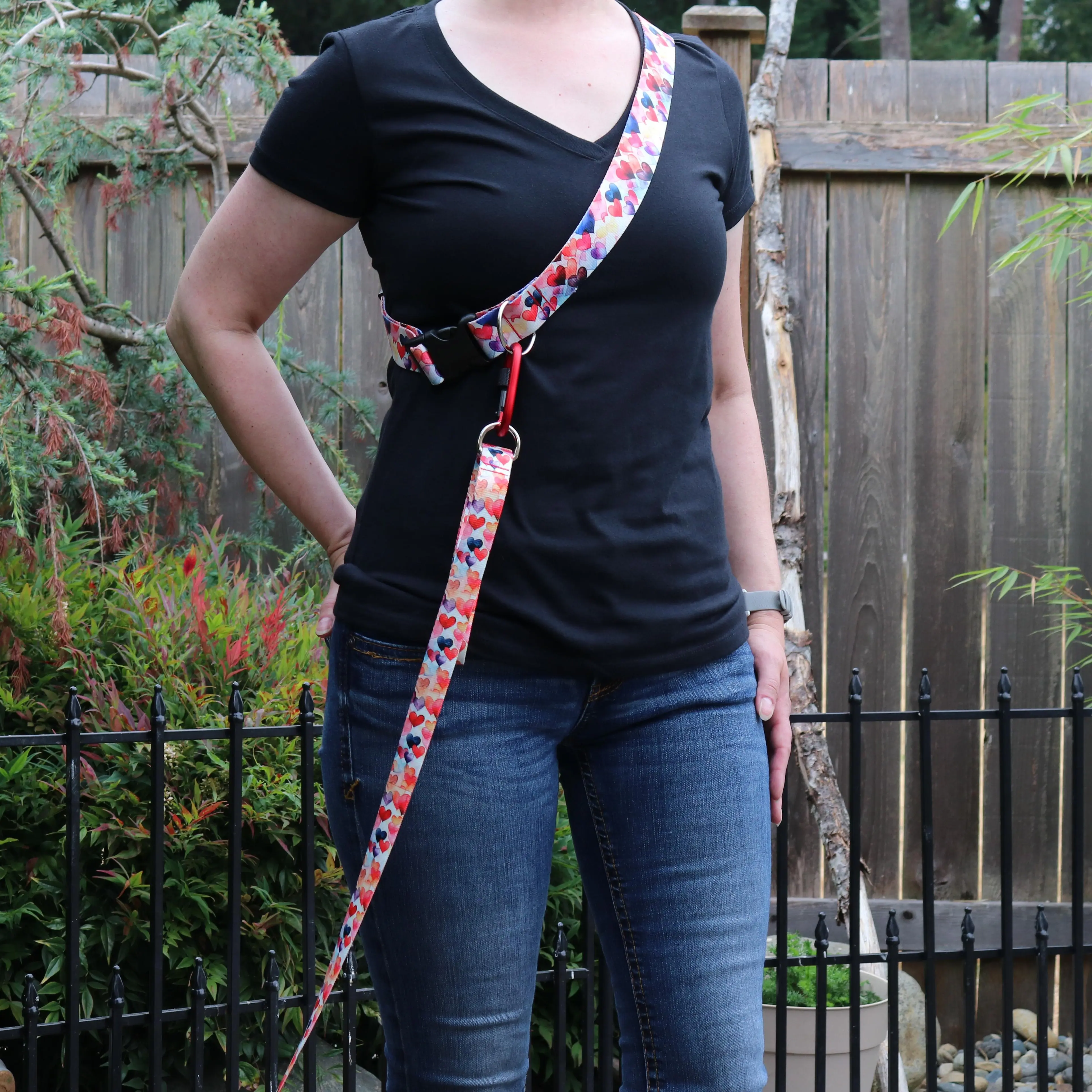 Walks just got easier — and more stylish! The Dancing Hearts crossbody/belt leash attachment lets you walk your dog hands-free by wearing it at your waist or crossbody. Adjustable up to 58 inches, it fits comfortably while you stay active. Featuring a durable carabiner rated to hold 110 lbs, it securely attaches to your dog’s leash with a screw locking mechanism for added safety. Choose between two widths—1.5 inches for large and extra-large dogs or 1 inch for medium and smaller breeds. Built with durable, reliable hardware and comfortable, adjustable straps, these crossbody/belts give you the freedom to keep your hands free while keeping your pup close. Crafted from the same strong material as your dog's leash, it ensures lasting reliability. Our Dancing Hearts hands-free crossbody/belt leash attachments are designed to pair perfectly with the Dancing Hearts collar and leash collection, so you and your pup can step out in coordinated style. Whether you’re jogging, sipping coffee, or juggling errands, our hands-free crossbody/belts keep life practical, colorful, and connected. Leash sold separately.