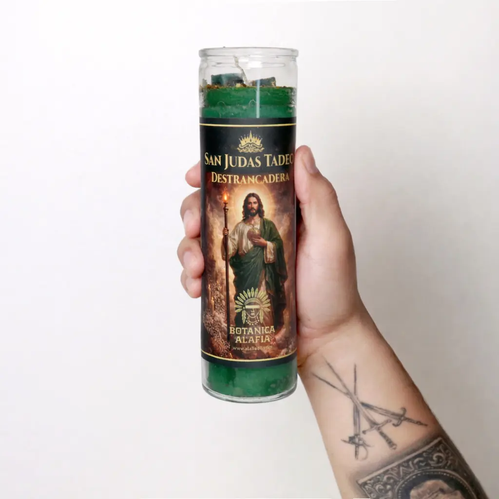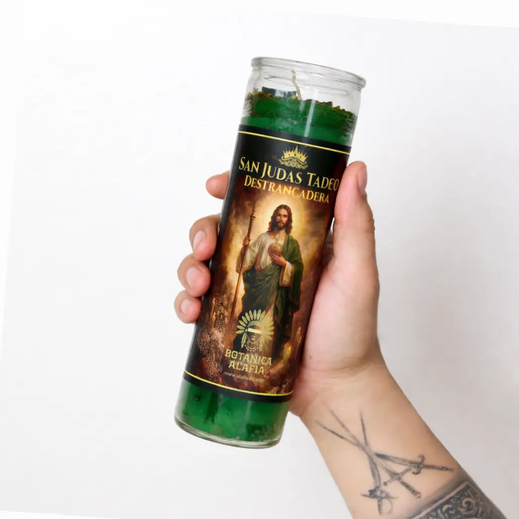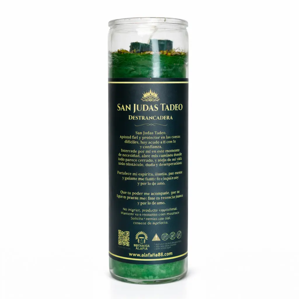 This handcrafted 8-inch green soy wax candle features a classic San Judas Tadeo design with a clean and elegant finish, created to complement decorative spaces and home environments.