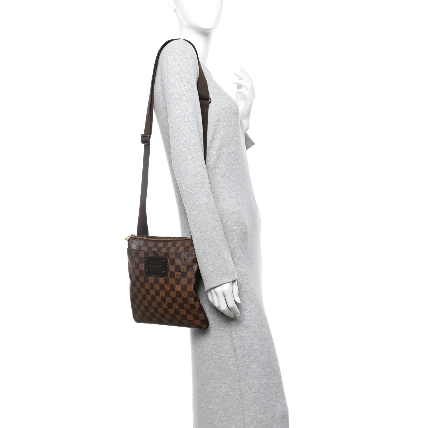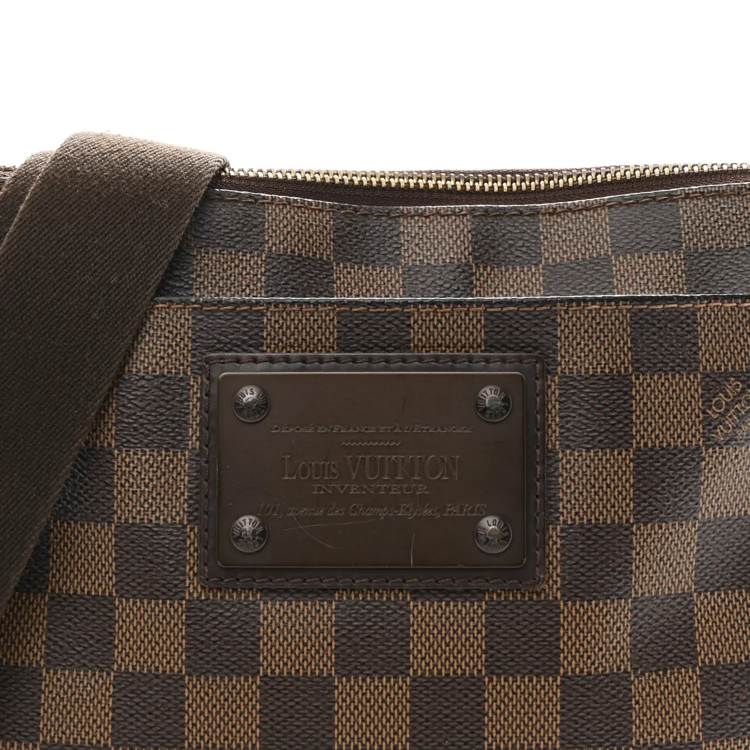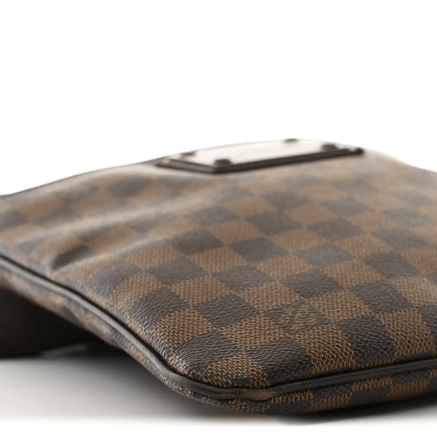 This is an authentic LOUIS VUITTON Damier Ebene Brooklyn Flat Pochette. This messenger bag is crafted of Louis Vuitton's signature Damier check canvas. The bag features an adjustable brown canvas crossbody shoulder strap, gold hardware, and a facing patch pocket. The top zipper opens to a brown fabric interior with a patch pocket.