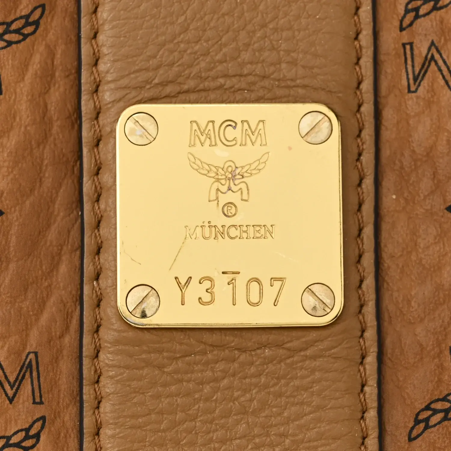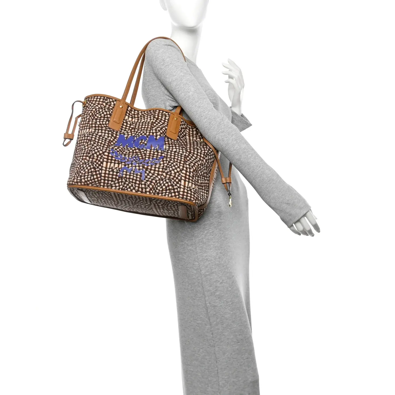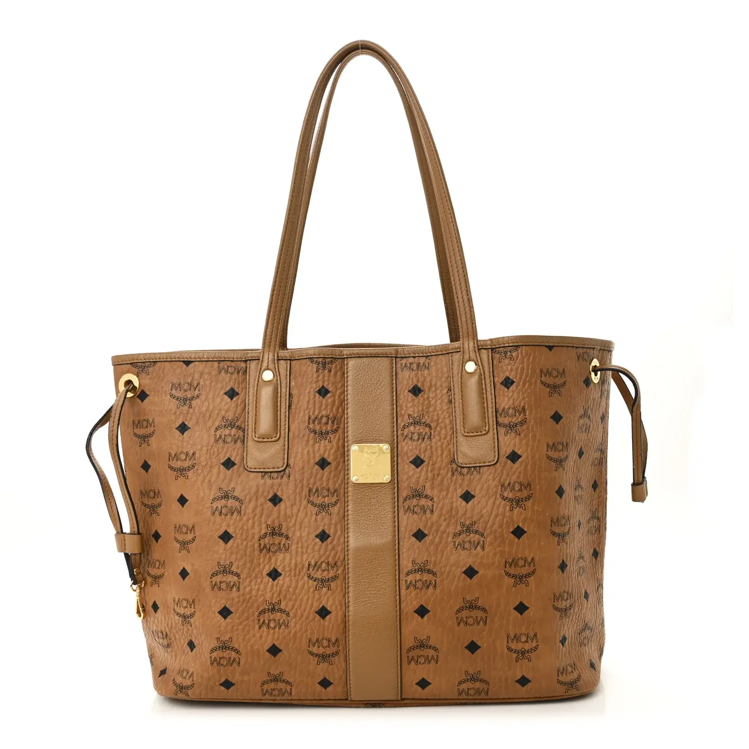 This is an authentic MCM Visetos Medium Liz Reversible Shopper Tote in Cognac. This reversible tote is finely crafted of classic MCM monogram on visetos coated canvas in golden brown. The bag features matching brown leather trim, shoulder straps, and side cinch cords with polished gold hardware. The top is open to a brown checkered canvas fabric interior with a prominent purple MCM logo and a removable pouch.