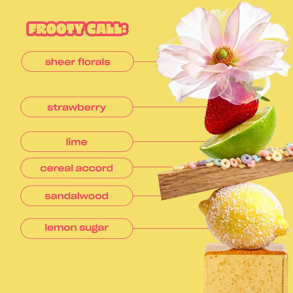 Frooty Call: lemon sugar • strawberry • lime • cereal accord • sheer florals • sandalwood