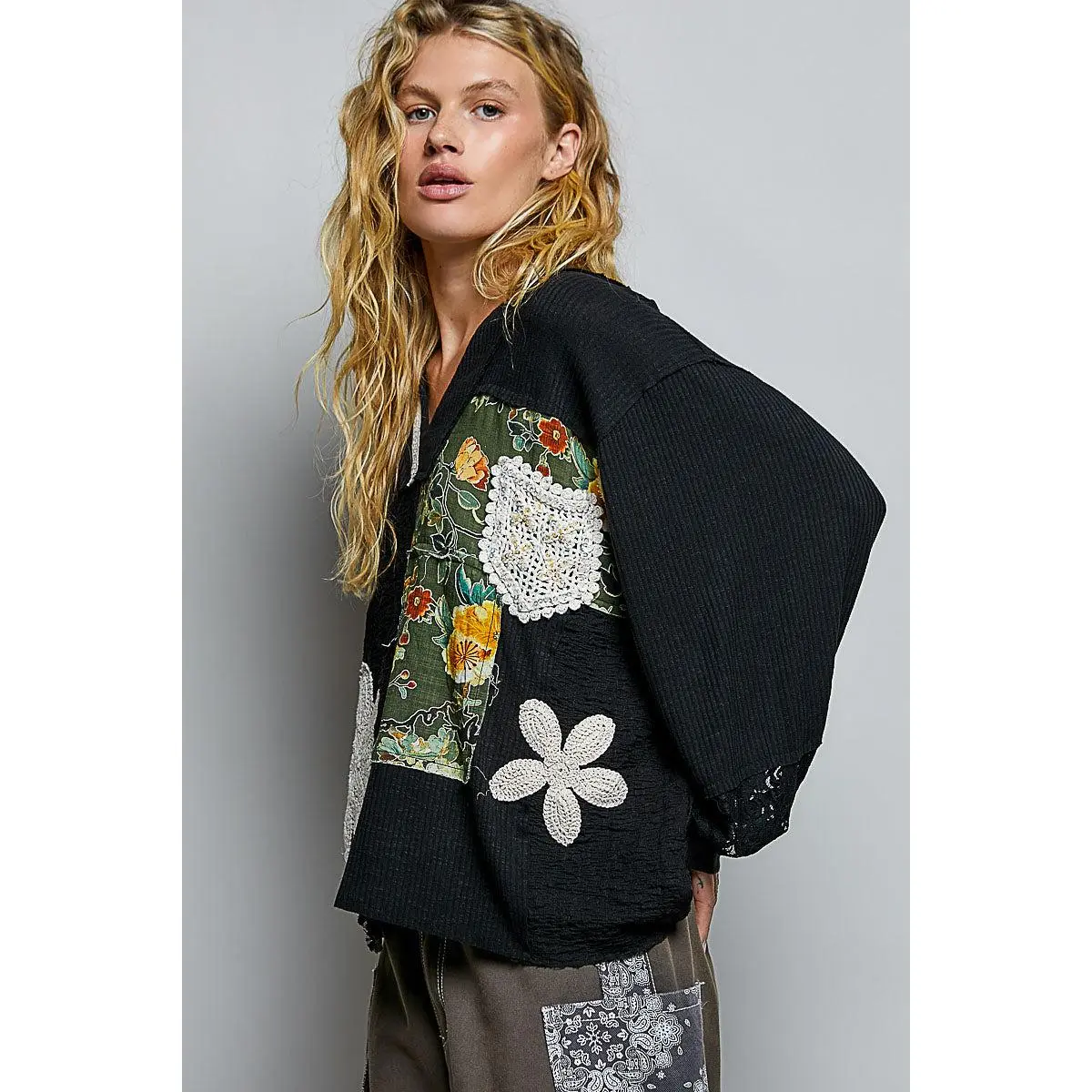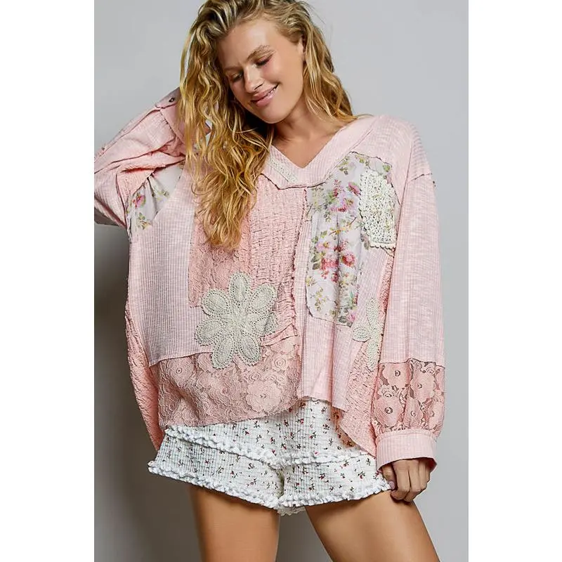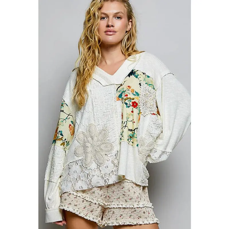 Effortlessly romantic, this V-neck long sleeve top combines relaxed comfort with thoughtful design details. Soft ribbed fabric drapes beautifully while floral printed contrast panels and delicate crochet patches add texture and visual interest. Perfect for layering or wearing solo, it's a versatile piece that brings understated elegance to any wardrobe.