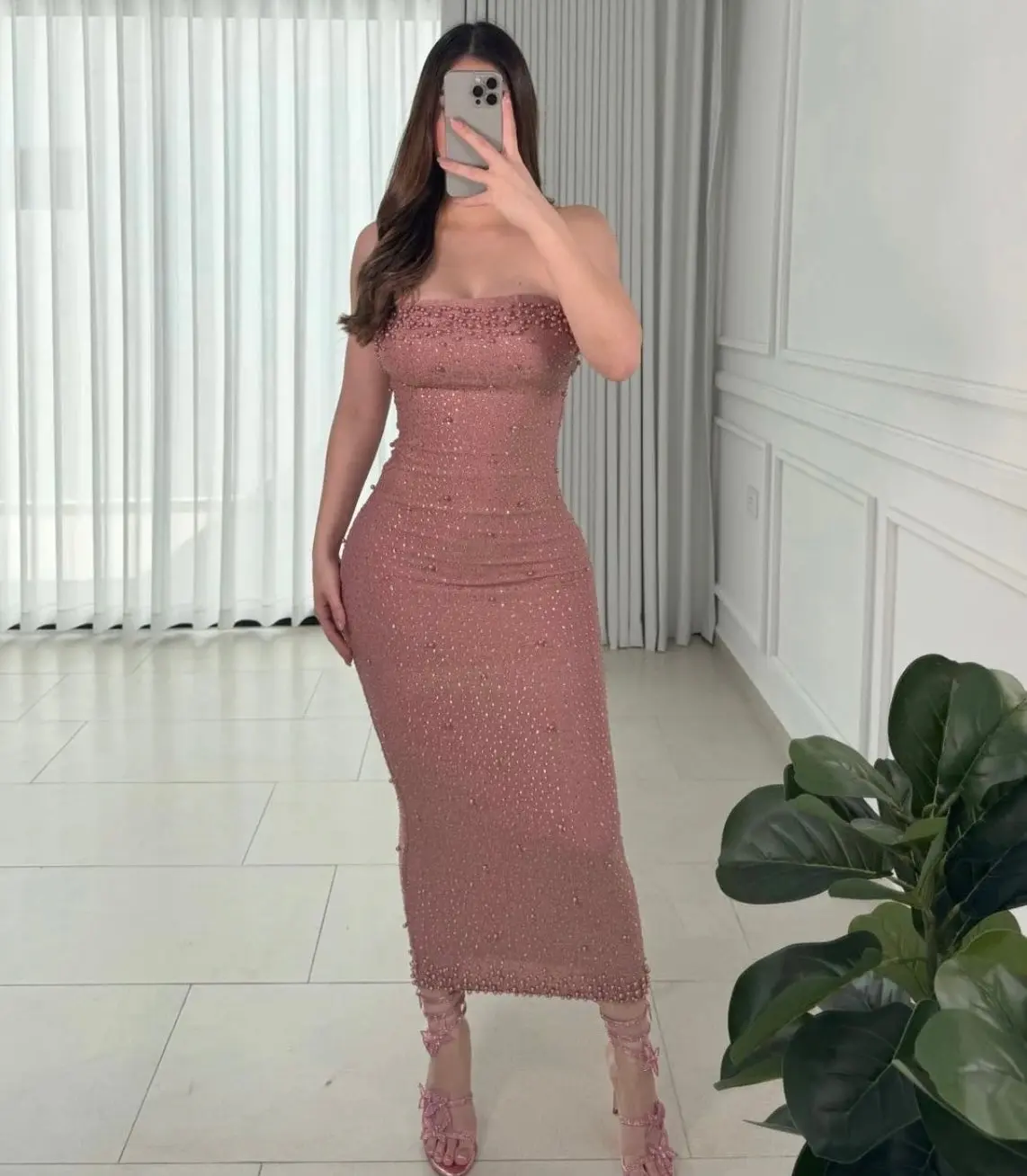 Elevate your style with our Glamour Pearl & Rhinestone Midi Dress, a true best-seller that exudes sophistication and sparkle.