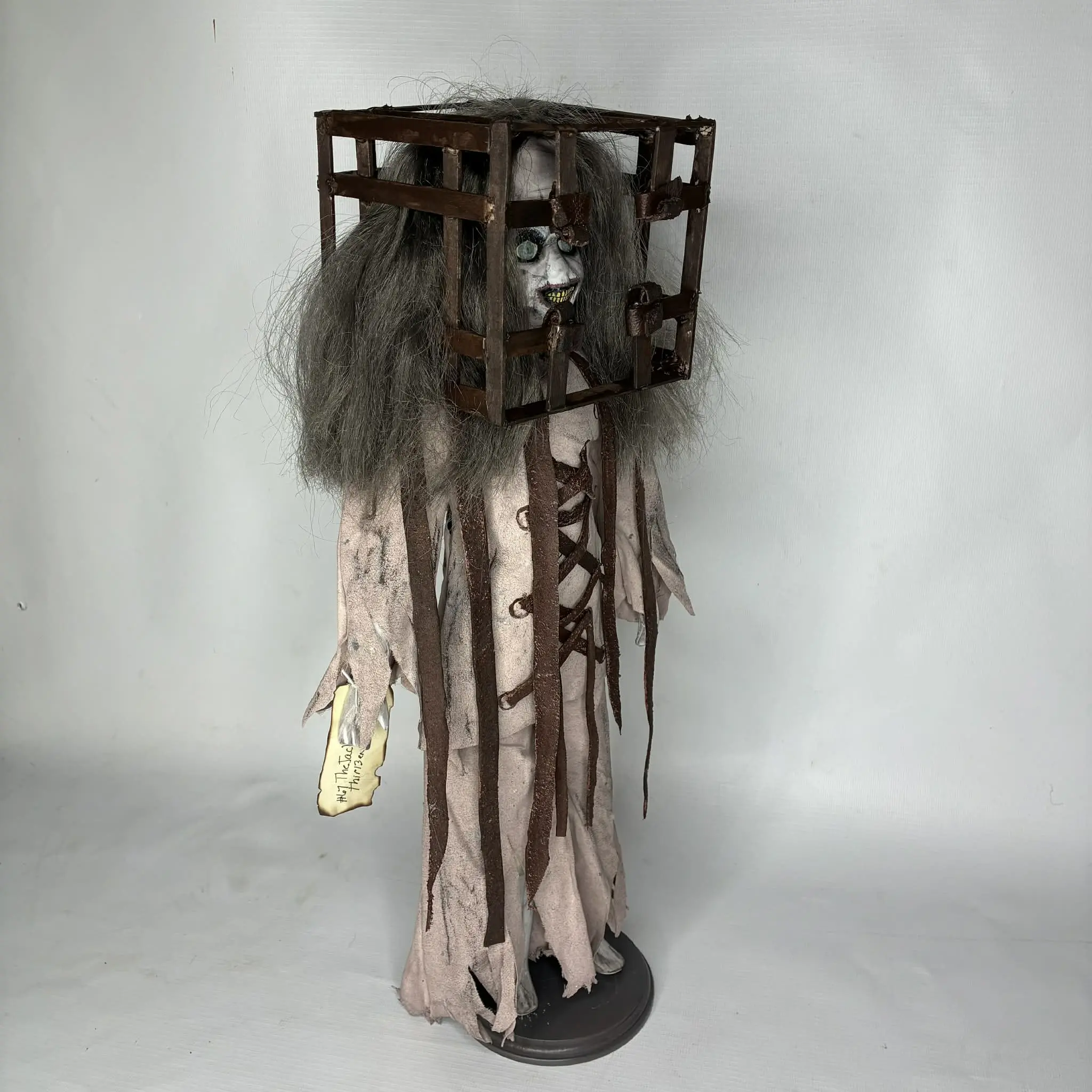 #67 The Jackal Thir13en Ghosts Handmade Character Doll by Erika’s Emporium is a one-of-a-kind 17.5" completely handmade dark art piece inspired by the terrifying asylum ghost, featuring a cage-style head and straight jacket with distressed details and a wild, unhinged look true to the character; handcrafted using recycled materials, each doll is completely unique and comes tagged, numbered, and signed, making it perfect for horror collectors and fans of the film.