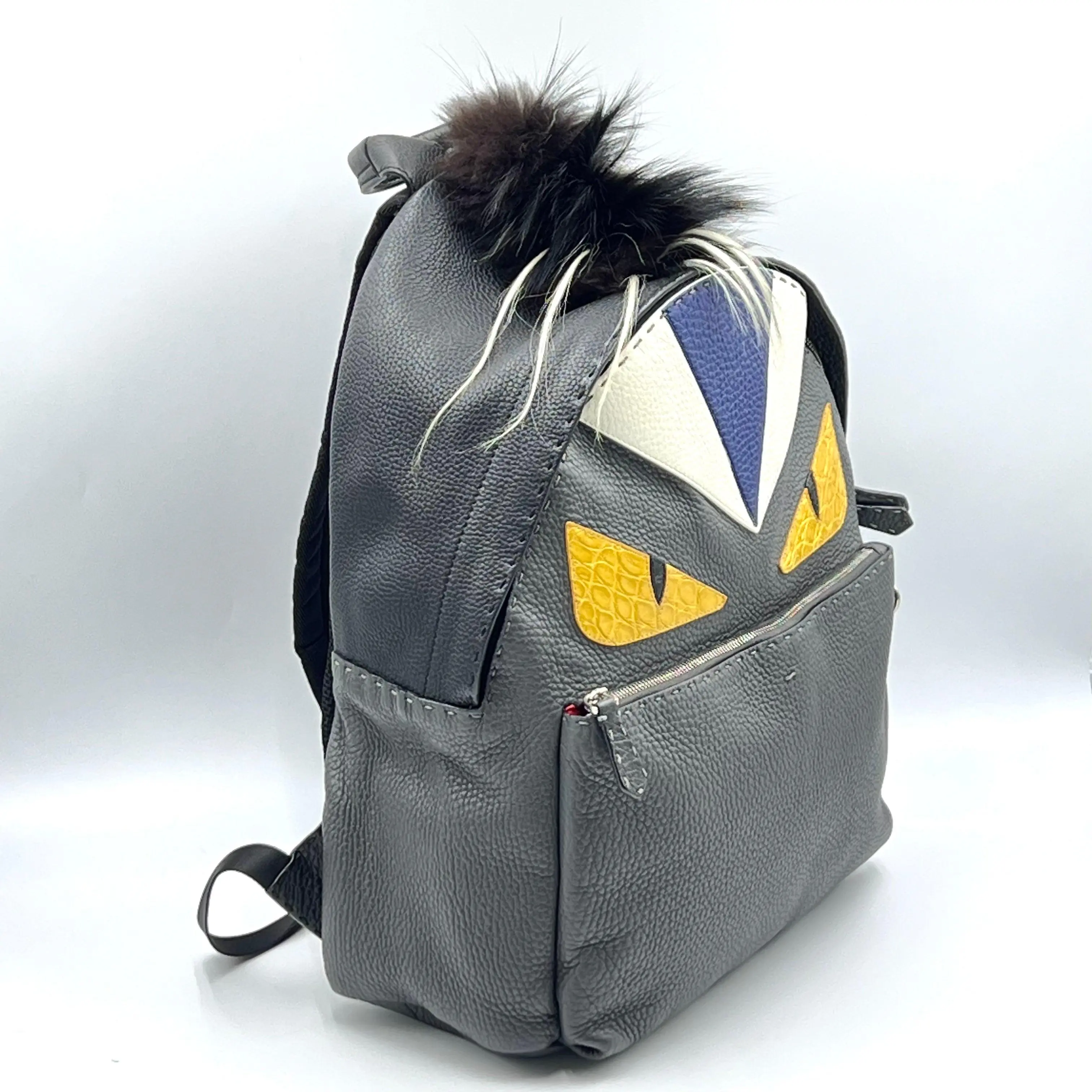 This backpack features a striking monster design with bold yellow eyes and a mohawk fur crest. The gray and black color scheme adds a modern twist. Perfect for those who love a playful yet stylish accessory.
