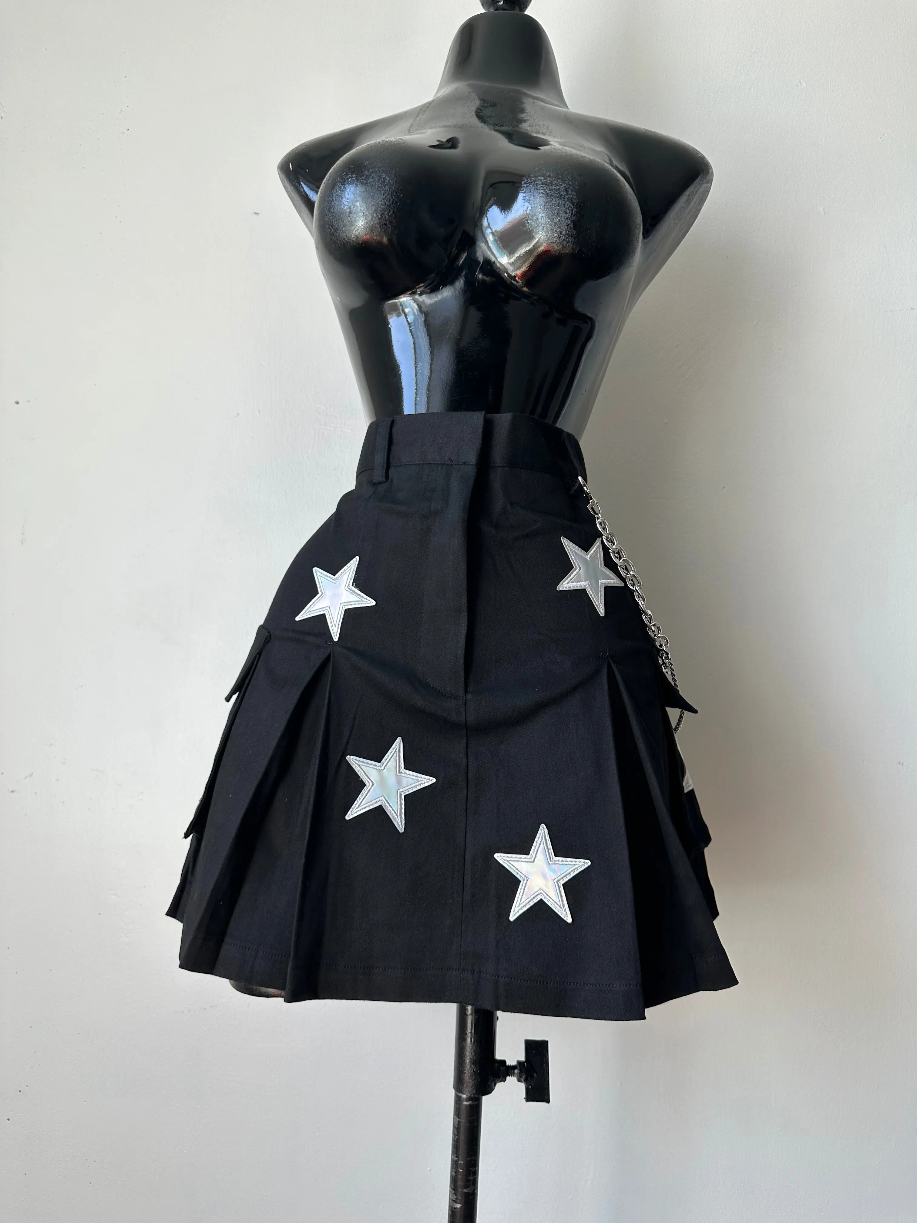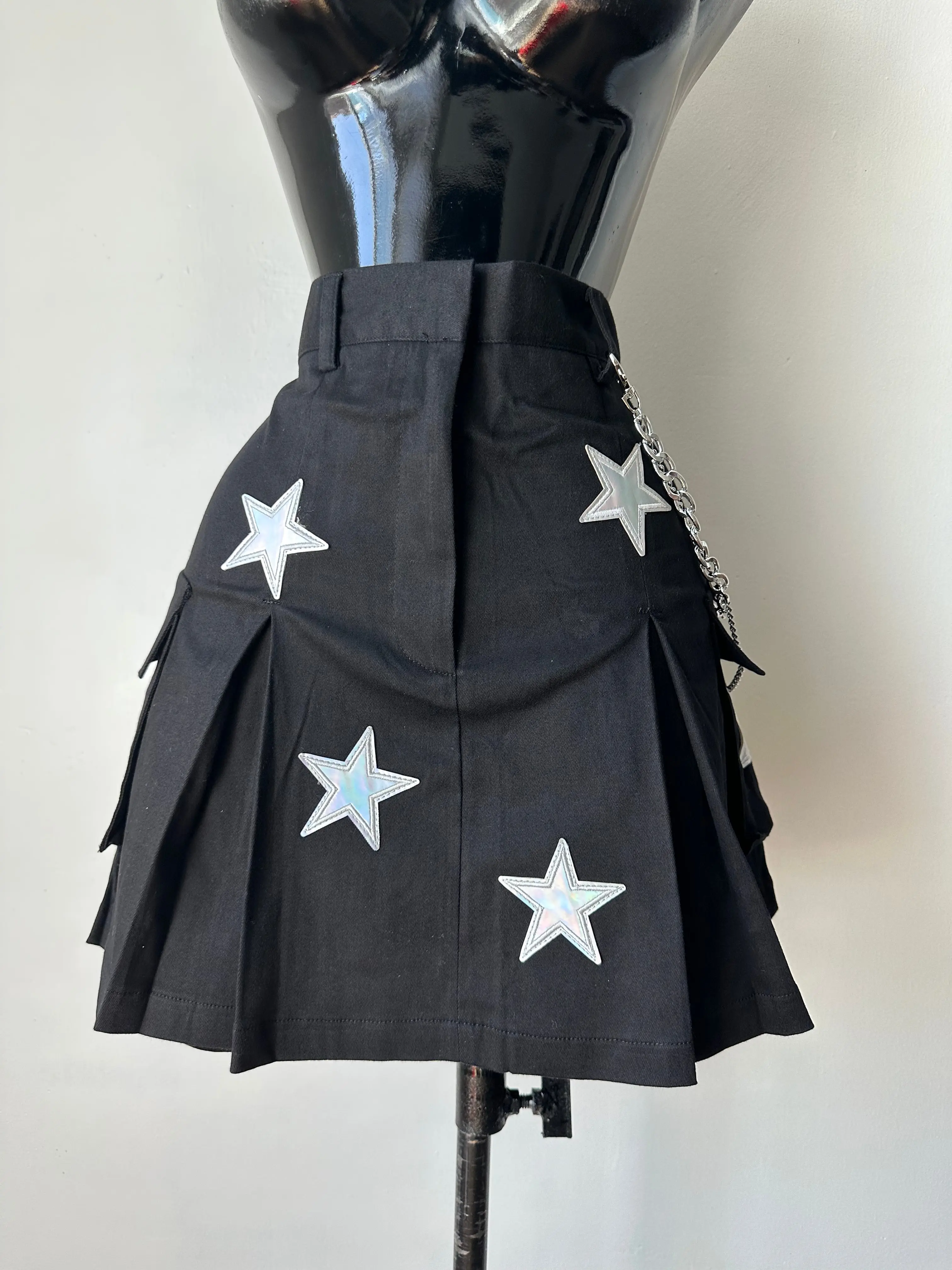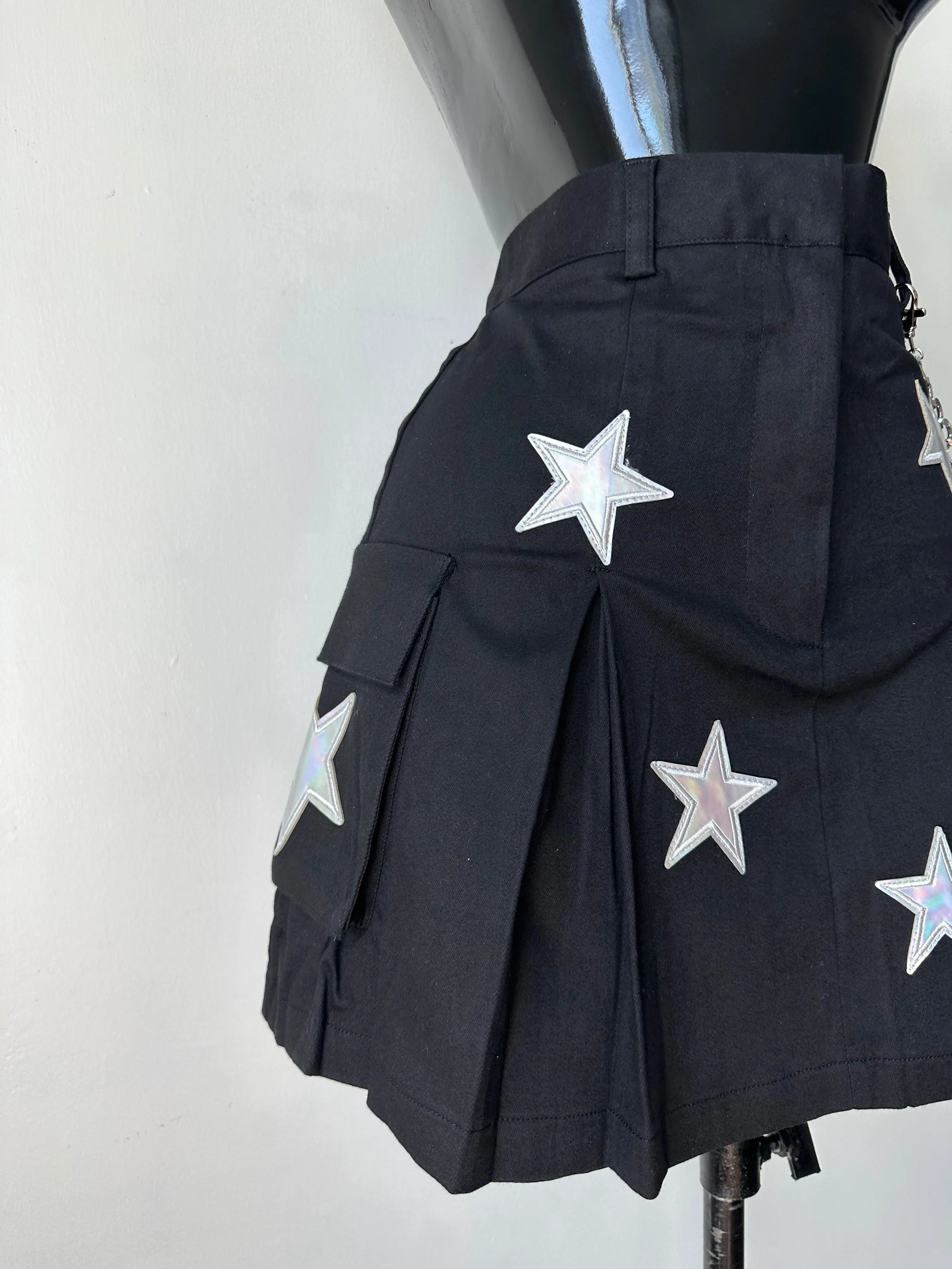 Mini Cargo in denim skirt, stretchy with reflective starts, chain and pocket details. 97% cotton 3% spandex.