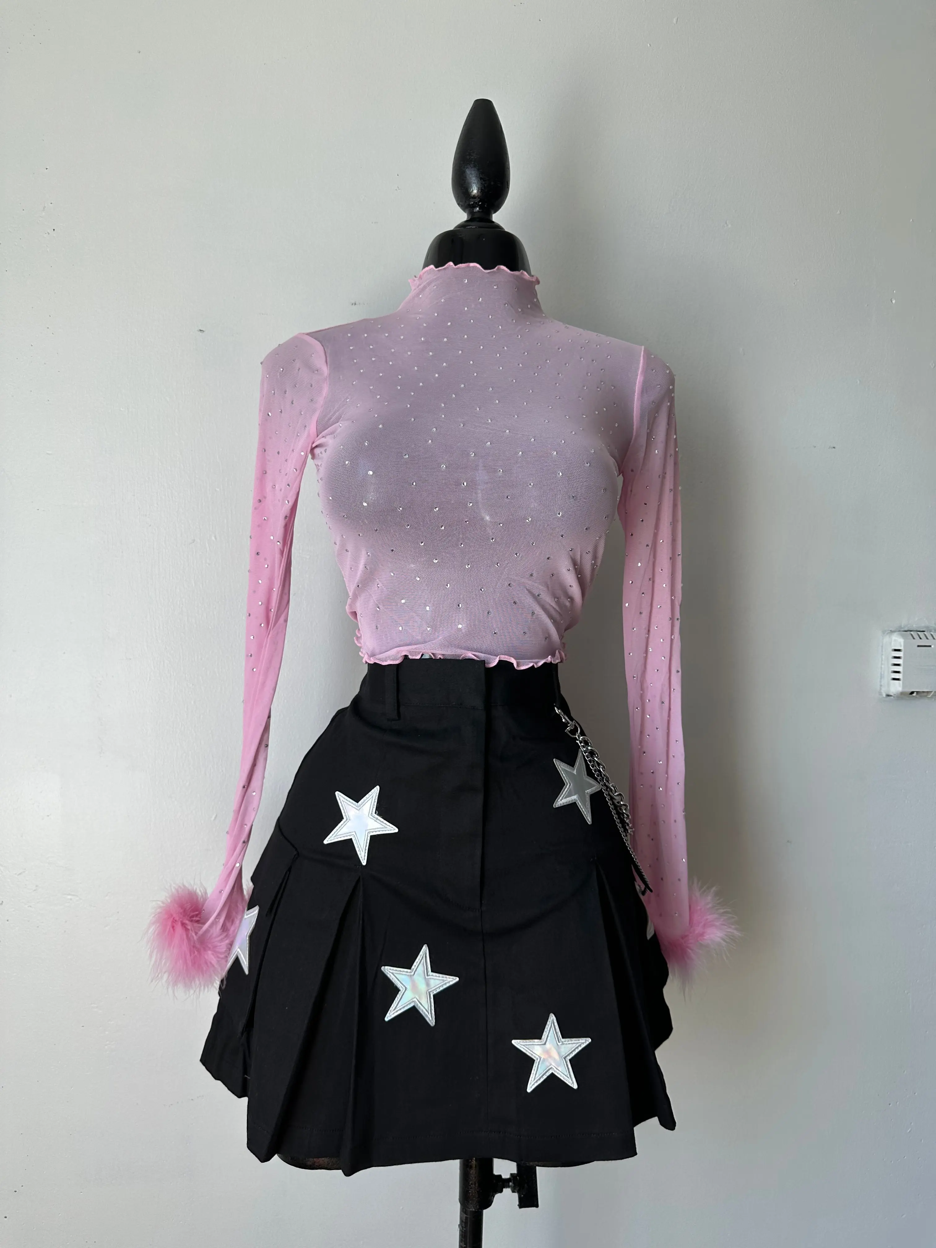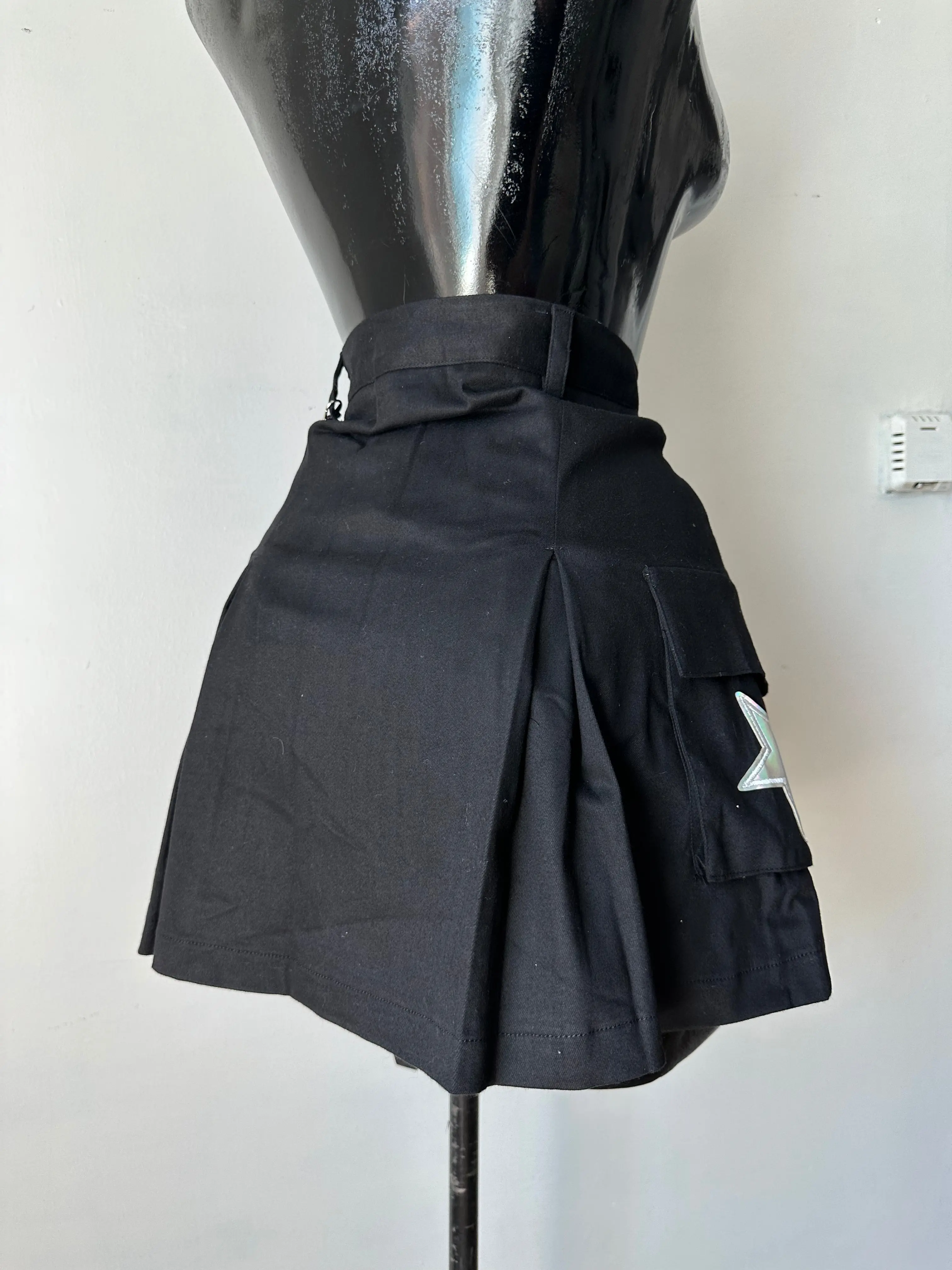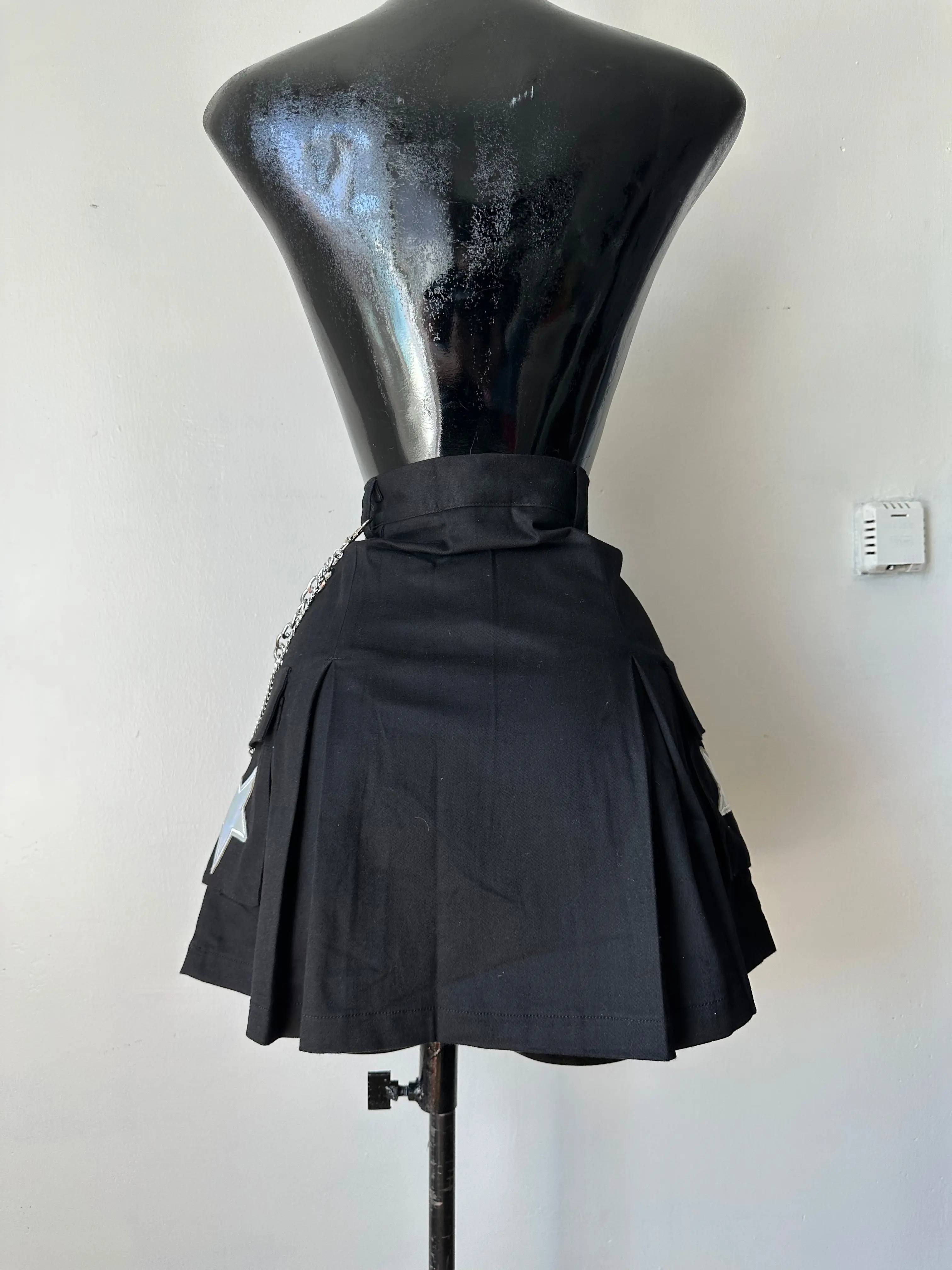 Mini Cargo in denim skirt, stretchy with reflective starts, chain and pocket details. 97% cotton 3% spandex.