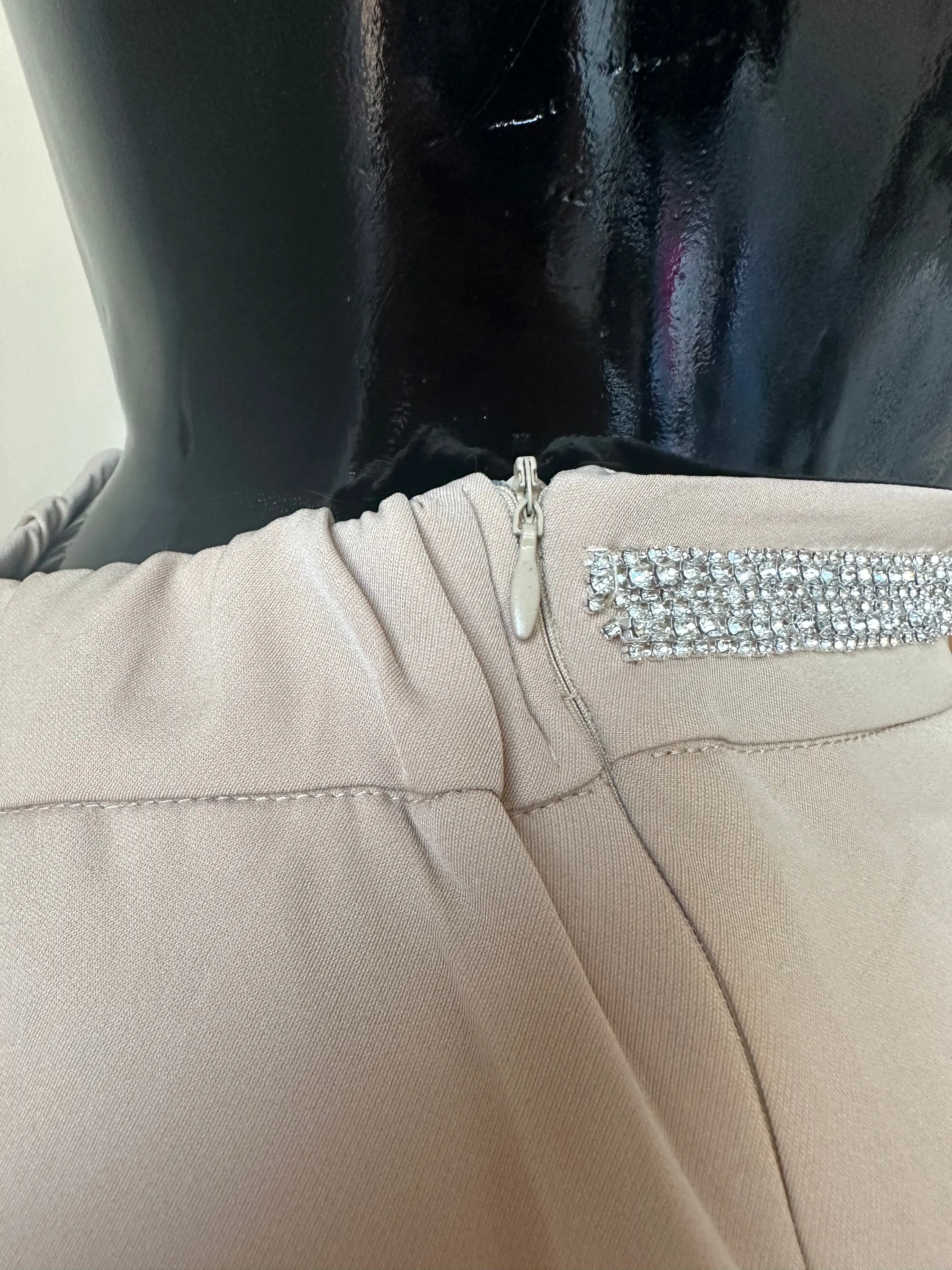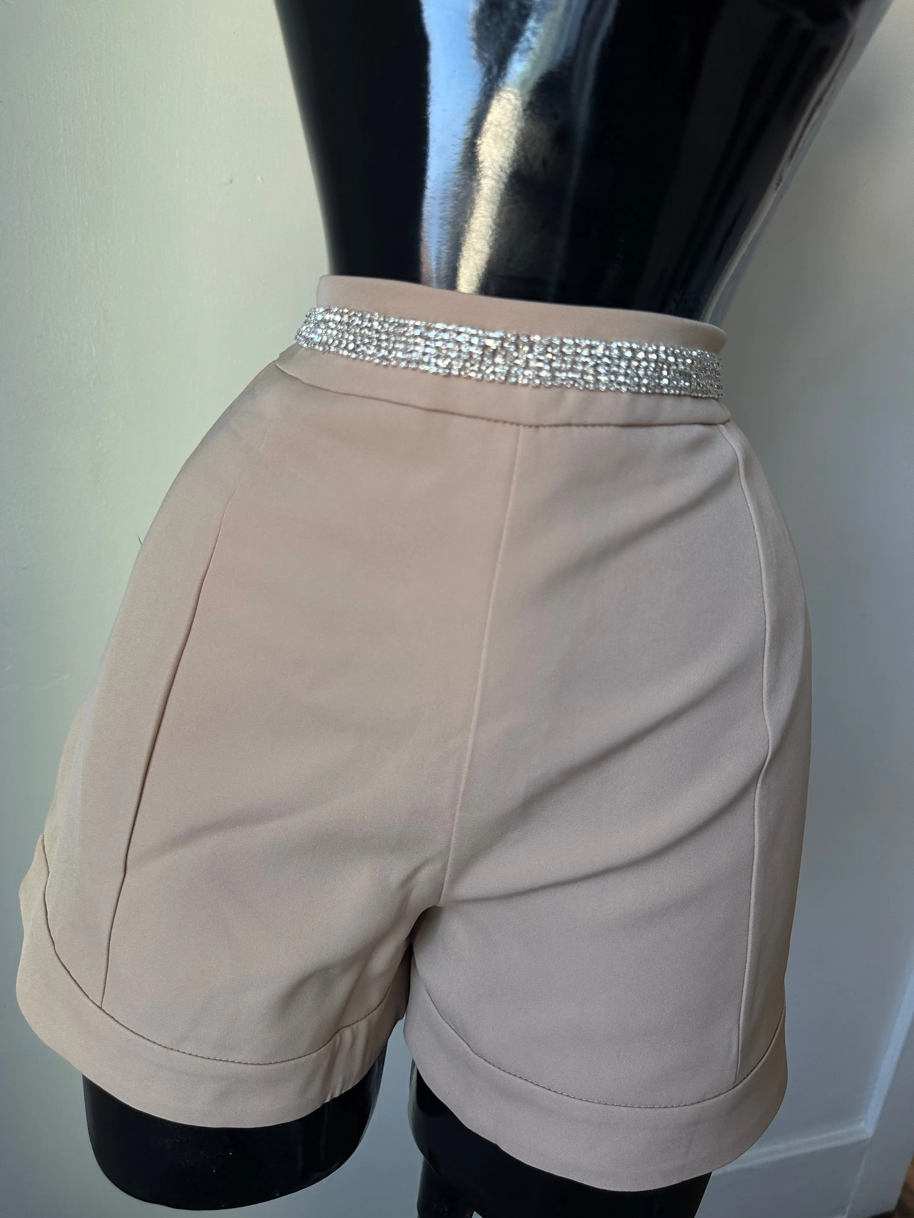 Embellished front waist band detail, with a back elastic band for a better fit, flat front with a dart detailing. Cuffed hem , and side zipper closure. True to size.