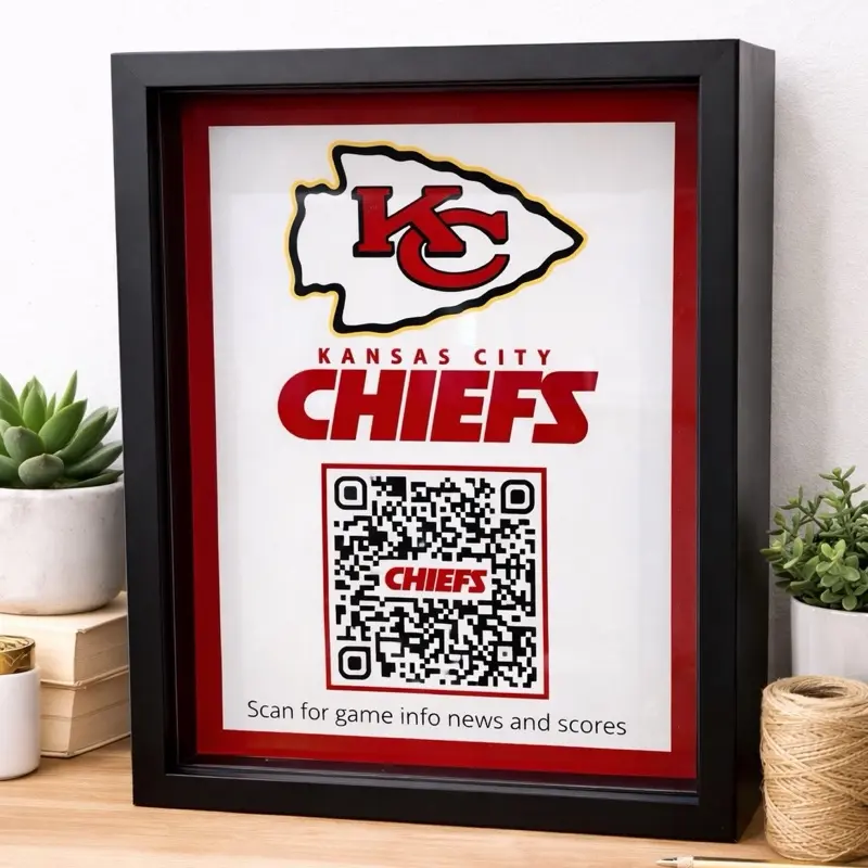 Show off your love for the Kansas City Chiefs with this one-of-a-kind interactive 8x10 shadow box. This custom fan display is more than just decor — it includes a scannable QR code that gives you quick access to Chiefs game information, highlights, scores, and schedules.