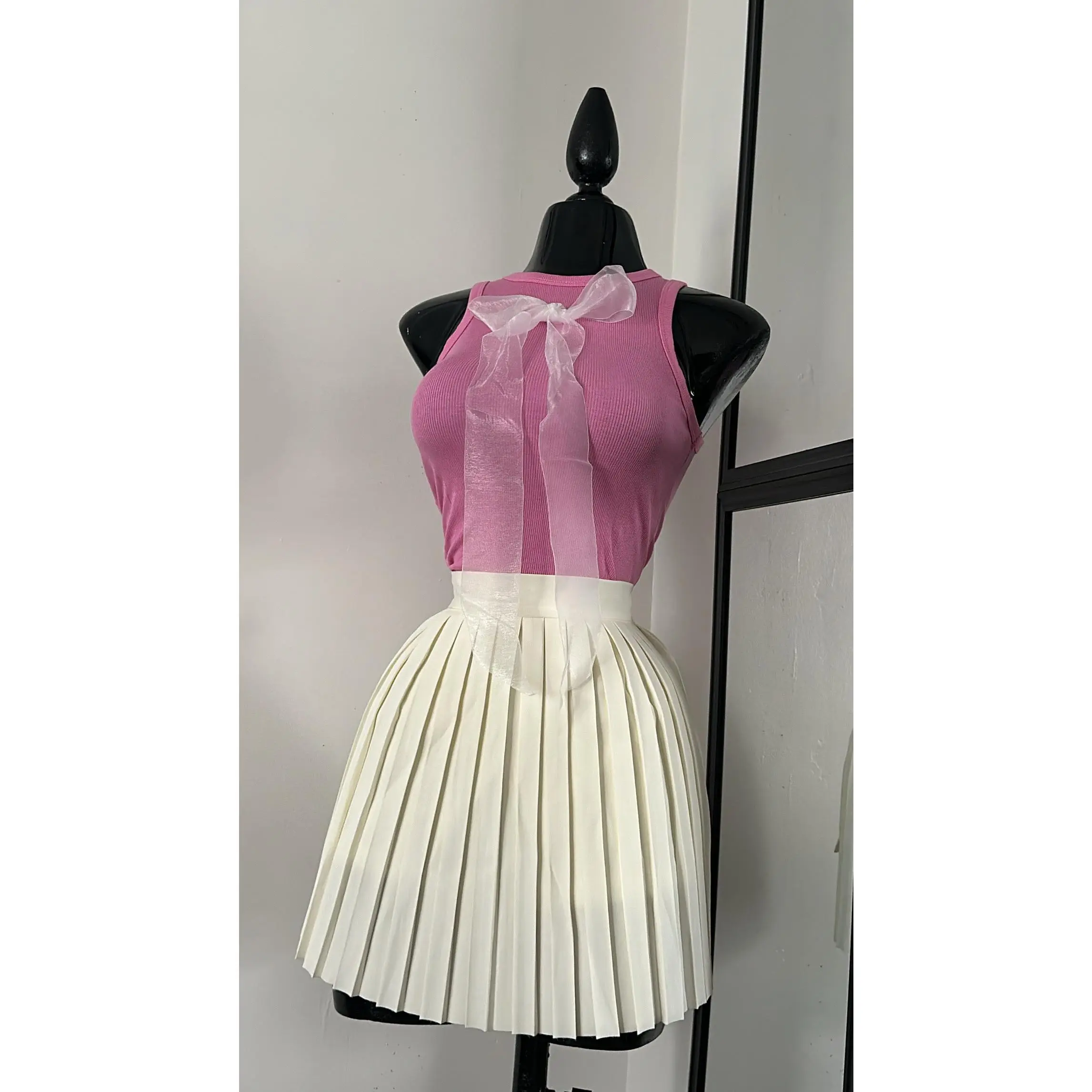Mesh ribbon bow, stretchy top.