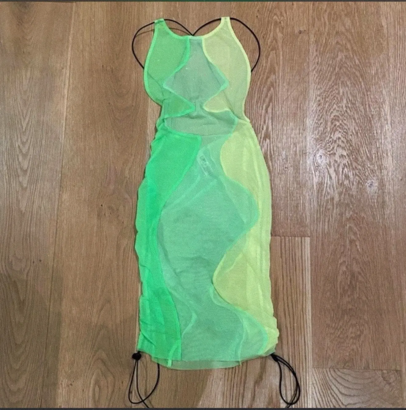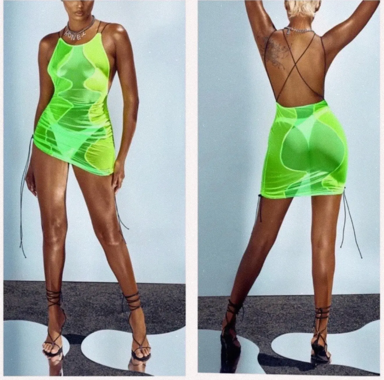 ·Features:Sheer stretch mesh fabric with eye-catching neon green and lime swirl patternHigh neck halter-style necklineOpen back with sexy criss-cross tie strapsSide tie details for adjustable fit and added flairFigure-hugging silhouette that hits mid-thigh
