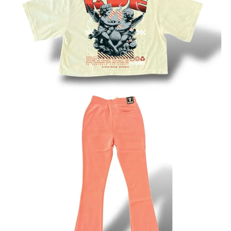 RDE Women's Jogger Set - Cream T-Shirt with Red Logo & Coral Joggers for Comfortable Wear