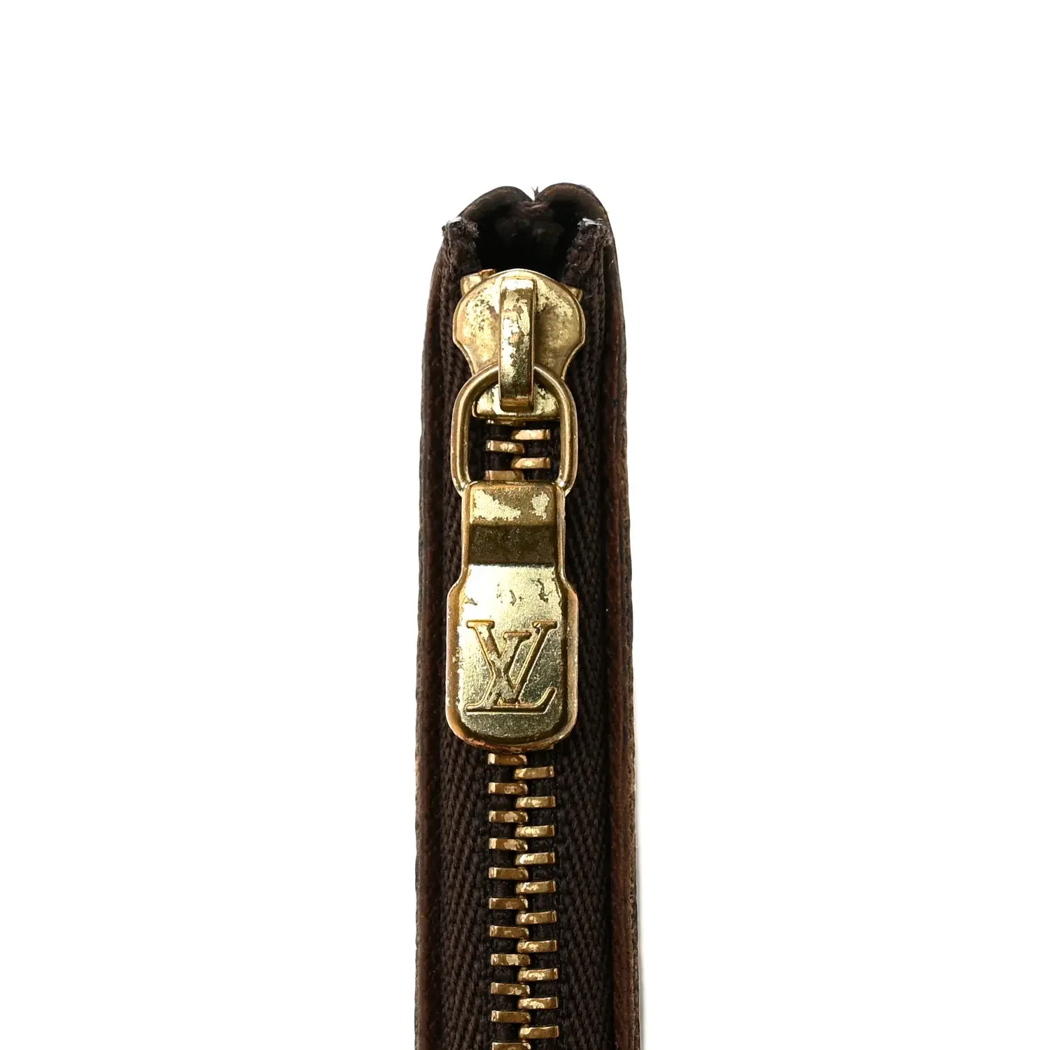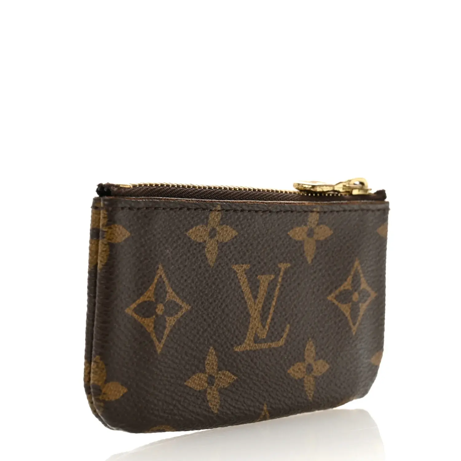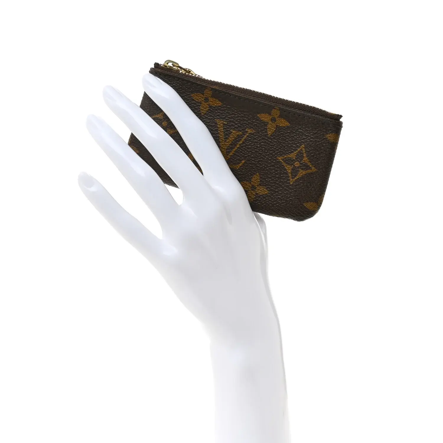 This is an authentic LOUIS VUITTON Monogram Key Pouch. This pouch is crafted of Louis Vuitton monogram coated canvas in brown. The top zipper opens to a brown crossgrain leather interior with an attached brass clasp that can be clipped to your keys or handbag.