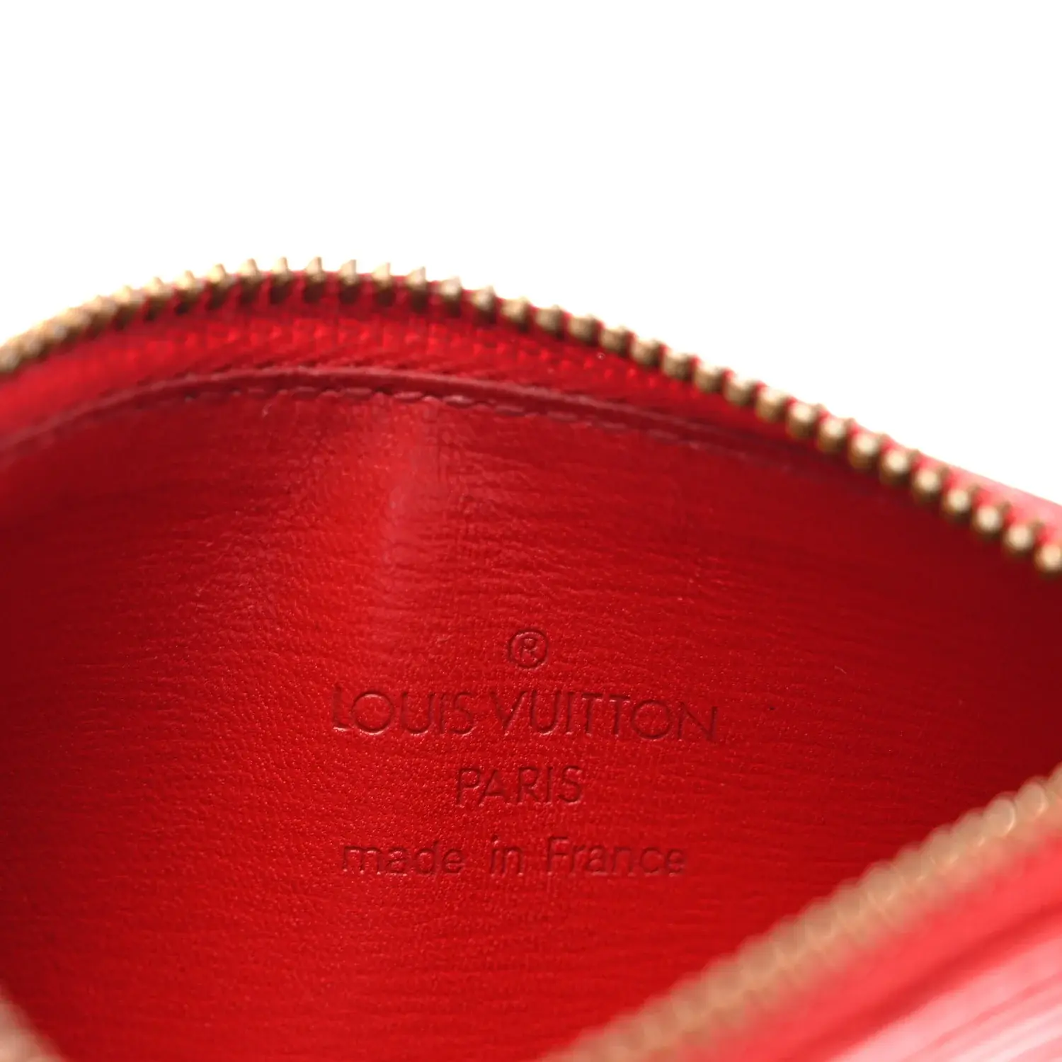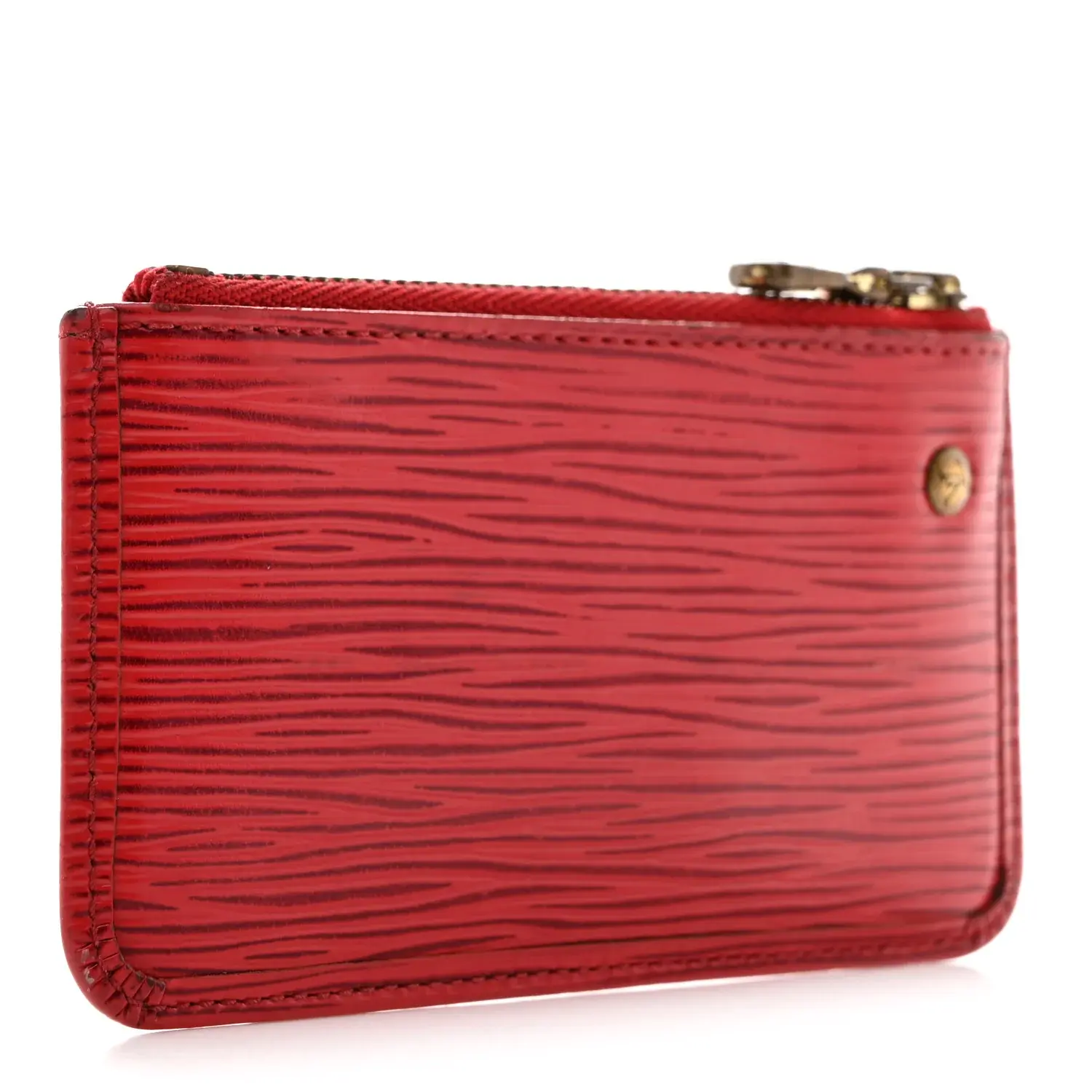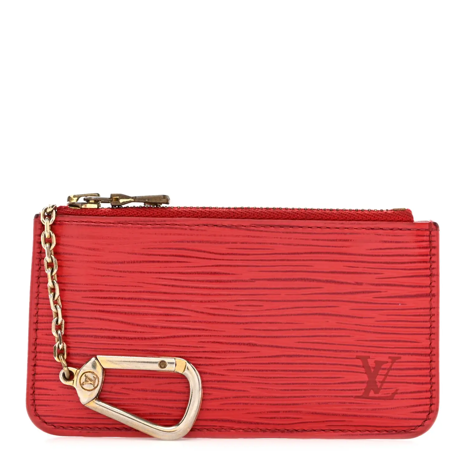 This is an authentic LOUIS VUITTON Epi Key Pouch Castillan in Red. This stylish key pouch is crafted of Louis Vuitton's signature textured epi leather in red. The pouch features a gold D-ring clasp and a red crossgrain leather interior.