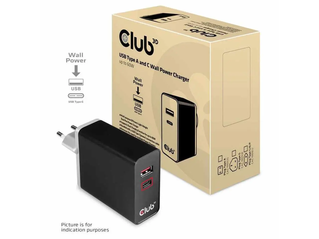 Club3D CAC-1902 USB Type A and C Wall Power Charger up to 60W