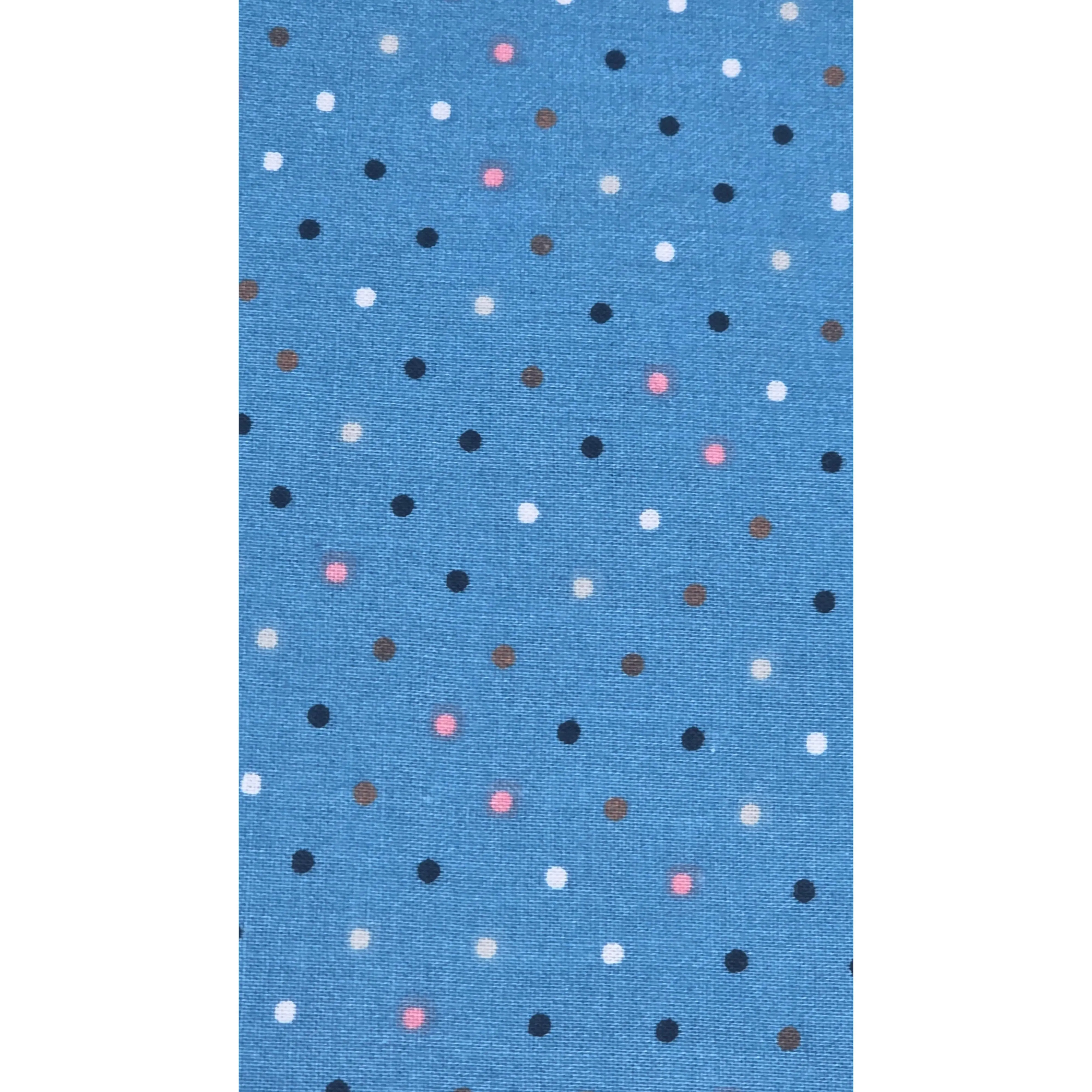 A fun and playful cotton featuring scattered multicolor dots on a bright blue background. This cheerful print adds a pop of color and movement, making it perfect for kids projects, quilts, and stash-building basics. The lively dot pattern brings a whimsical touch to any sewing project.