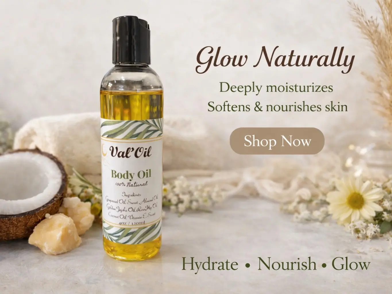 Val’Oil Body Oil is a nourishing natural body oul designed to deeply moisturize and leave your skin soft, smooth, and glowing. This lightweight oil absorbs easily without leaving a greasy feel.