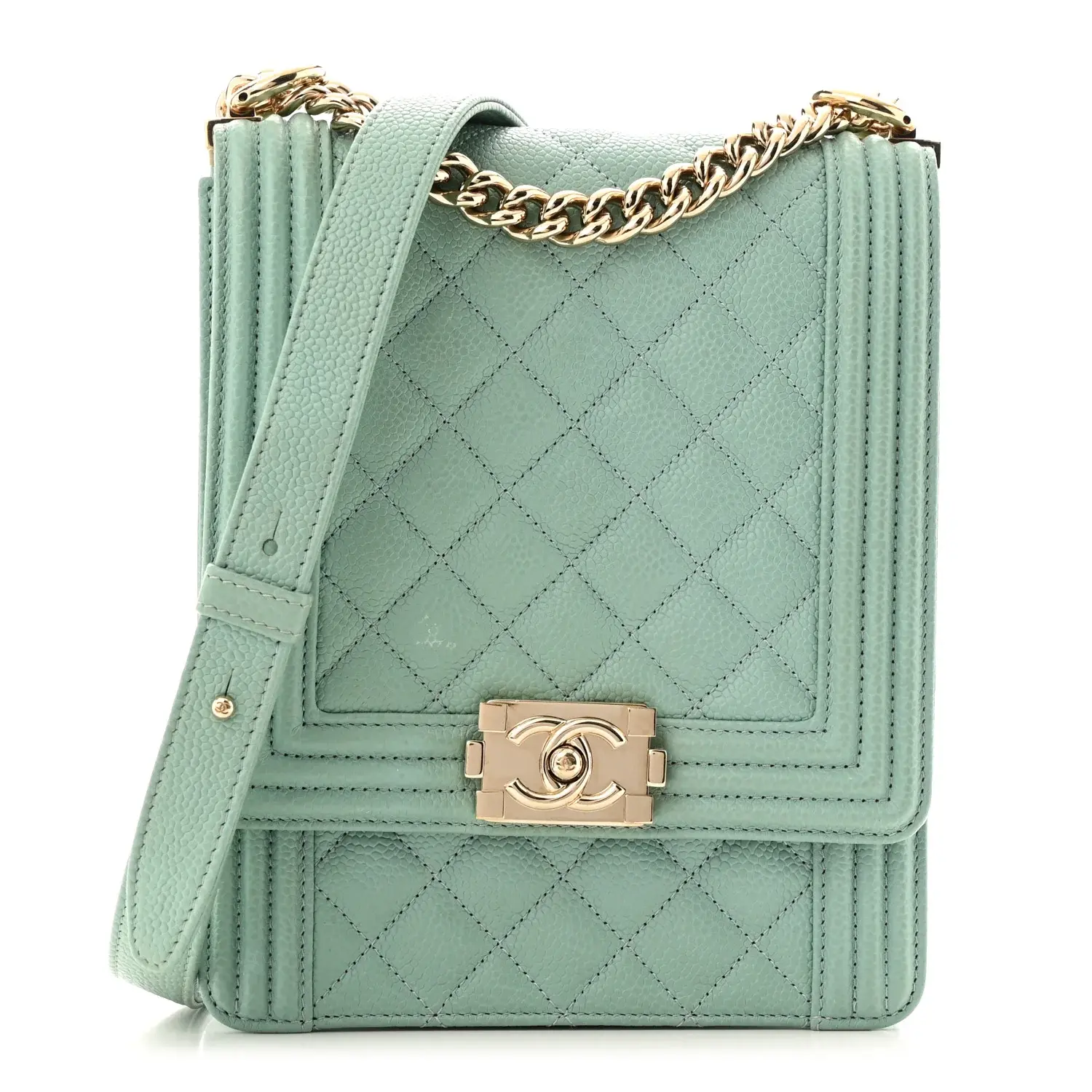 This is an authentic CHANEL Calfskin Quilted North South Boy Flap in Light Blue. This chic shoulder bag is crafted of calfskin leather in mint green. The bag features a polished light gold shoulder chain with a matching leather shoulder pad, a diamond quilted flap with a linear quilted border and a polished light gold CC boy push lock. The flap opens to a fabric interior with a patch pocket. This petite shoulder bag is a sensation for an evening, from Chanel!