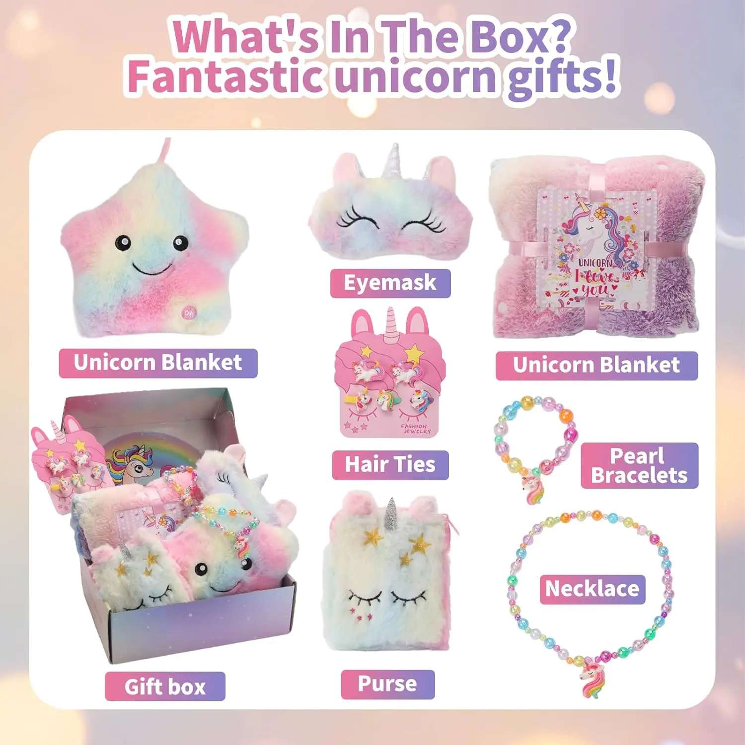 ·【Styling Unicorn Gift Set for Girls】- Adorable unicorn toy gift set for girls fulfills all the fantasies of a little girl, unicorn gift box includes glow in the dark blanket, LED light up star pillow, 5 hair ties, plush eye mask, a plush crossbody bag, jewelry kits. Everything for play, style, and comfort in one box