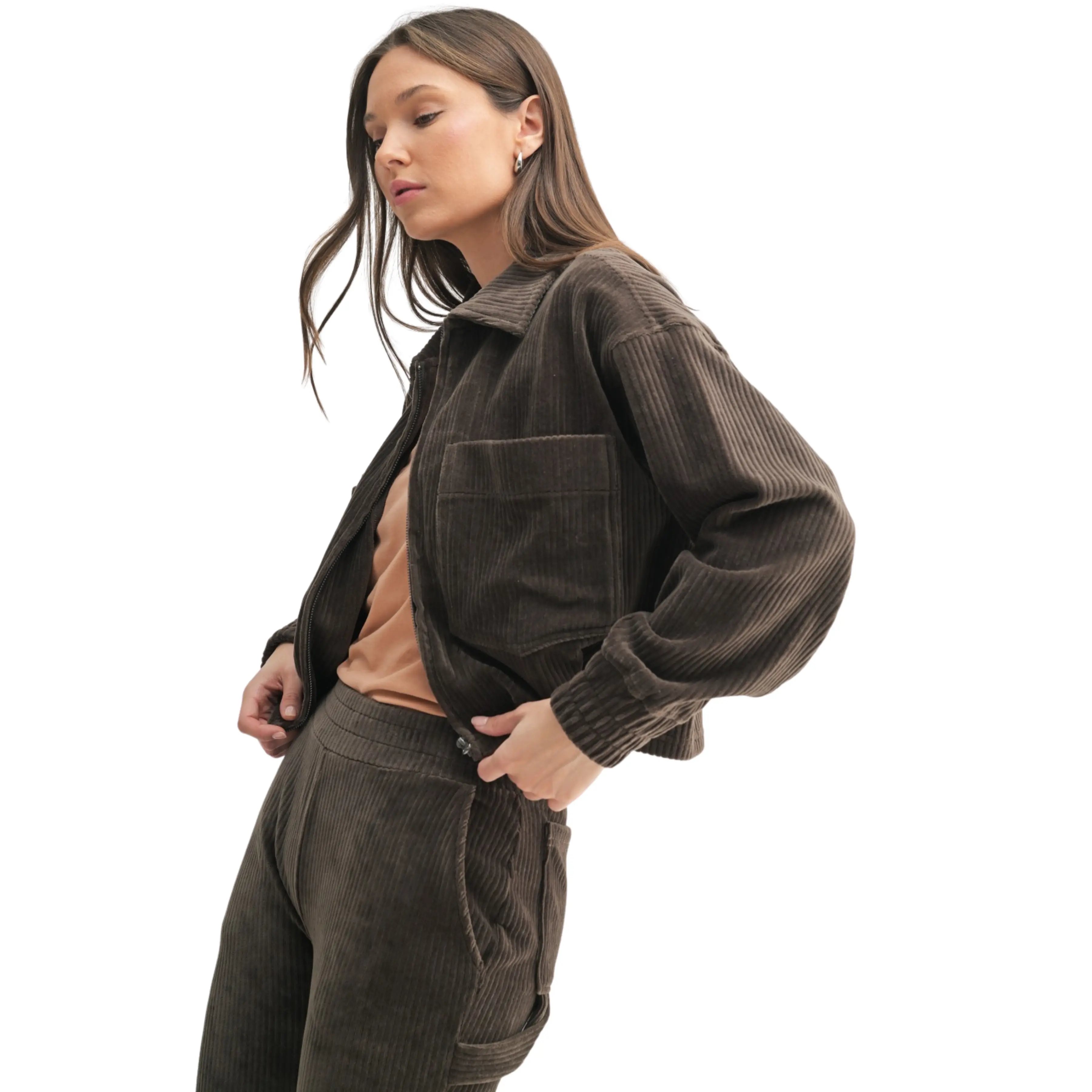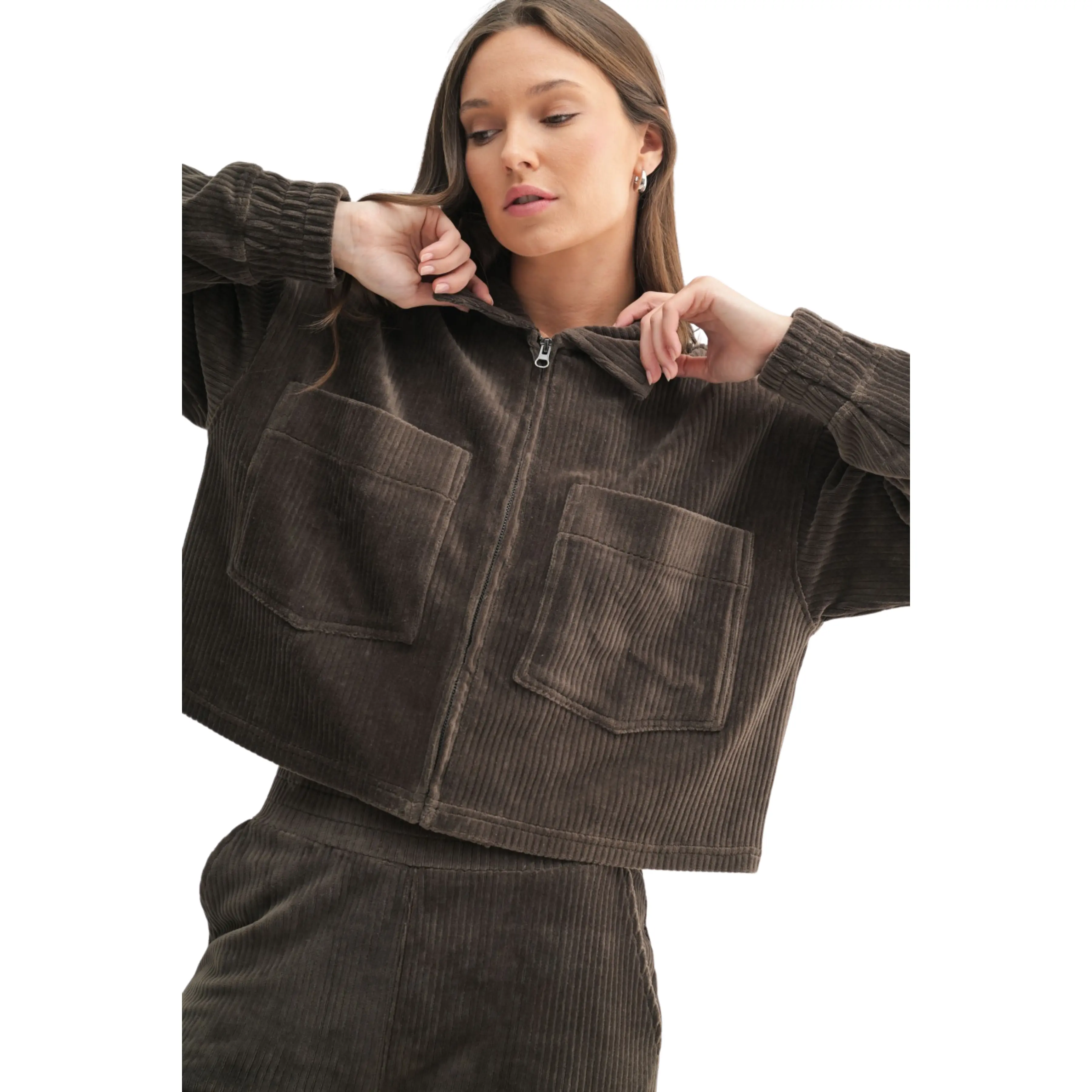 Velvetly Corduroy Collared and Cropped Zip Up Jacket