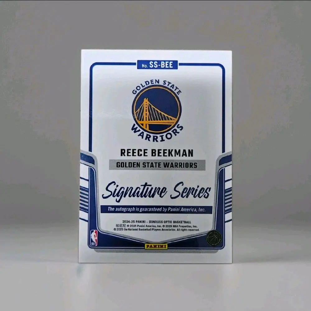 This card is an officially licensed NBA trading card featuring Reese Beekman. It's part of the Warriors Signature Series, making it a must-have for collectors. The card showcases Beekman's signature, adding a personal touch. Perfect for fans and collectors alike, it's a genuine piece of NBA memorabilia.