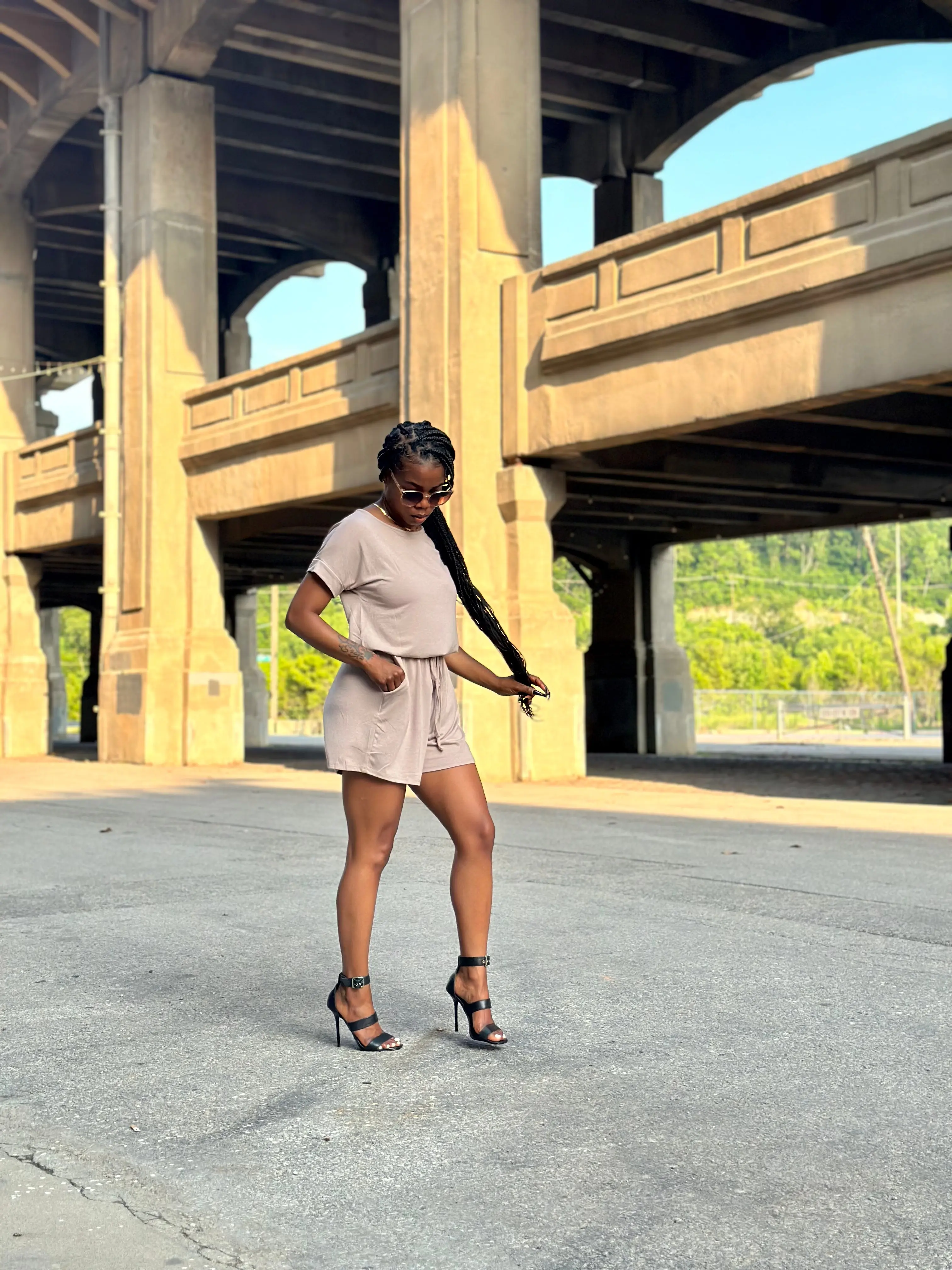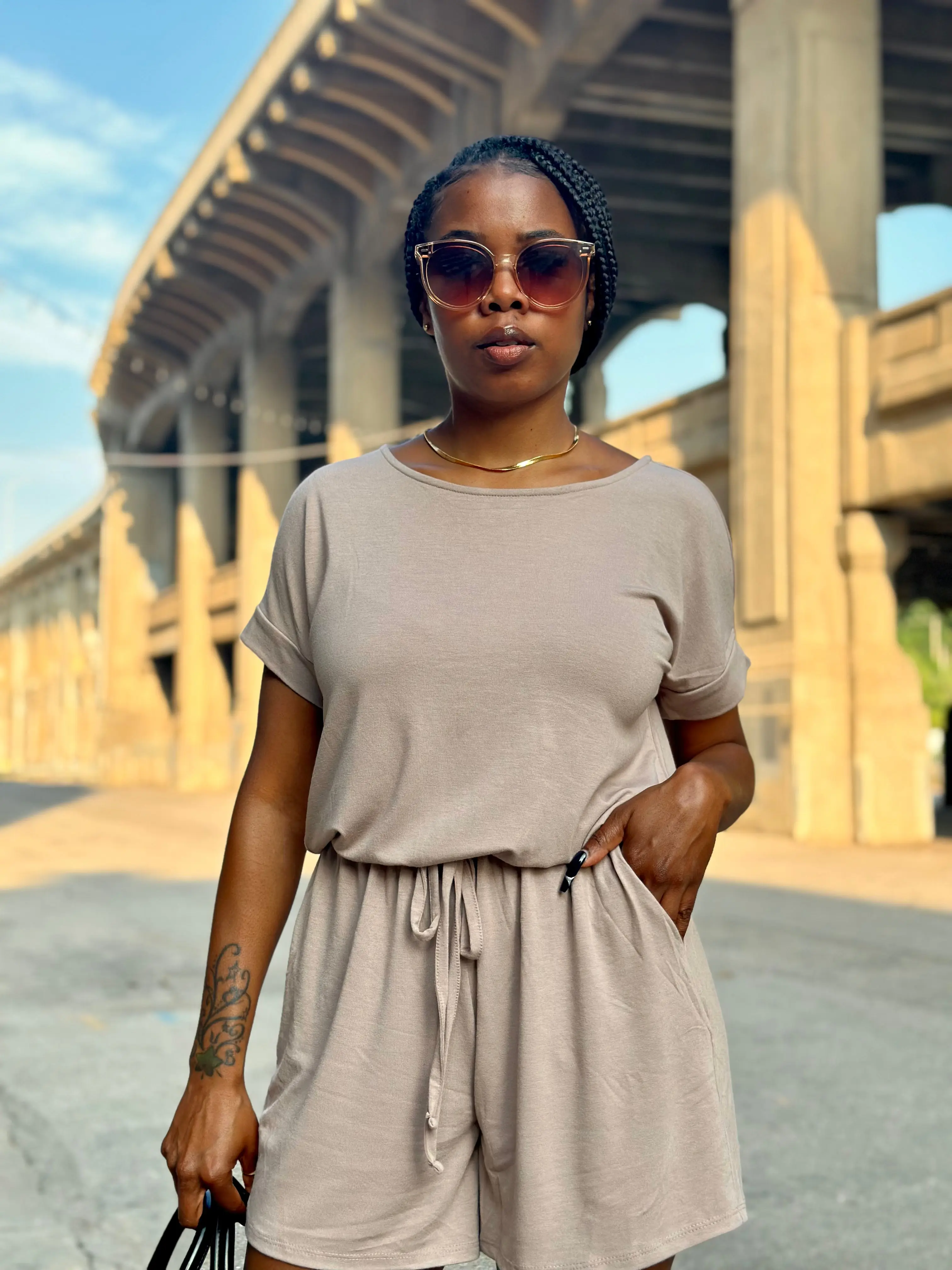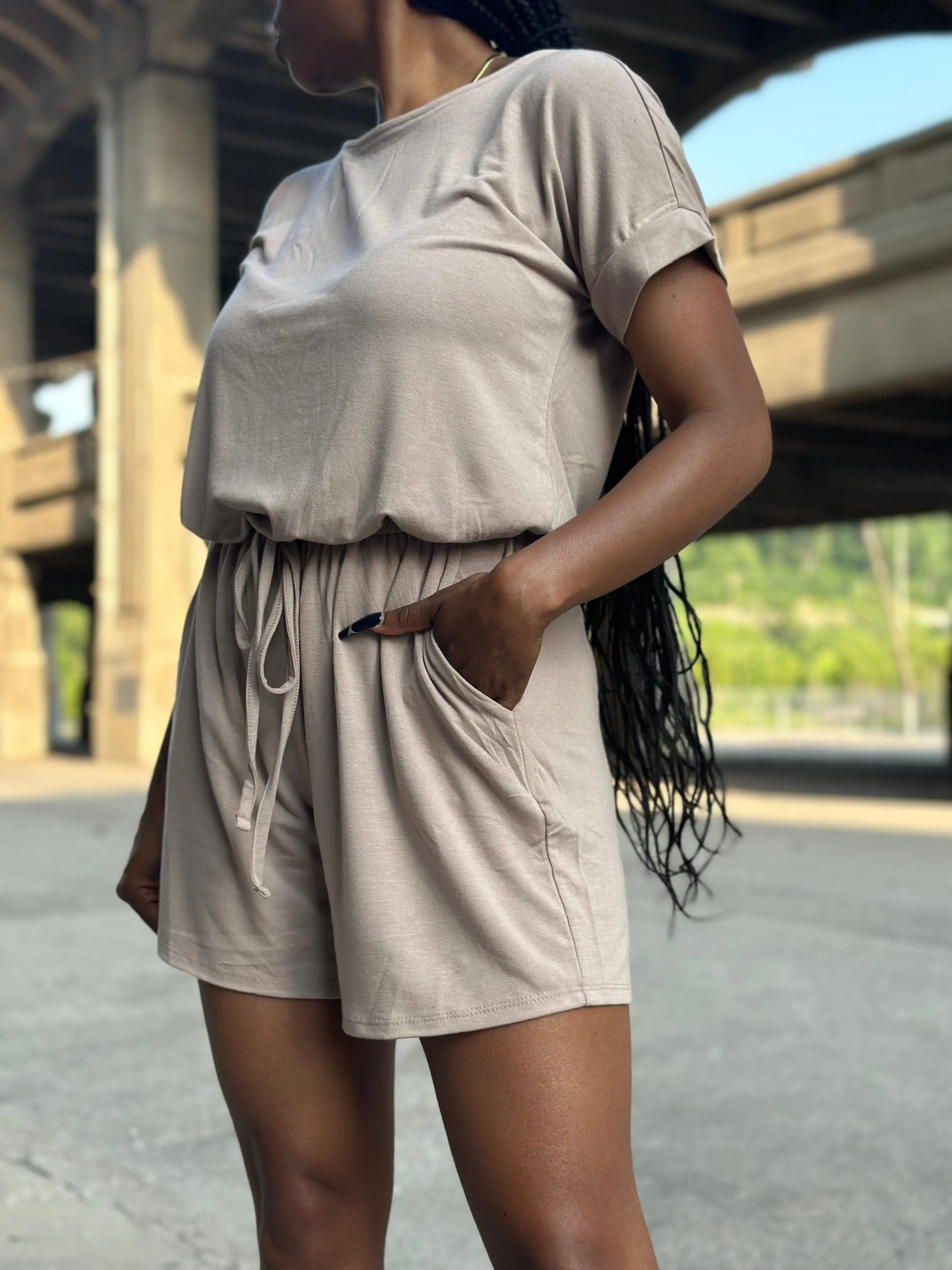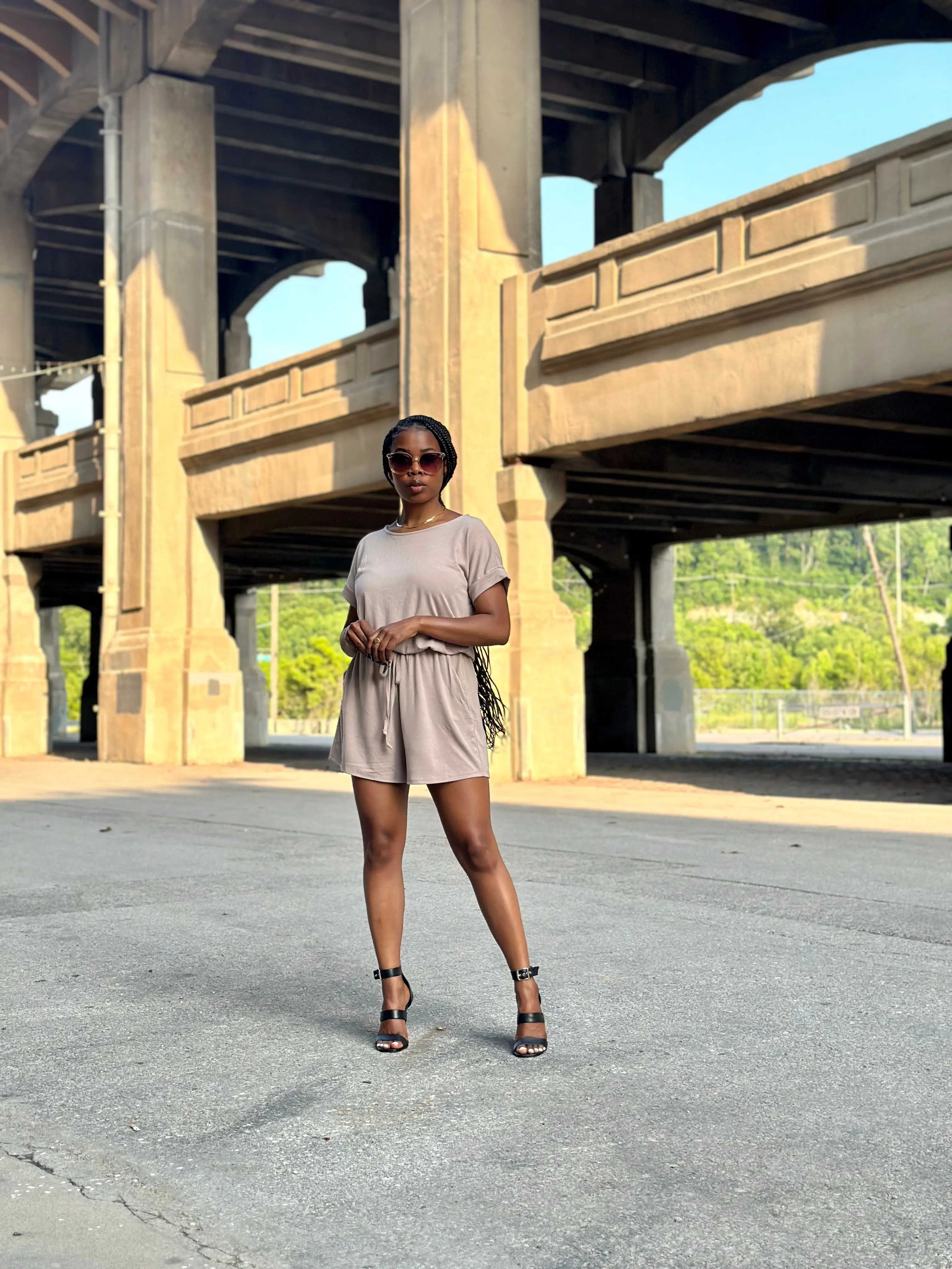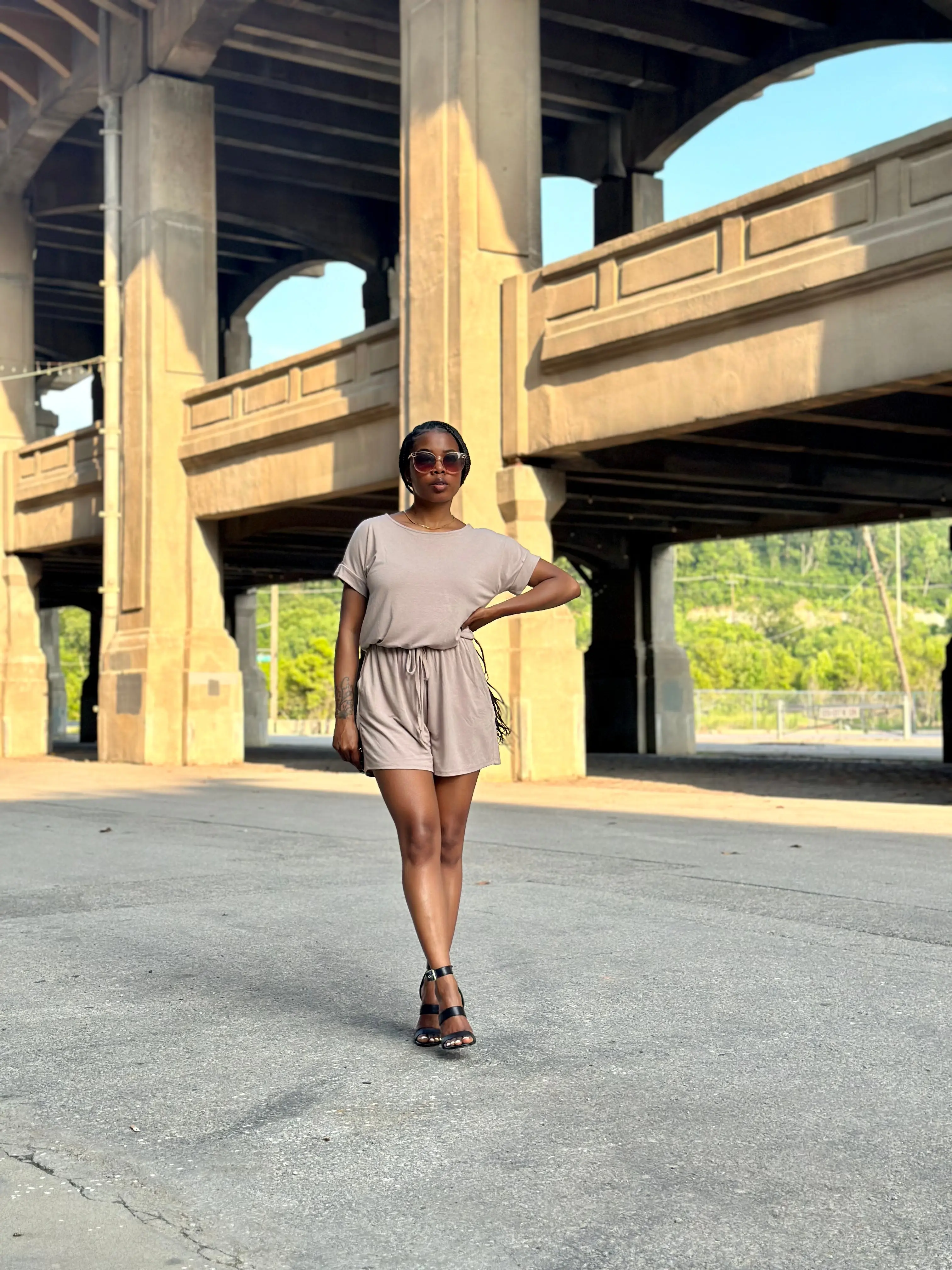 This romper features an elastic waist and a back keyhole opening with a self tie.