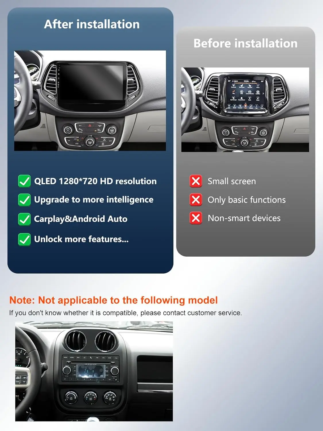 · Designed specifically for Jeep Compass 2017 2018 2019 2020, this radio offers a perfect fit without any modifications. Please check the year, dimensions and shape of the center console of your vehicles before purchasing. If you are not sure, you can send messages or picture to us, we will give you advice.