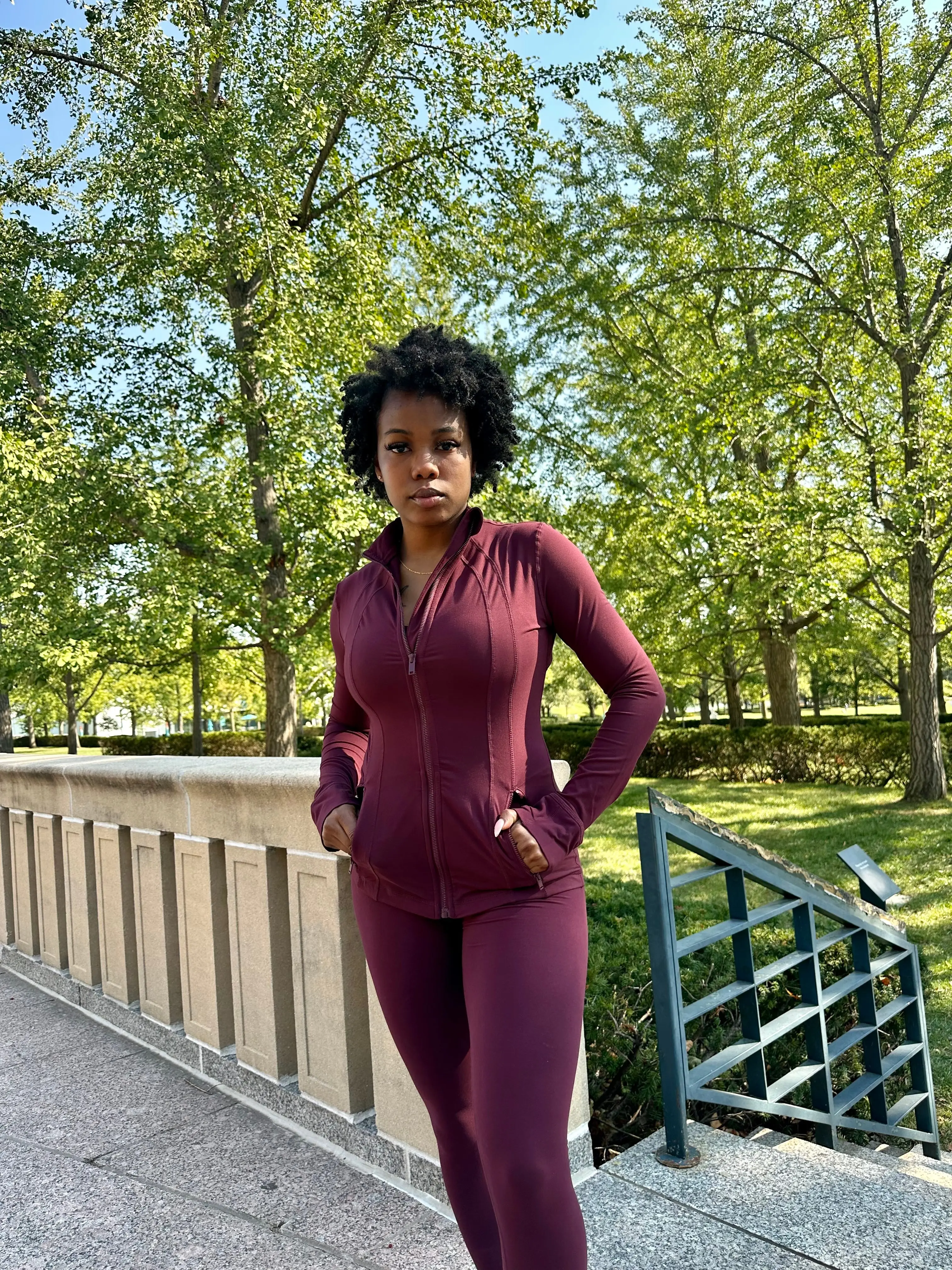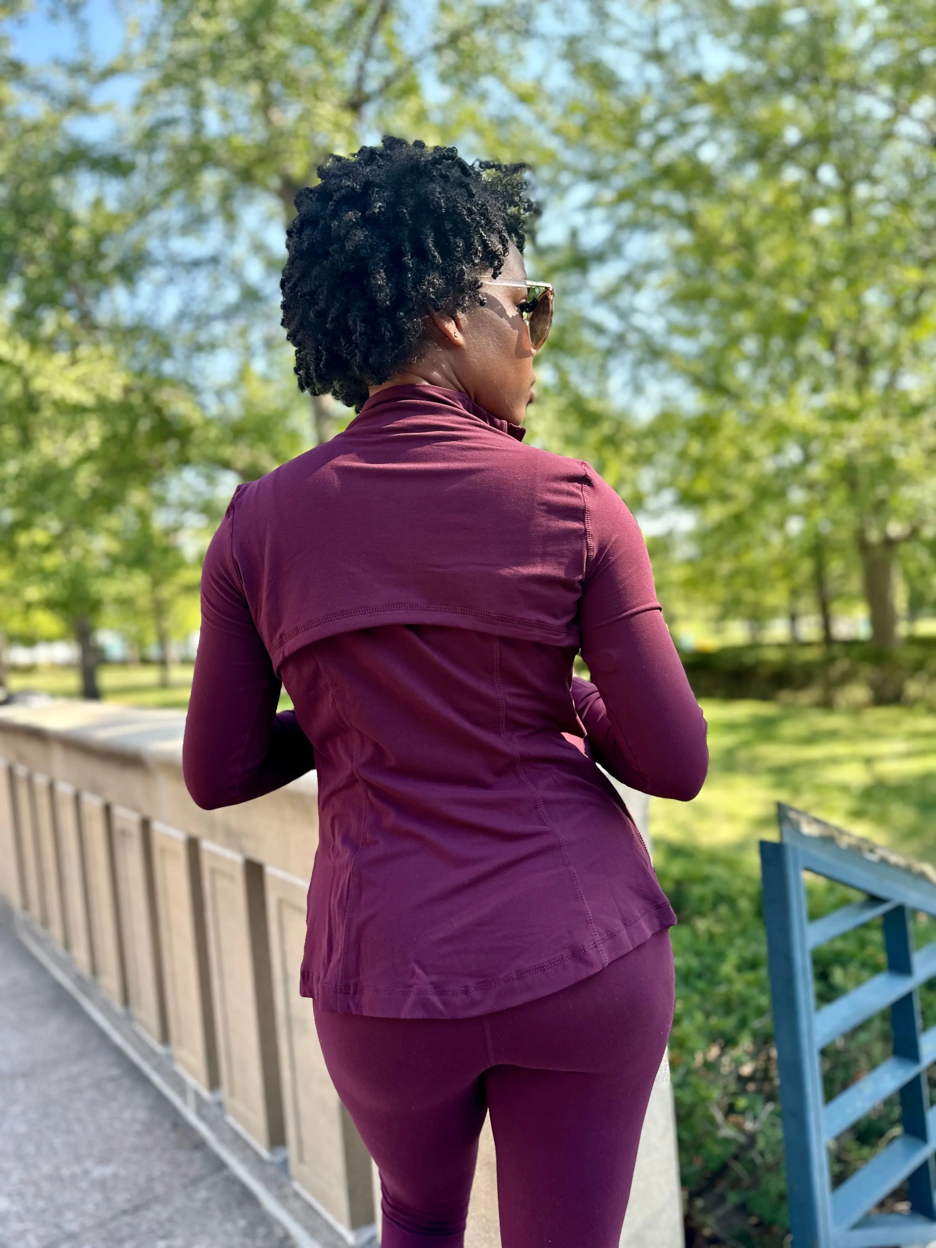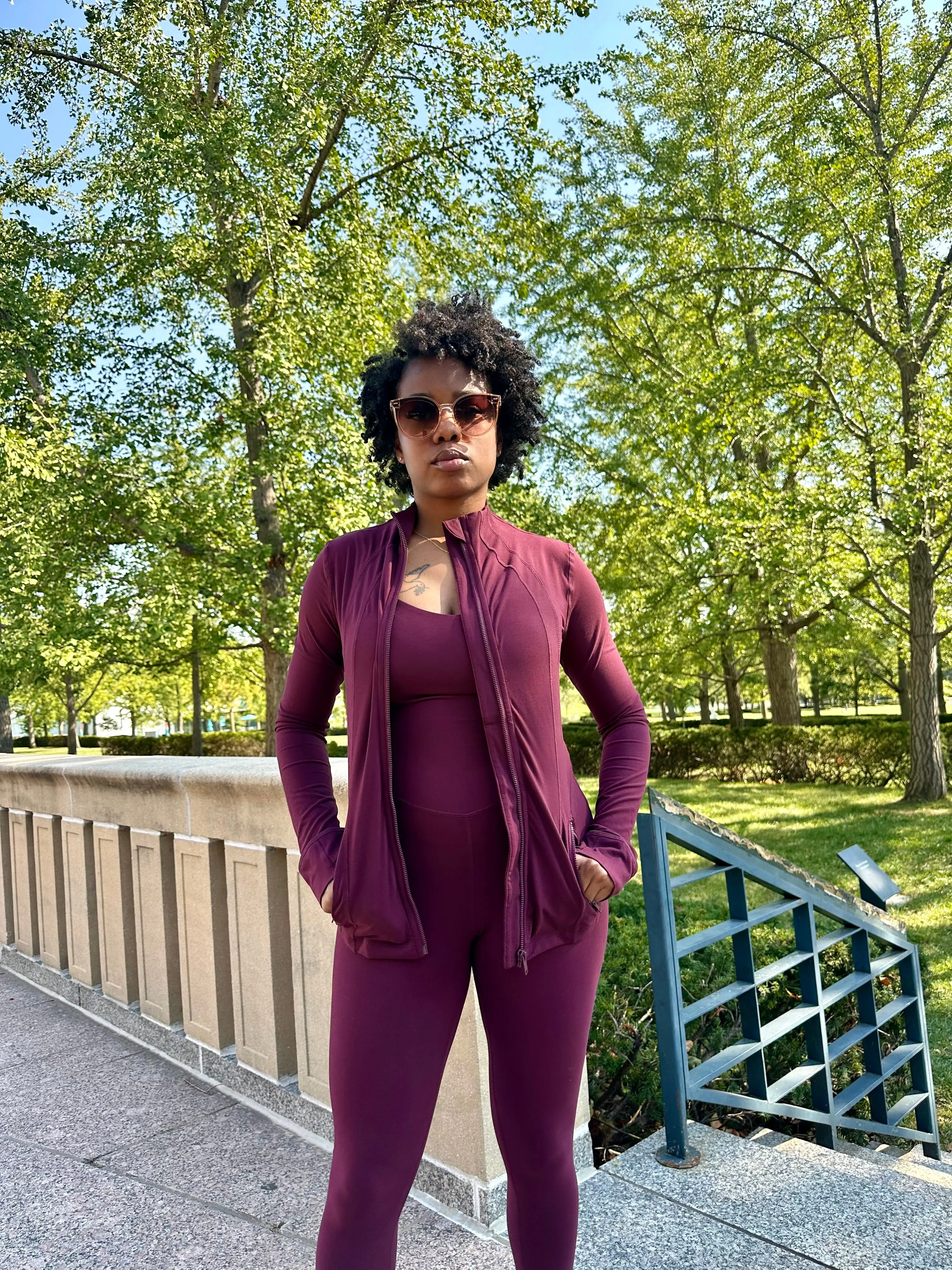 This jacket is perfect to wear over your favorite workout set. This jacket pairs perfectly with our DEMI Yoga Jumpsuit.