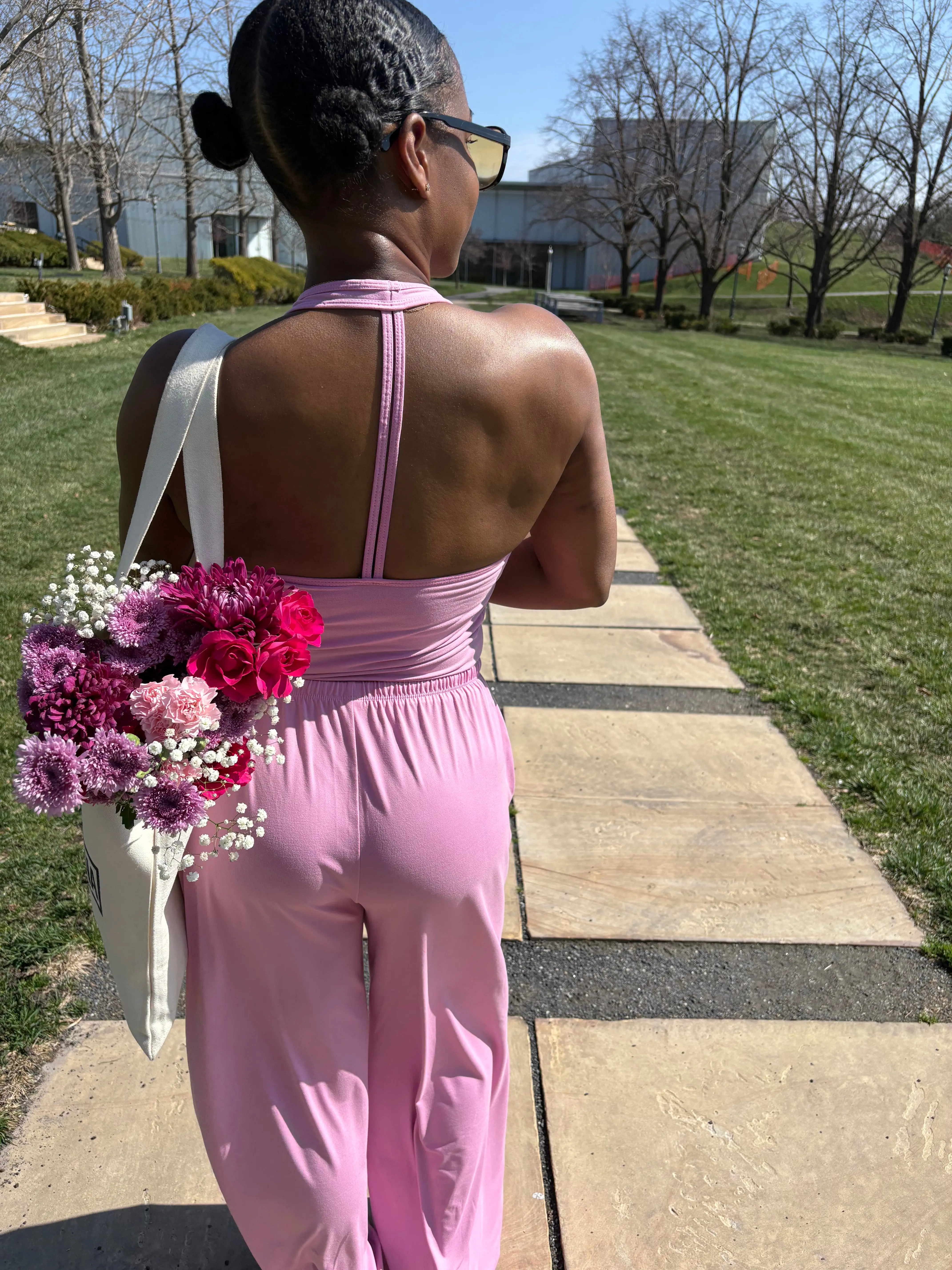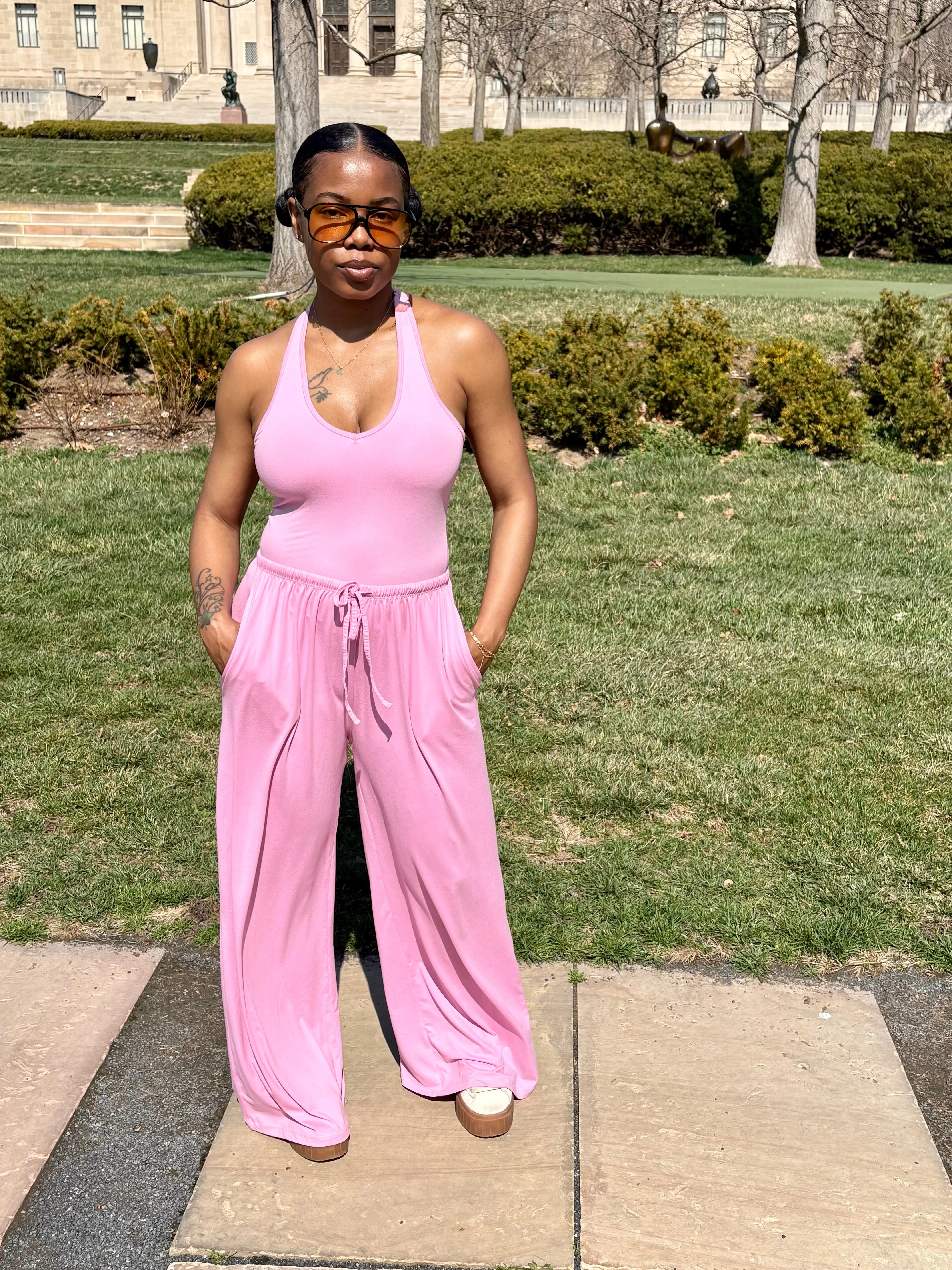 A 2-piece halter top & lounge pants set in light pink.
