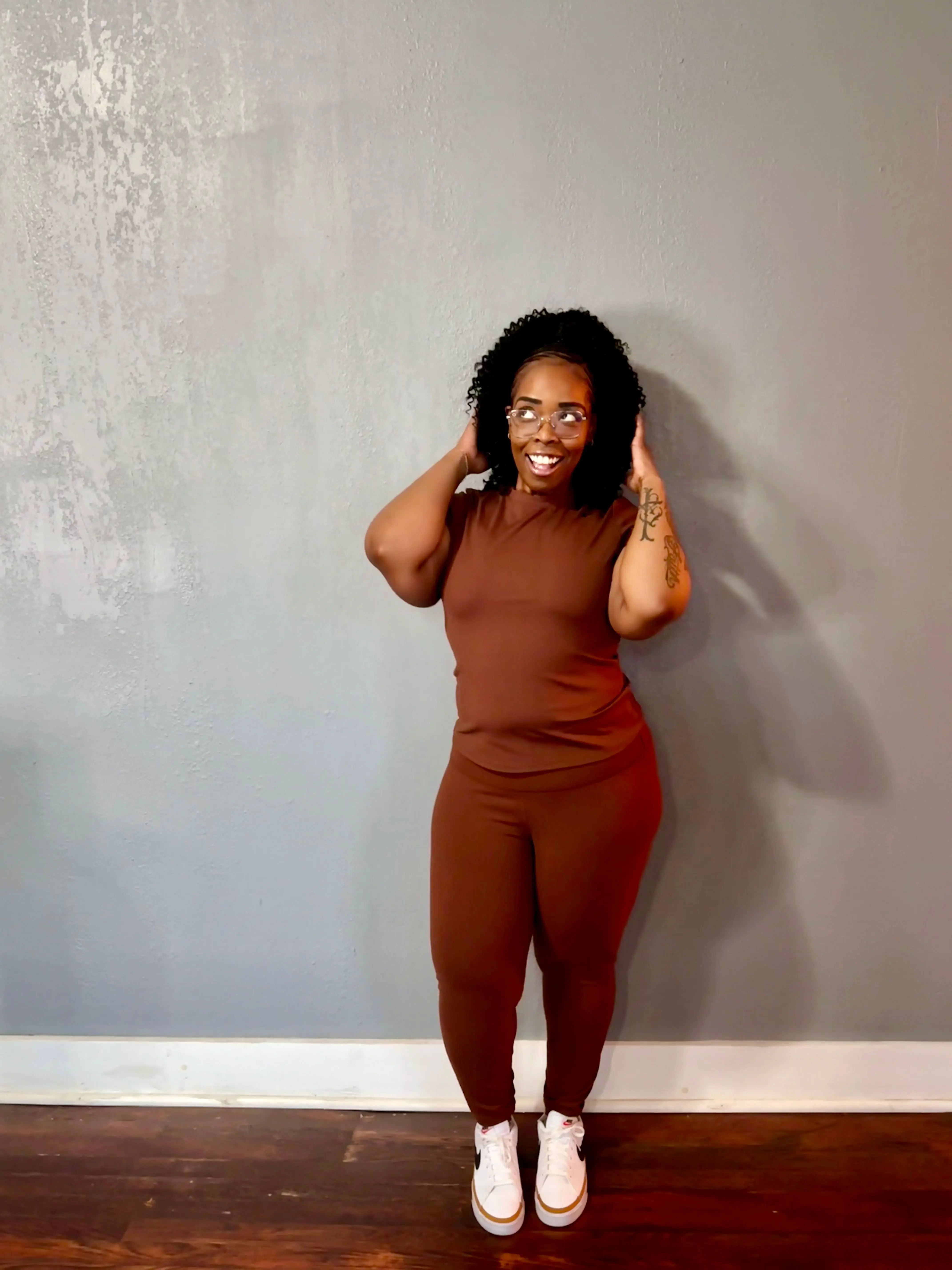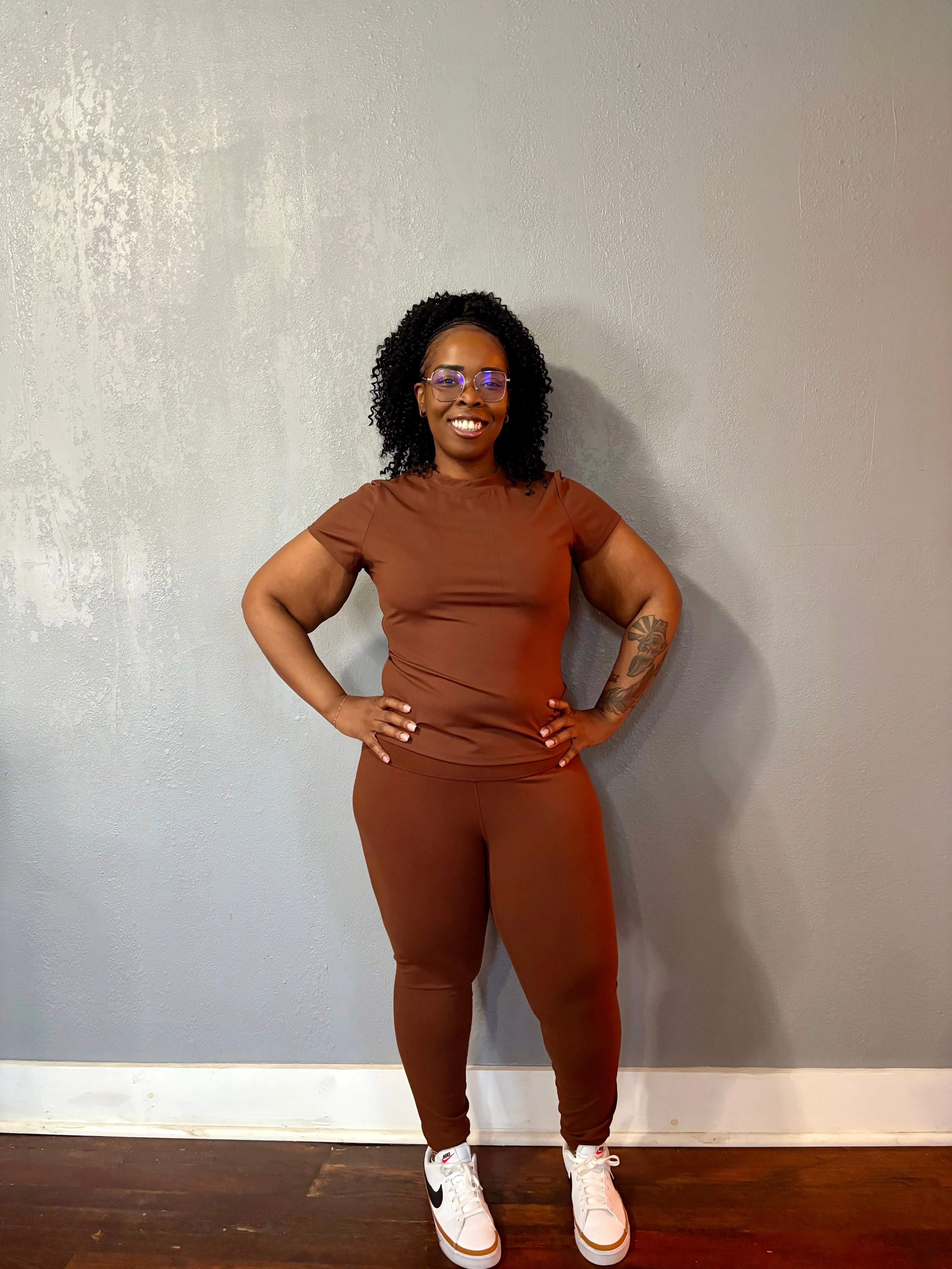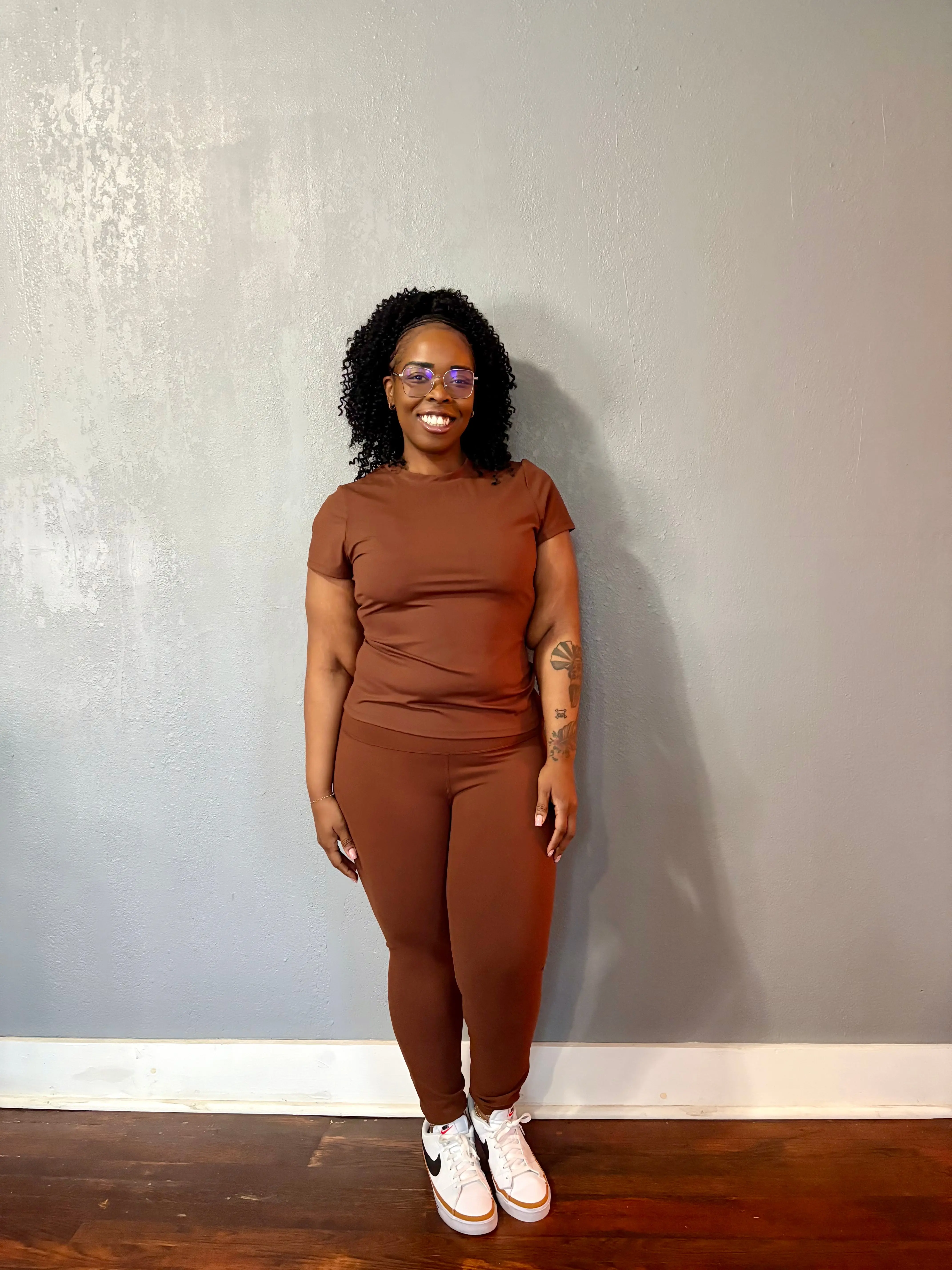 A high crewneck short sleeve top with high waist matching leggings in a coffee brown color.