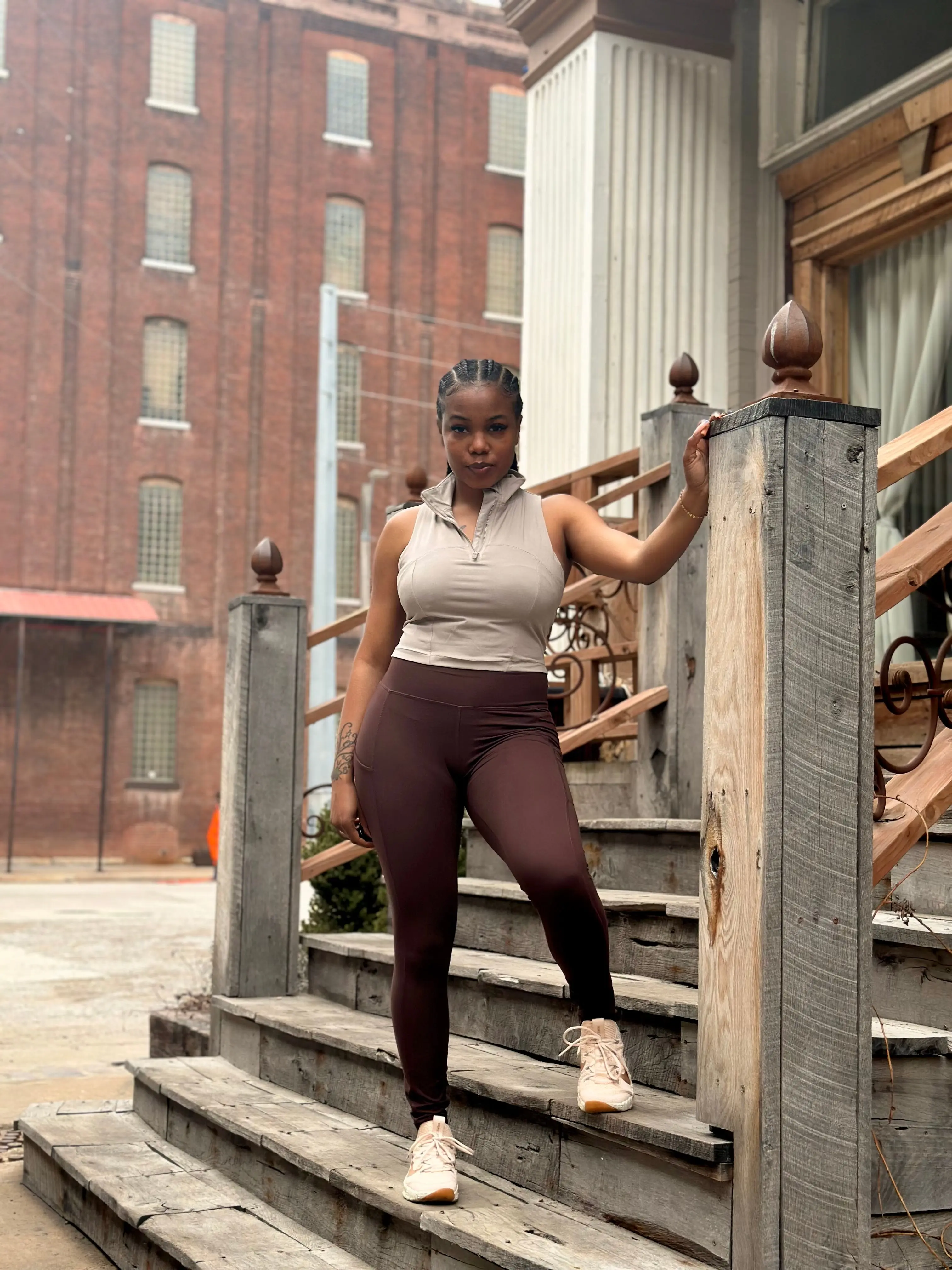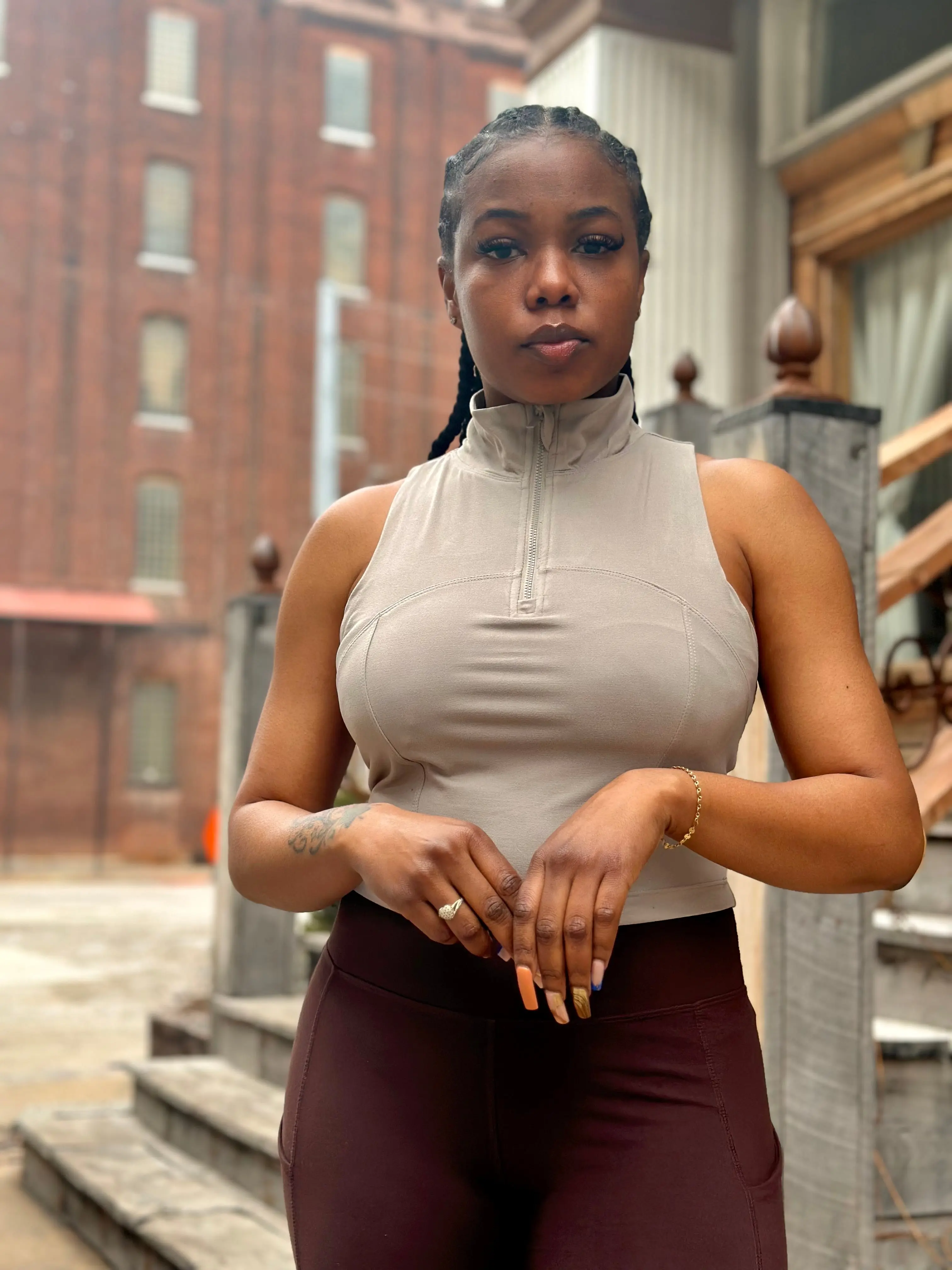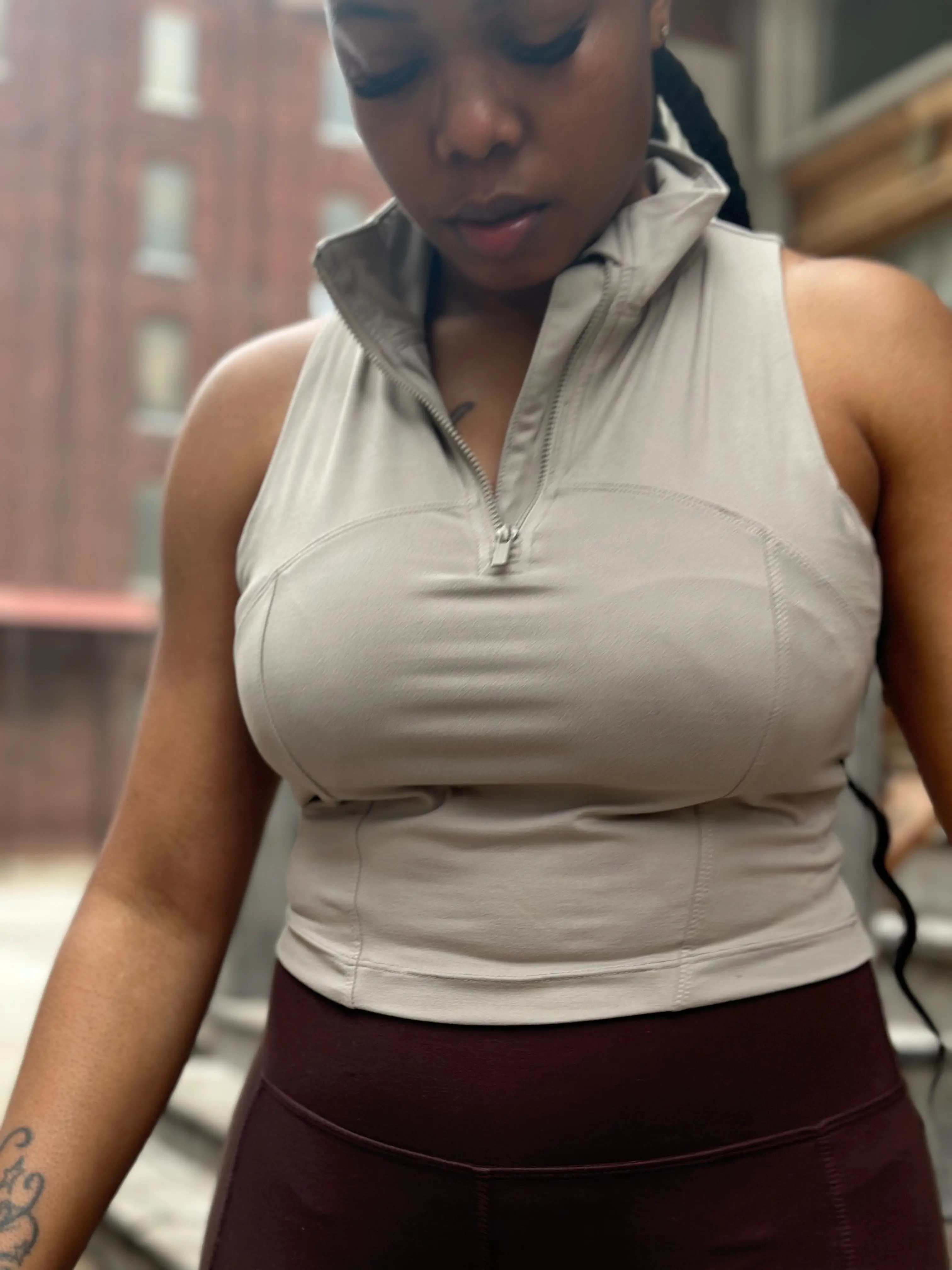 Buttery soft, mock neck crop sports tank with a half zip up closure.