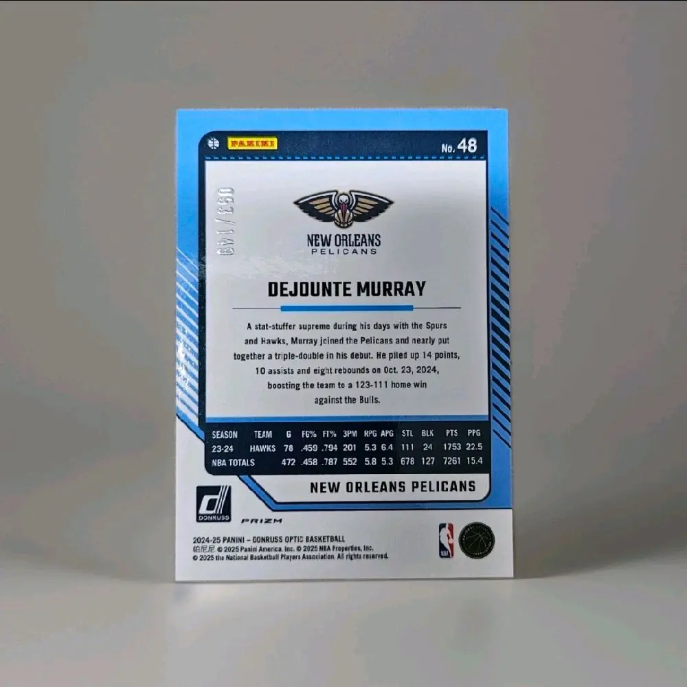 Discover the Dejounte Murray Optic Card, a must-have for basketball enthusiasts. This trading card features the New Orleans Pelicans player, Dejounte Murray. Limited to just 149 copies, it's a rare find for collectors. The card is part of the Red Wave series, adding a unique touch to your collection. Perfect for fans and collectors alike, this card is a valuable addition to any basketball memorabilia.