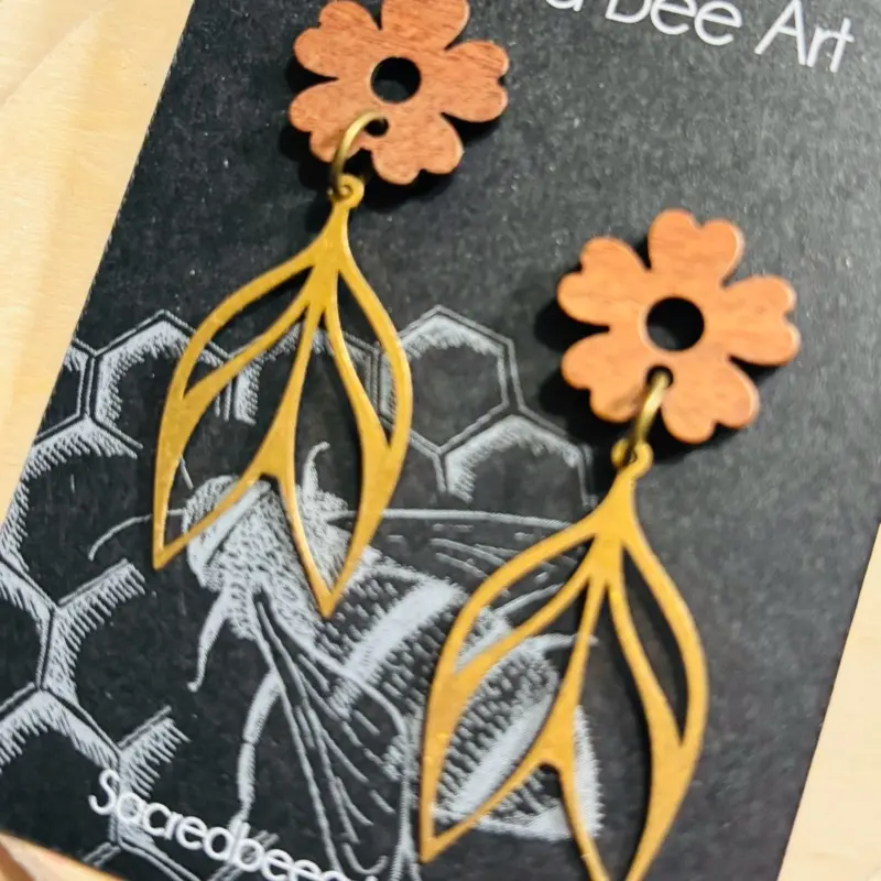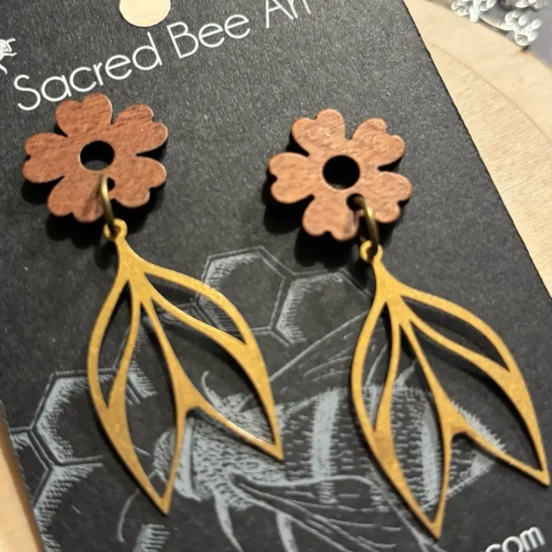 Sacred Bee Art Wood and Petal Earrings with Leaf Design and Brown Flower Detail