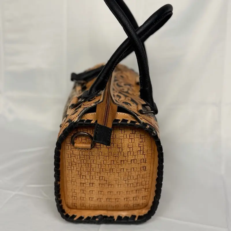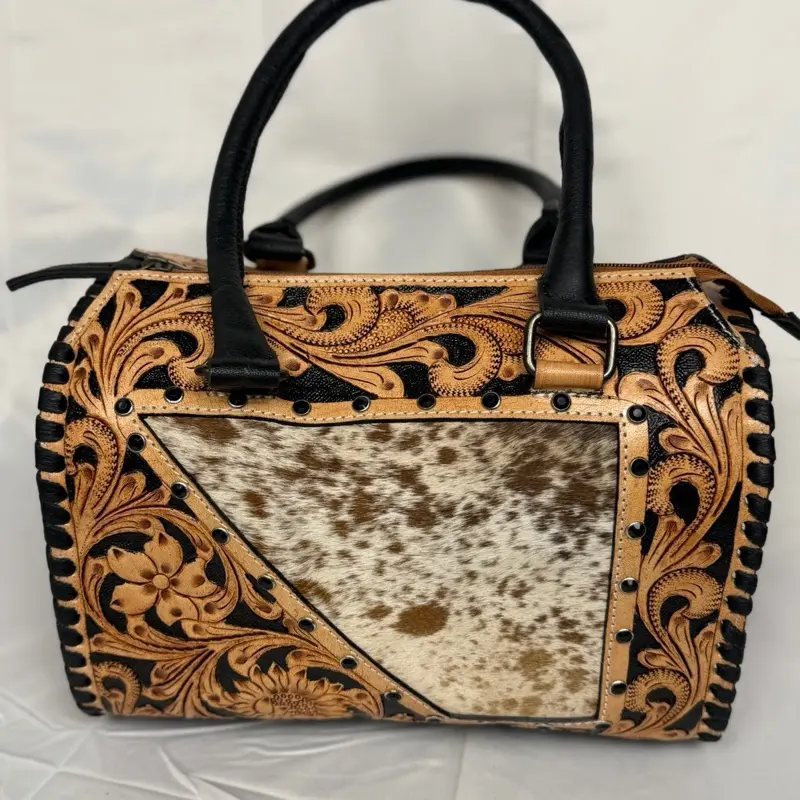 Make a bold western statement with this stunning handcrafted-style cowhide handbag. Featuring beautifully detailed tan and black tooled leather with intricate floral carving, this bag is perfectly paired with a genuine cowhide center panel for that authentic western flair.