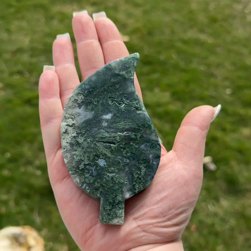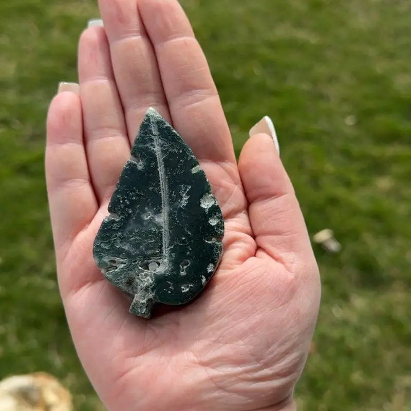 Bring the beauty of nature into your space with this stunning hand-carved moss agate leaf. Each piece features unique, moss-like inclusions that resemble tiny forests, vines, or drifting greenery suspended within the stone—no two are ever alike.