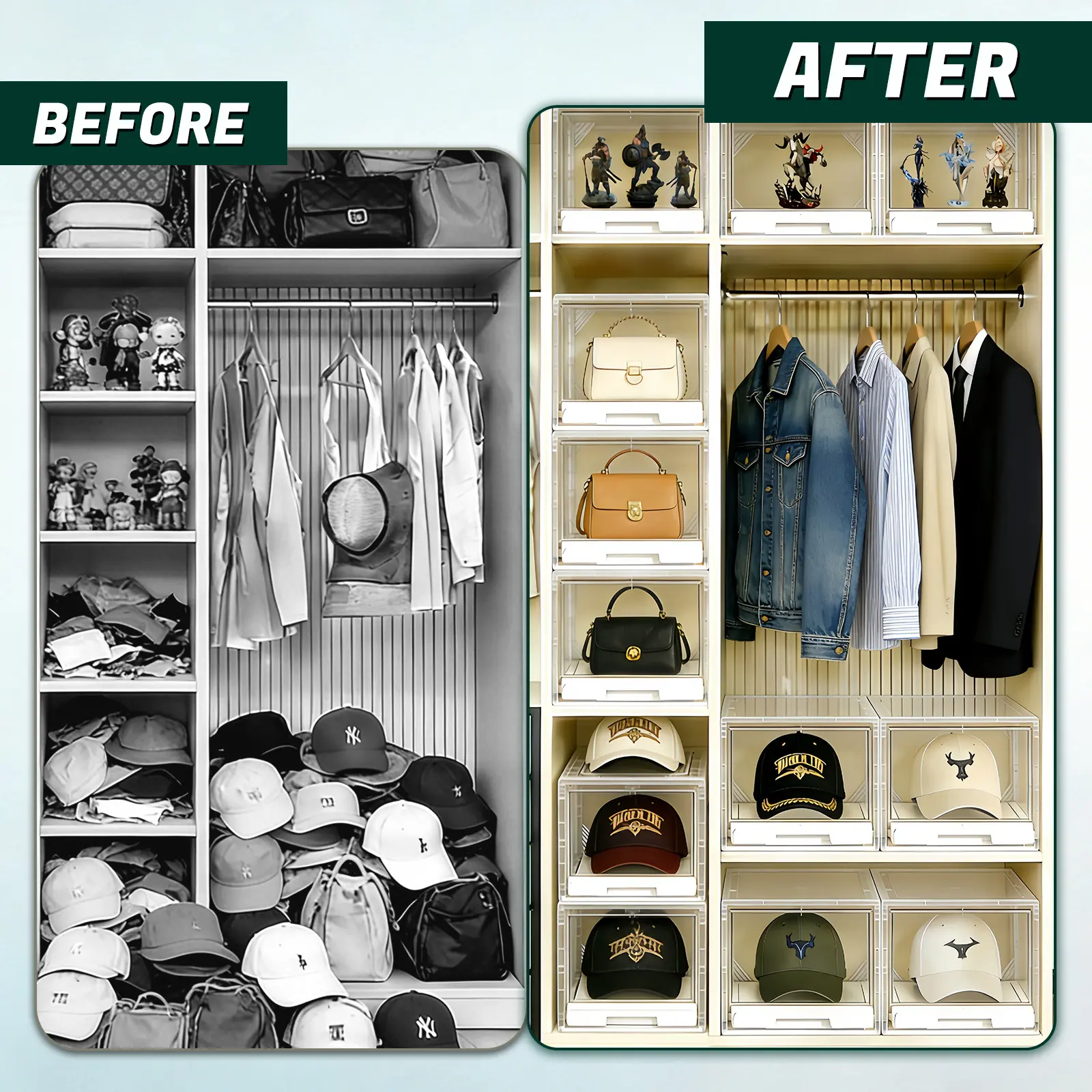 This oneTransparent sliding baseball cap storage boxPerfect balance between storage and display—give each hat you love a dedicated home!