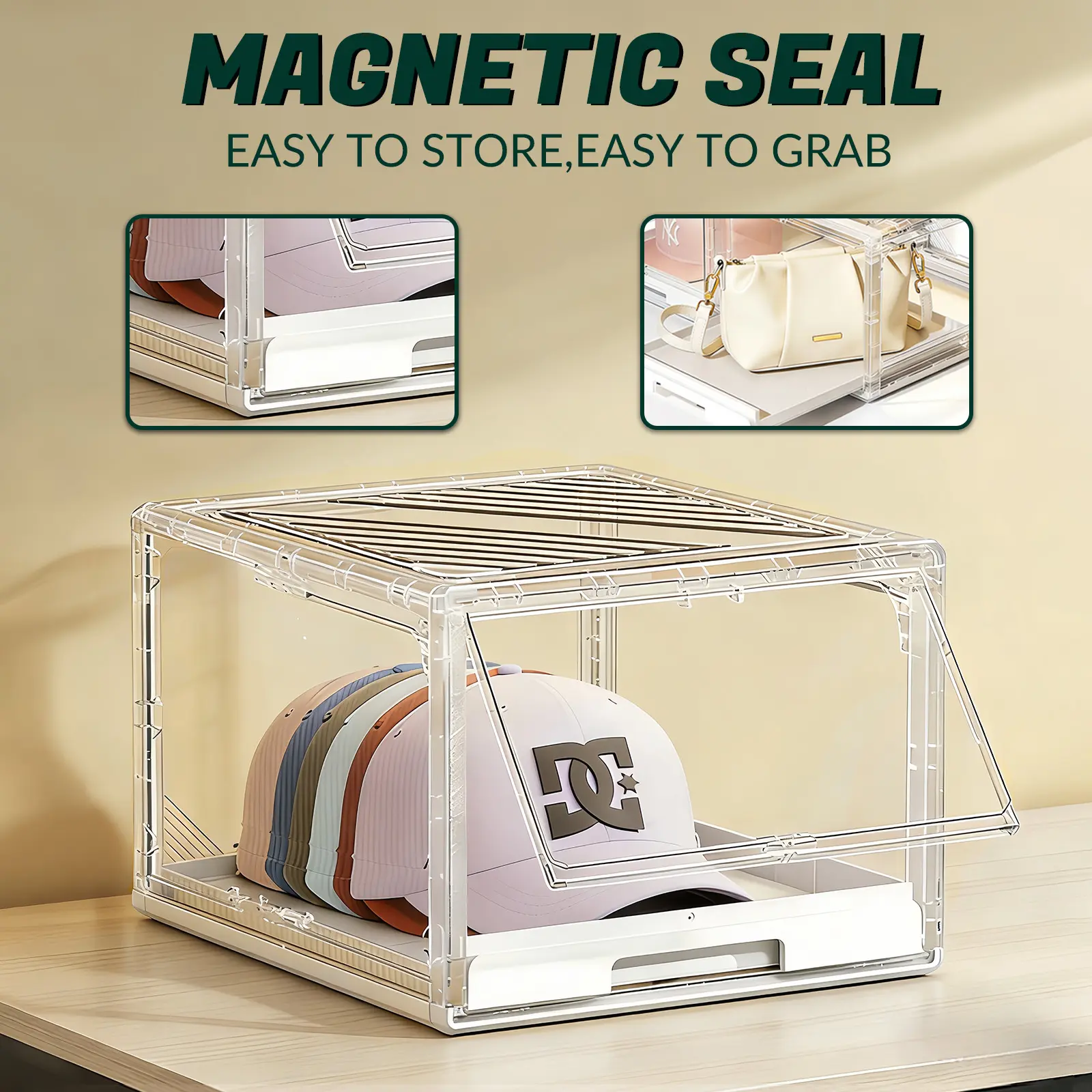 Spacious internal space that perfectly fits most cap styles—baseball caps, snapbacks, flat-brim caps, trucker hats, bucket hats—and more. A single box can easily hold 3–5 regular baseball caps (slight variations depending on cap style), making it easy to store all your caps in one place and say goodbye to a cluttered desk or wardrobe!