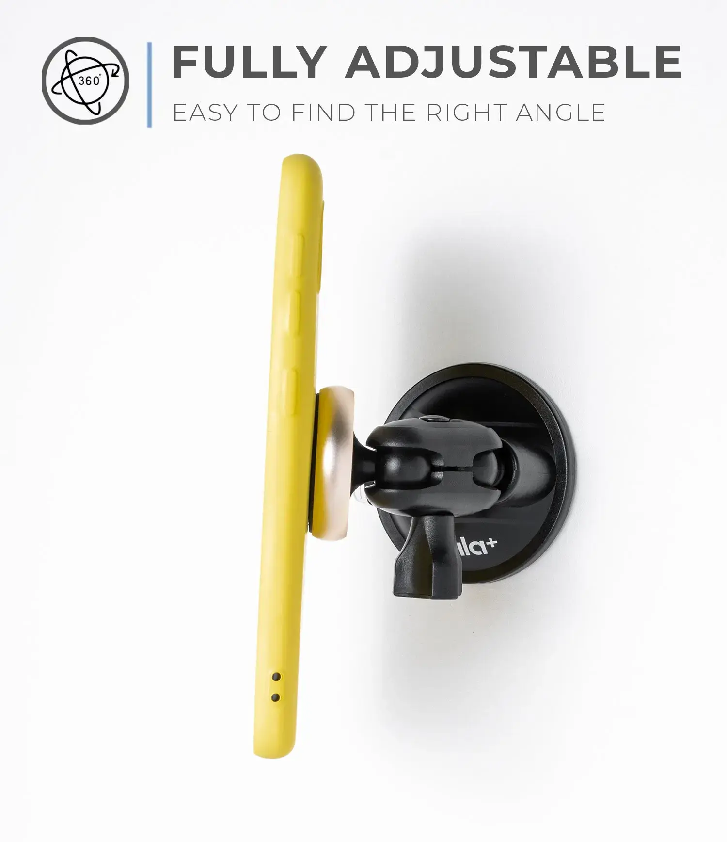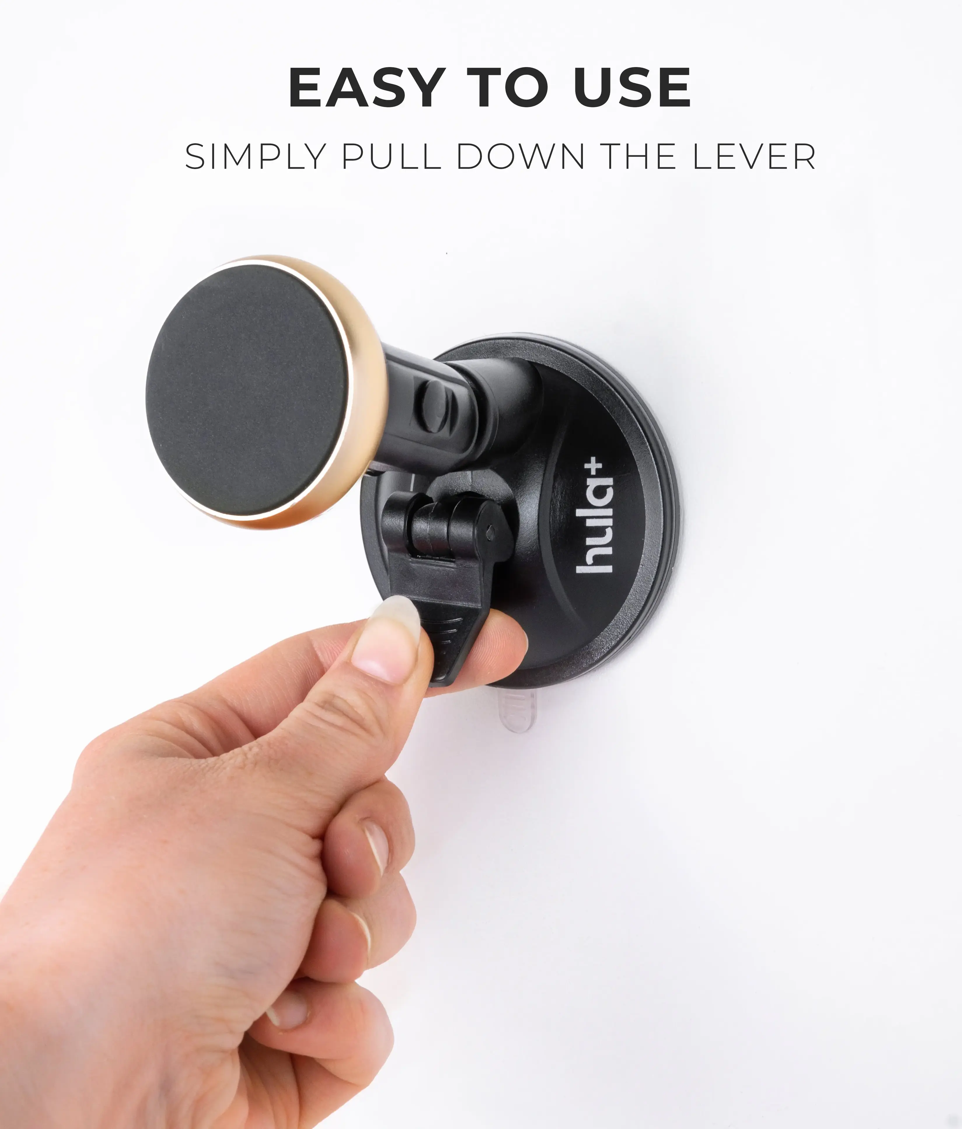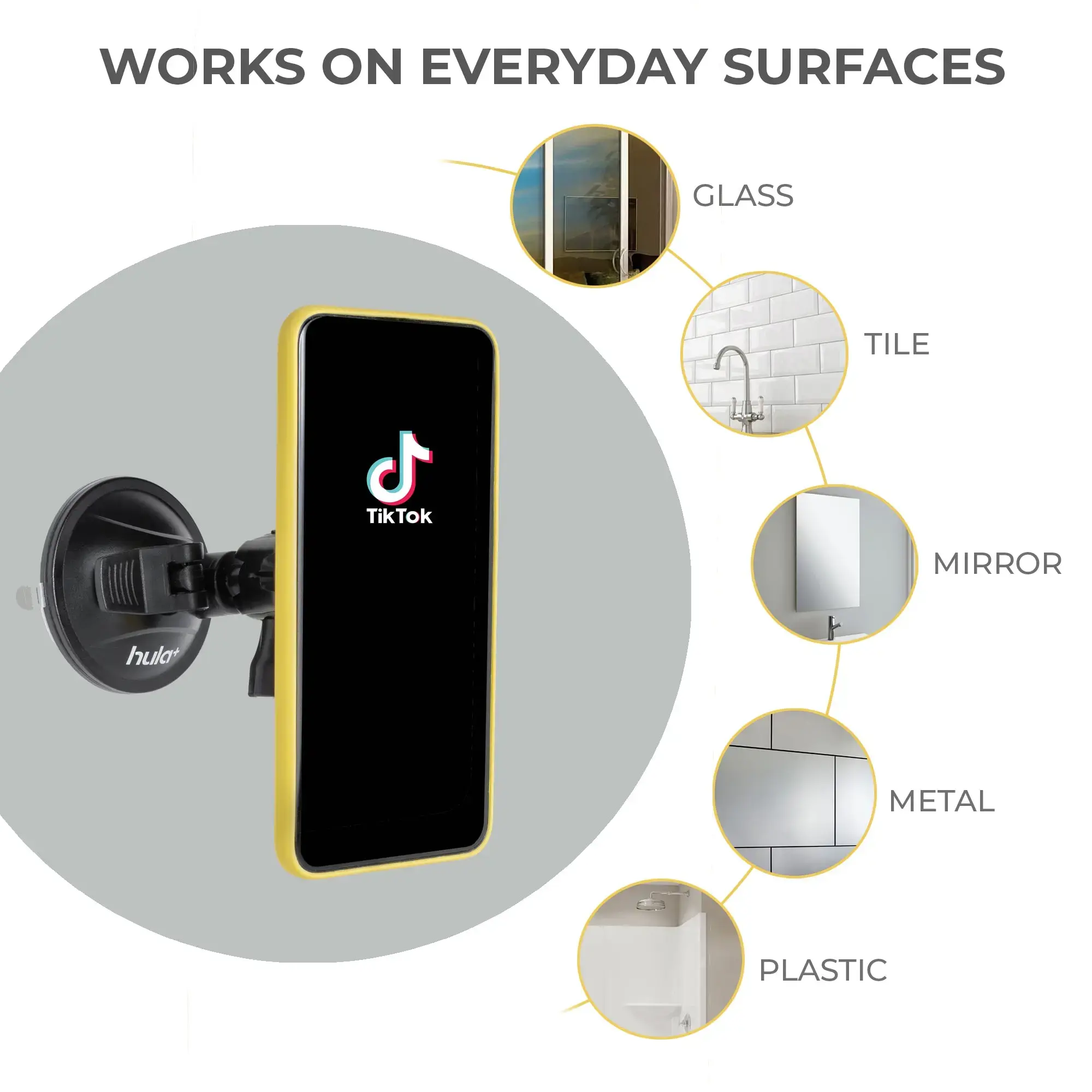 ·EASY TO PLACE: Our strong suction cup works on everyday surfaces including plastic, acrylic, glass, metal, porcelain, finished tile/wood, and more. The six magnets in the hula+ hold firmly onto your phone, which you can place both horizontally and vertically.