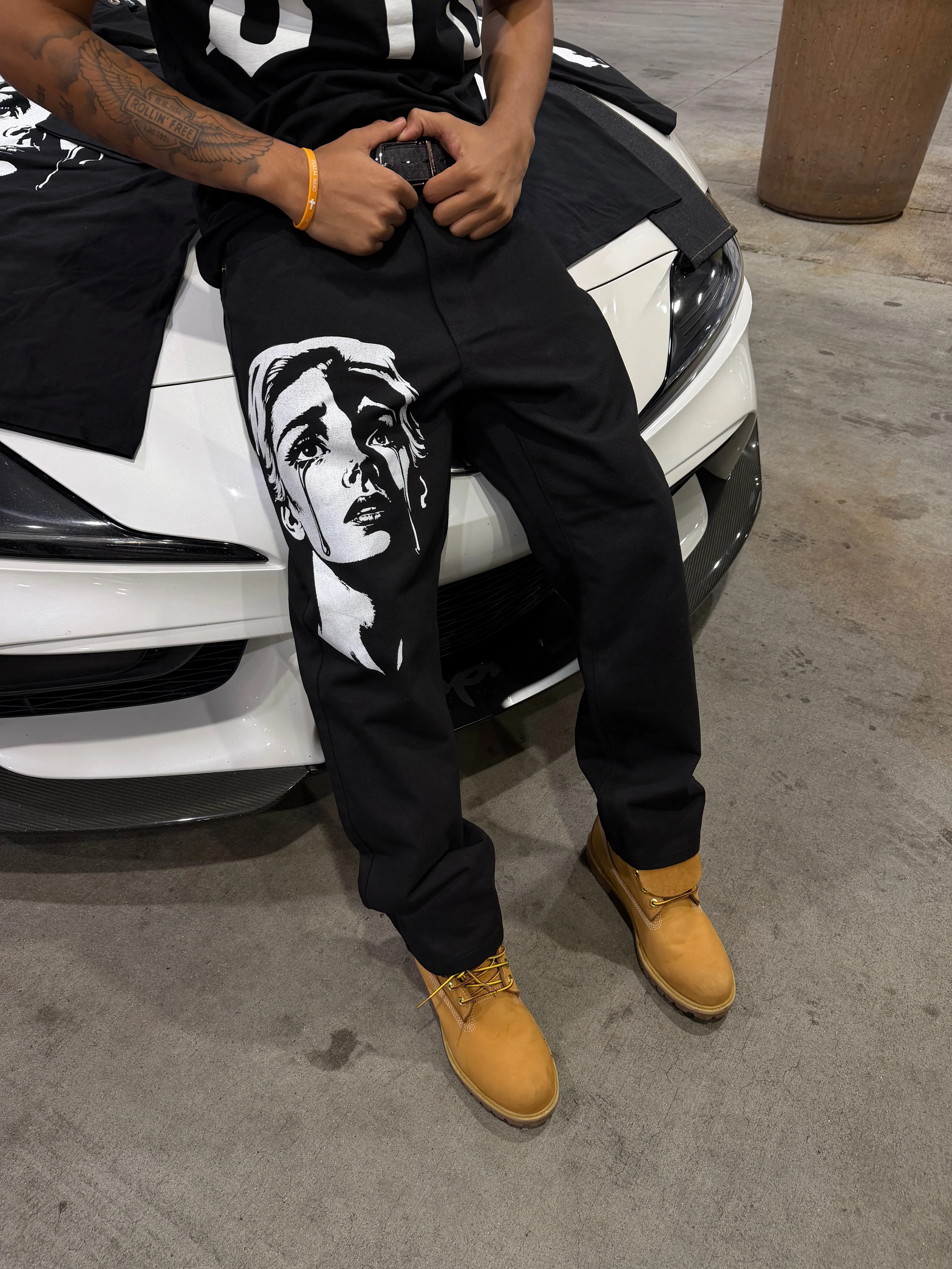 These black jeans are cut from premium heavyweight, non-stretch 100% cotton denim — structured, durable, and built to hold its shape. A bold oversized crying face graphic dominates the thigh, turning the silhouette into a moving canvas.