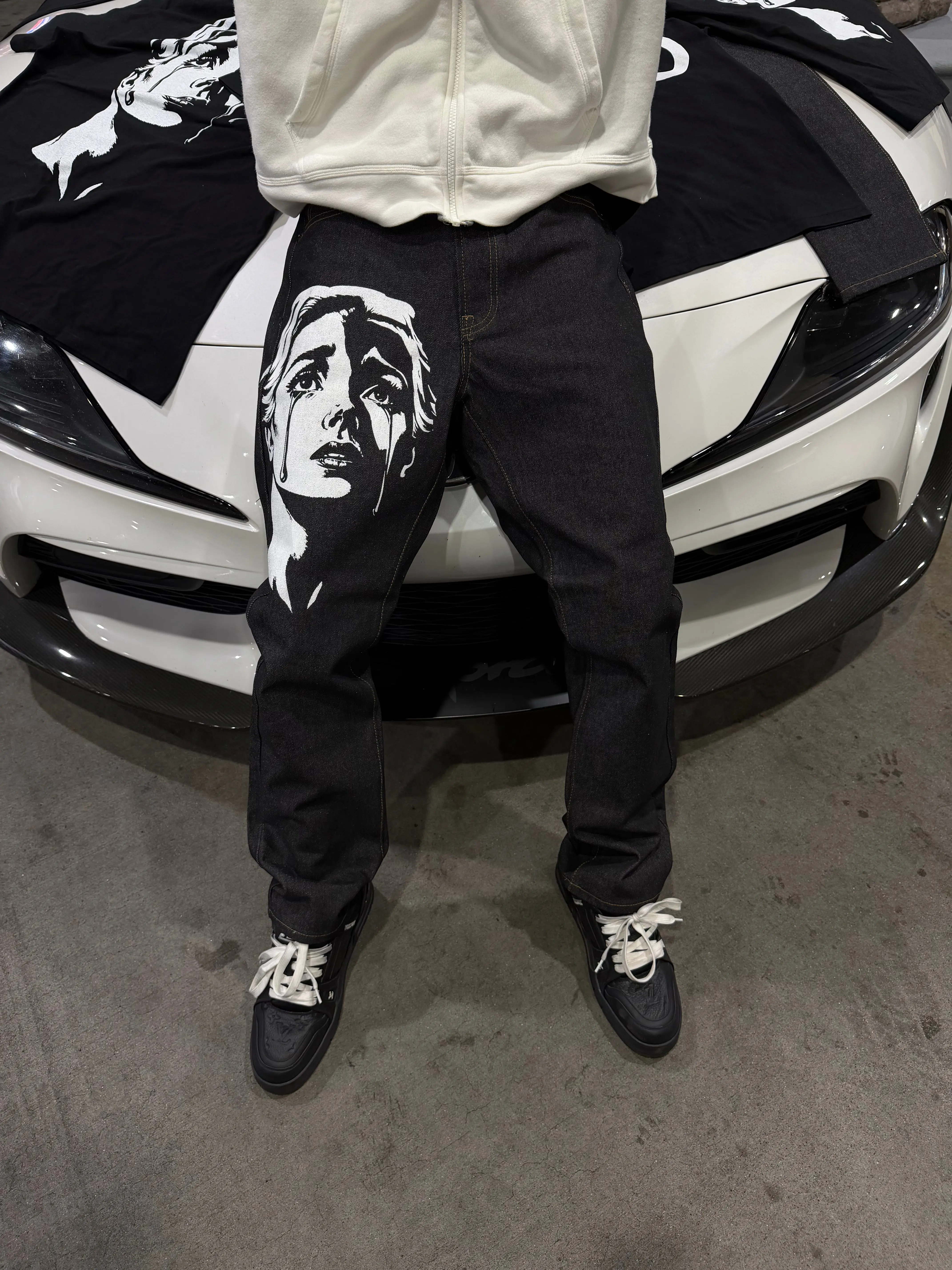 These black jeans are cut from premium heavyweight, non-stretch 100% cotton denim — structured, durable, and built to hold its shape. A bold oversized crying face graphic dominates the thigh, turning the silhouette into a moving canvas.