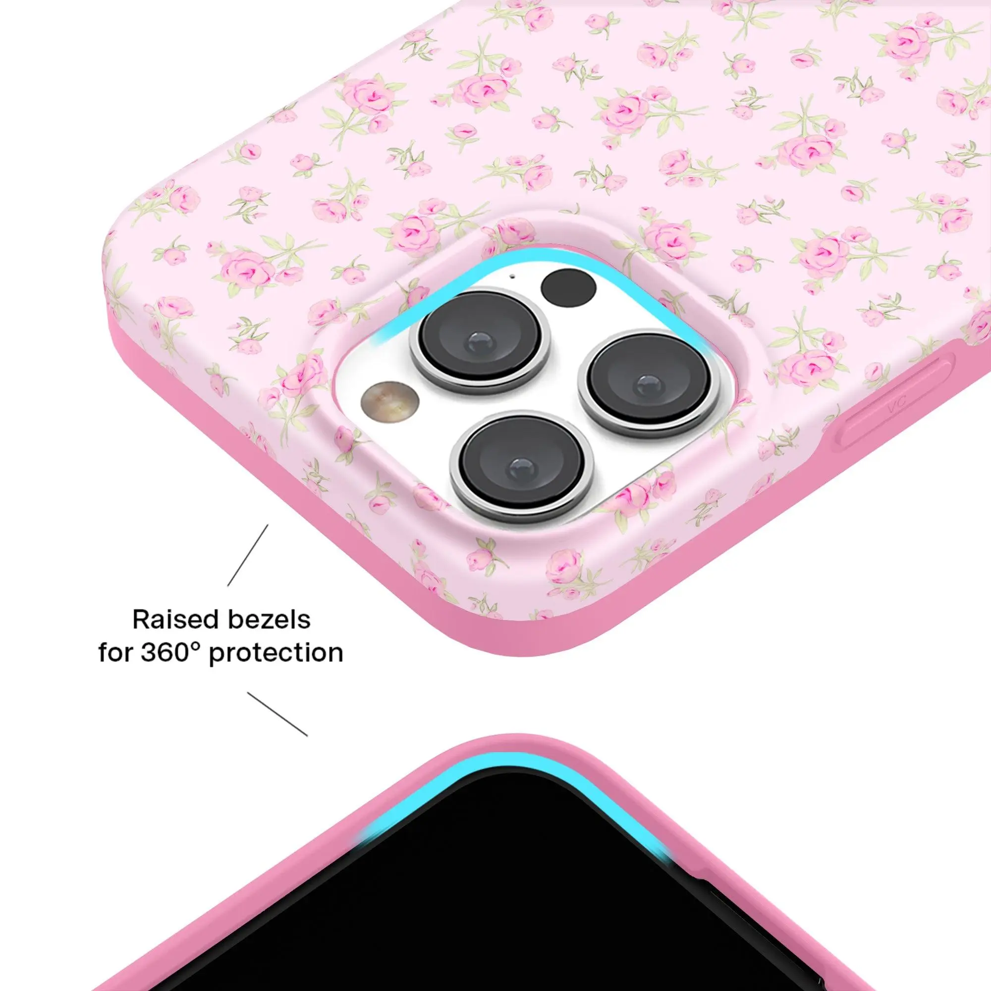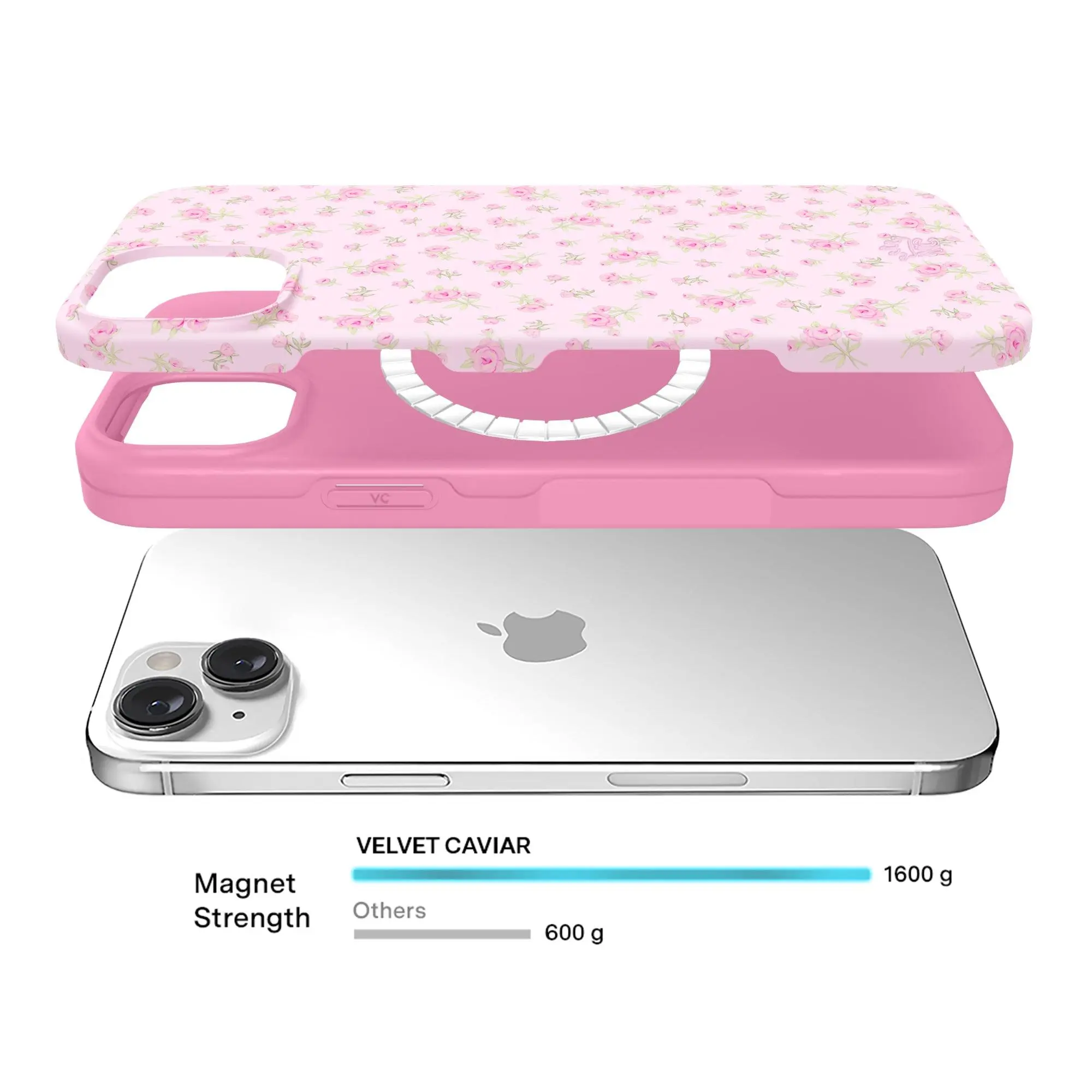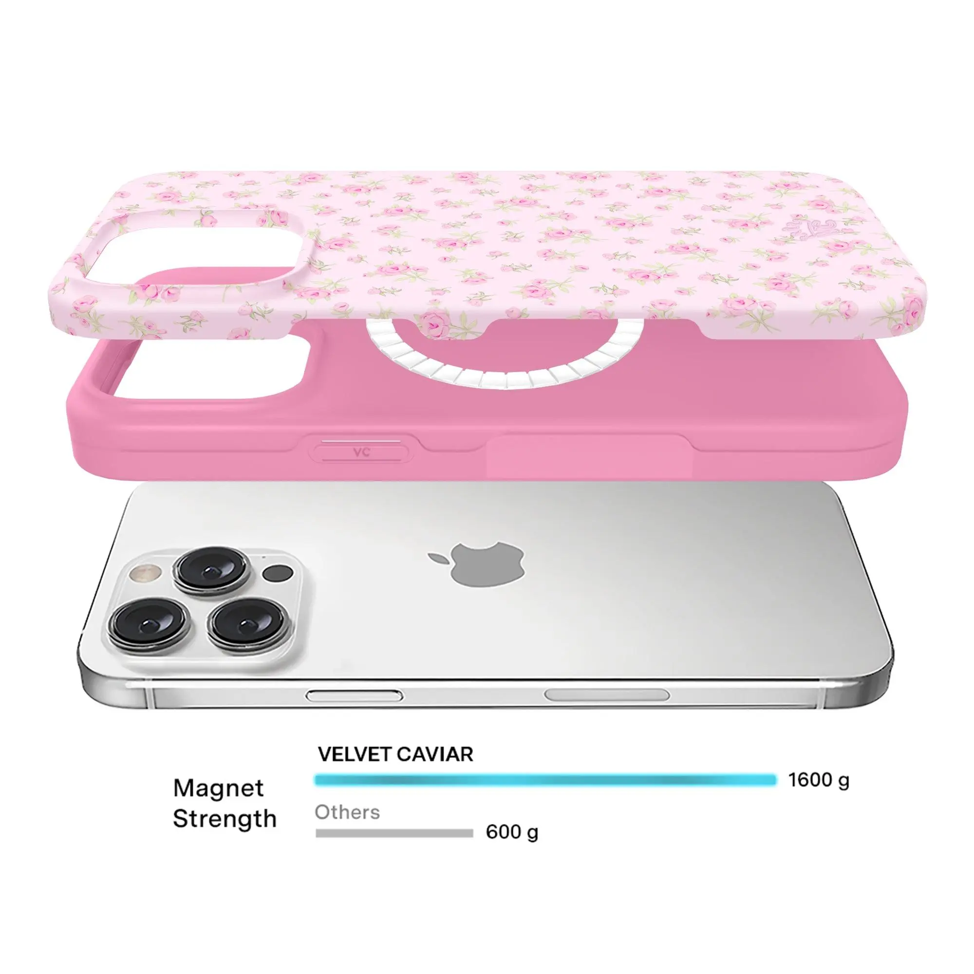 Dare to dream! Keep your head in the clouds with this beautiful MagSafe case featuring an array of dainty pink florals on a pale pink base with a medium pink bumper.