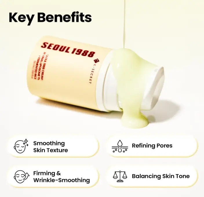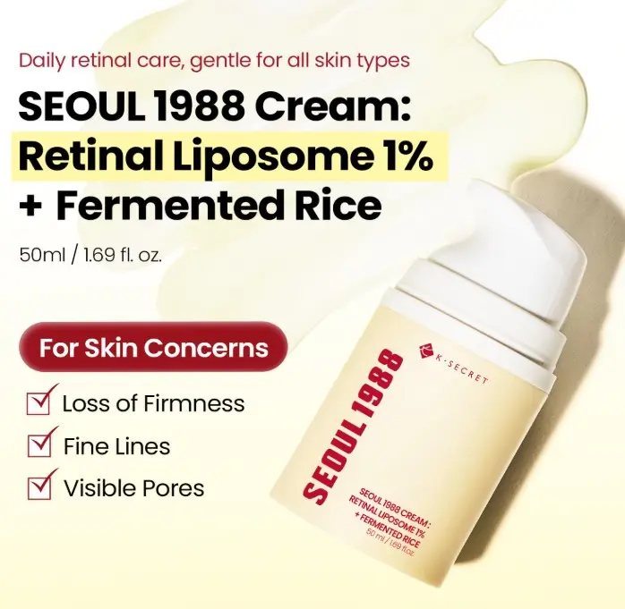 K-Secret SEOUL 1988 Cream: Retinal Liposome 1% + Fermented Rice, is an anti-aging facial moisturizer designed to improve skin texture and reduce fine lines with minimal irritation.