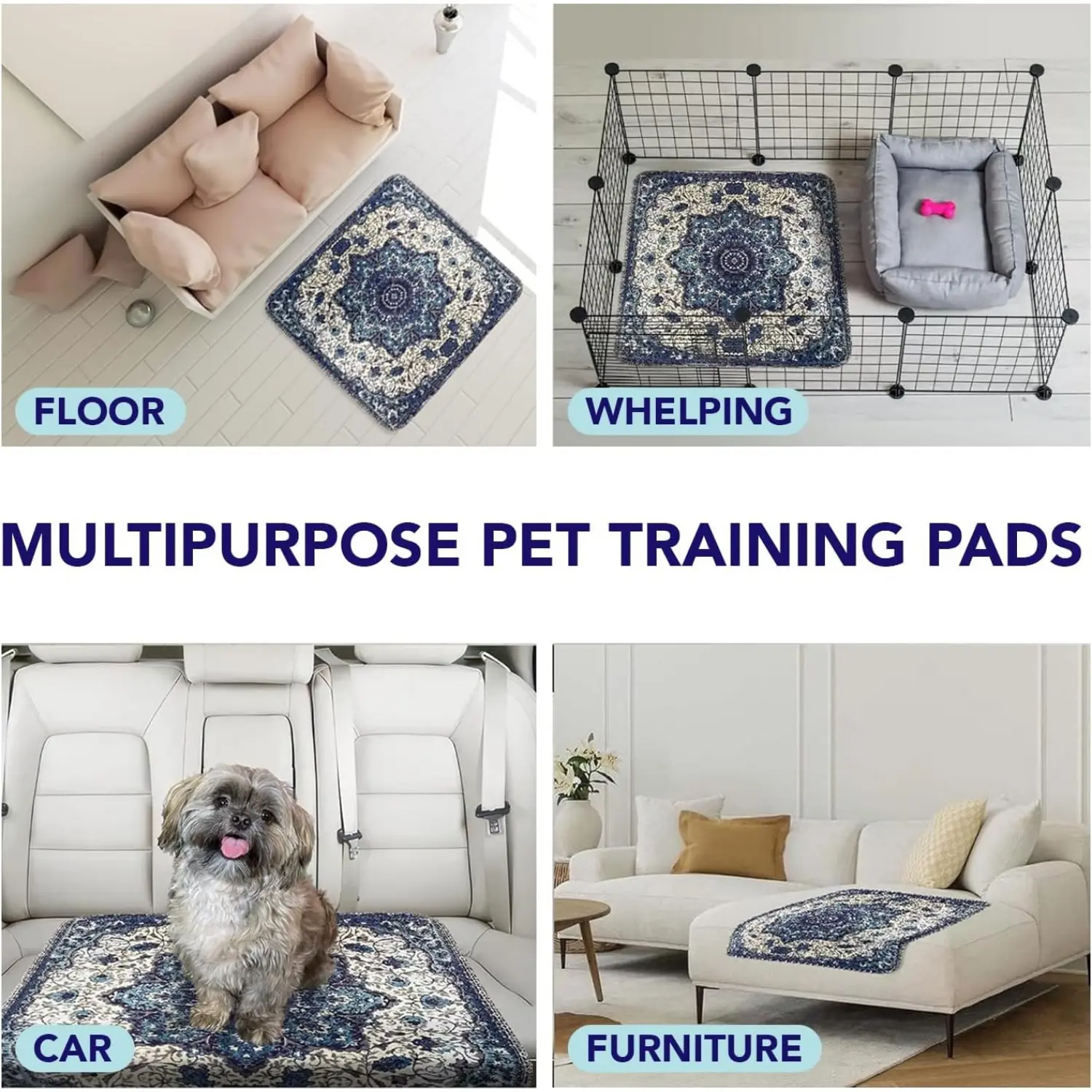 ·Versatile Pet Mat for Crates, Playpens, and Floors - These multi-functional washable dog pee pads double as a comfortable mat for crates, playpens, or floor use. The soft, quilted surface provides a cozy resting spot for your pet, while the waterproof and leak-proof design protects your floors and furniture from accidents, spills, and pet hair. Perfect for travel, outdoor use, or as a designated pet area in your home, these versatile mats are a must-have for every pet owner.